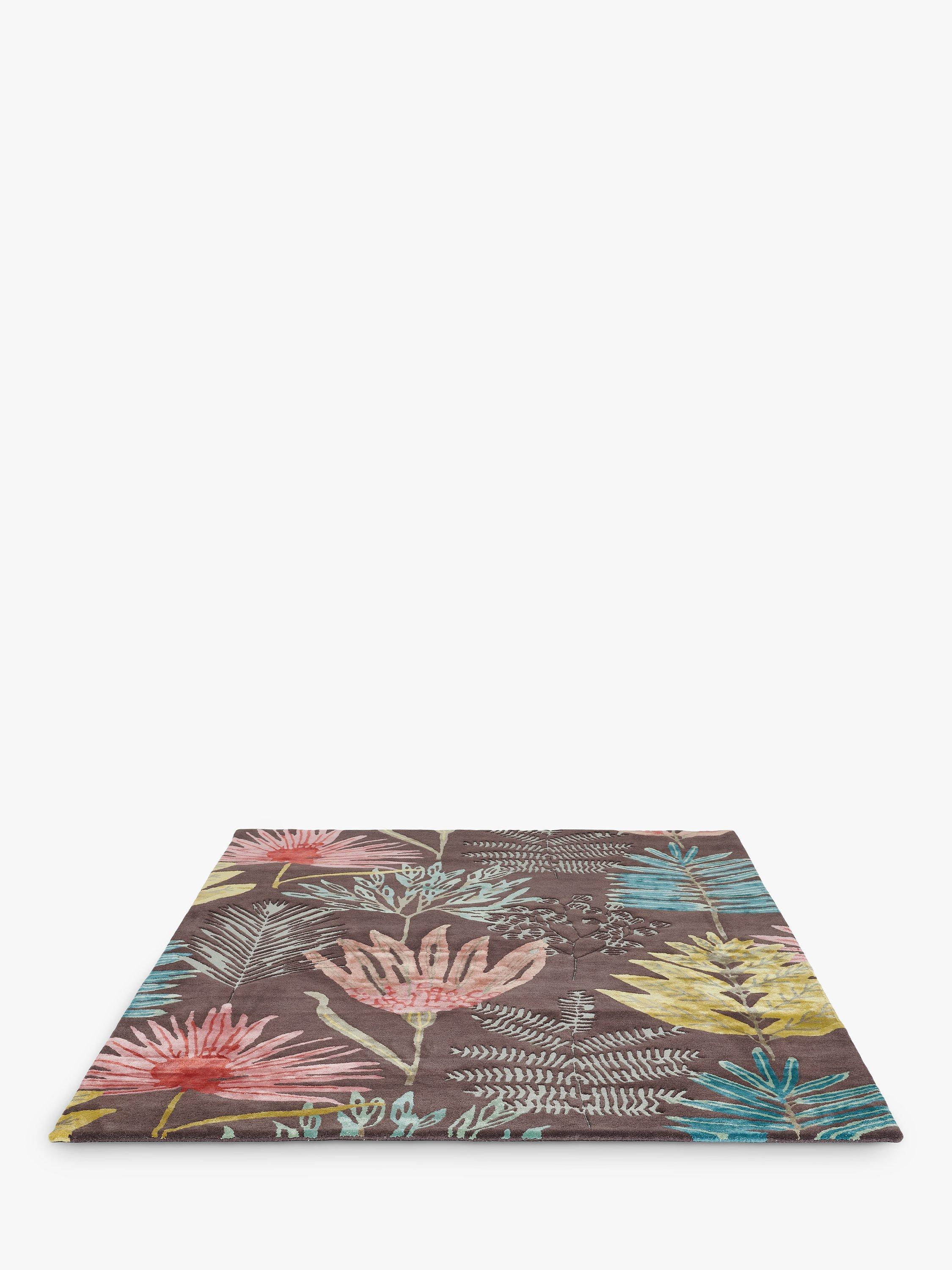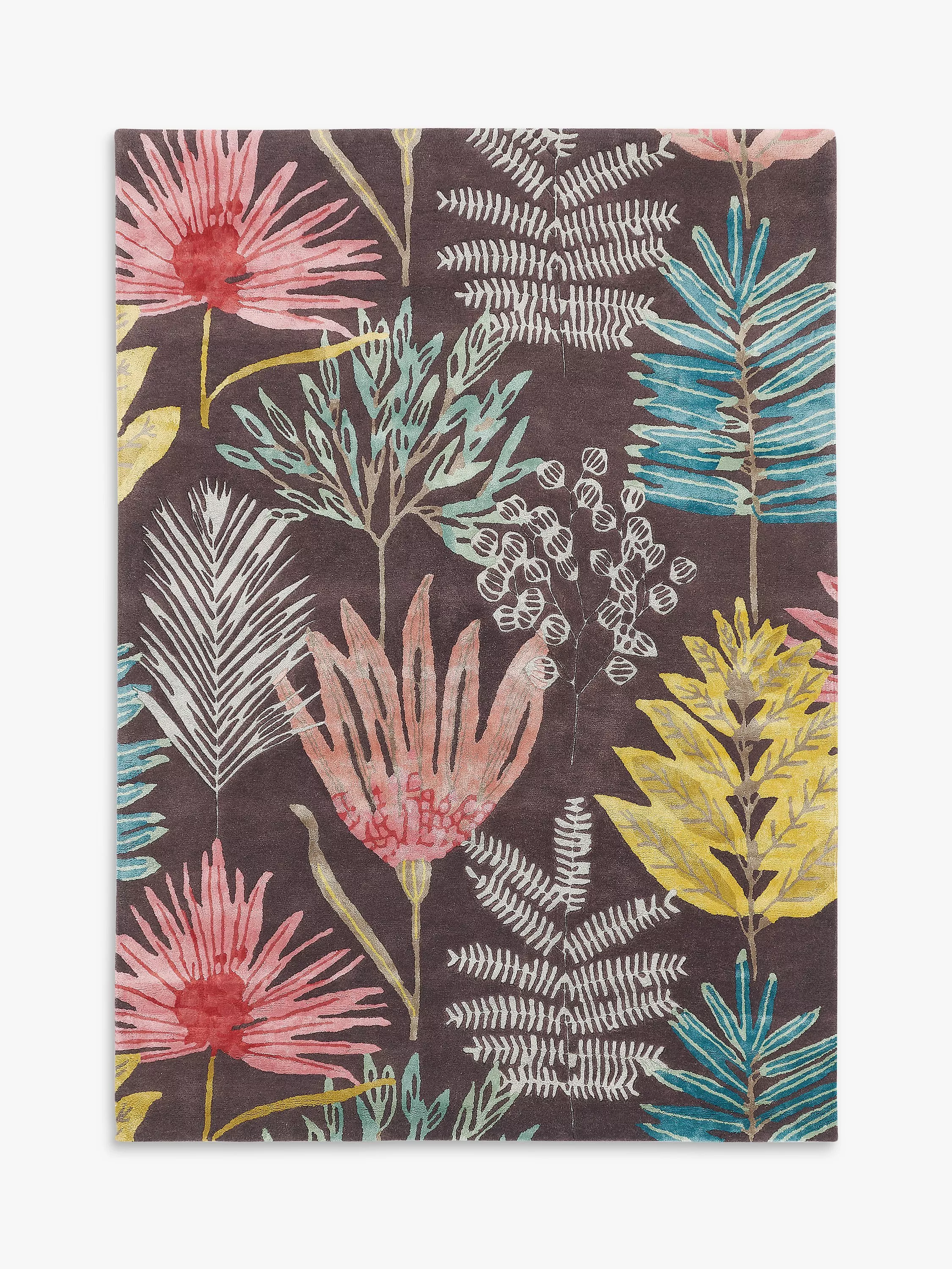 Upward pointing foliage motifs overlap on this energetic hand tufted rug, combining inkily-drawn leaves and painted fronds infused with pops of colour.
