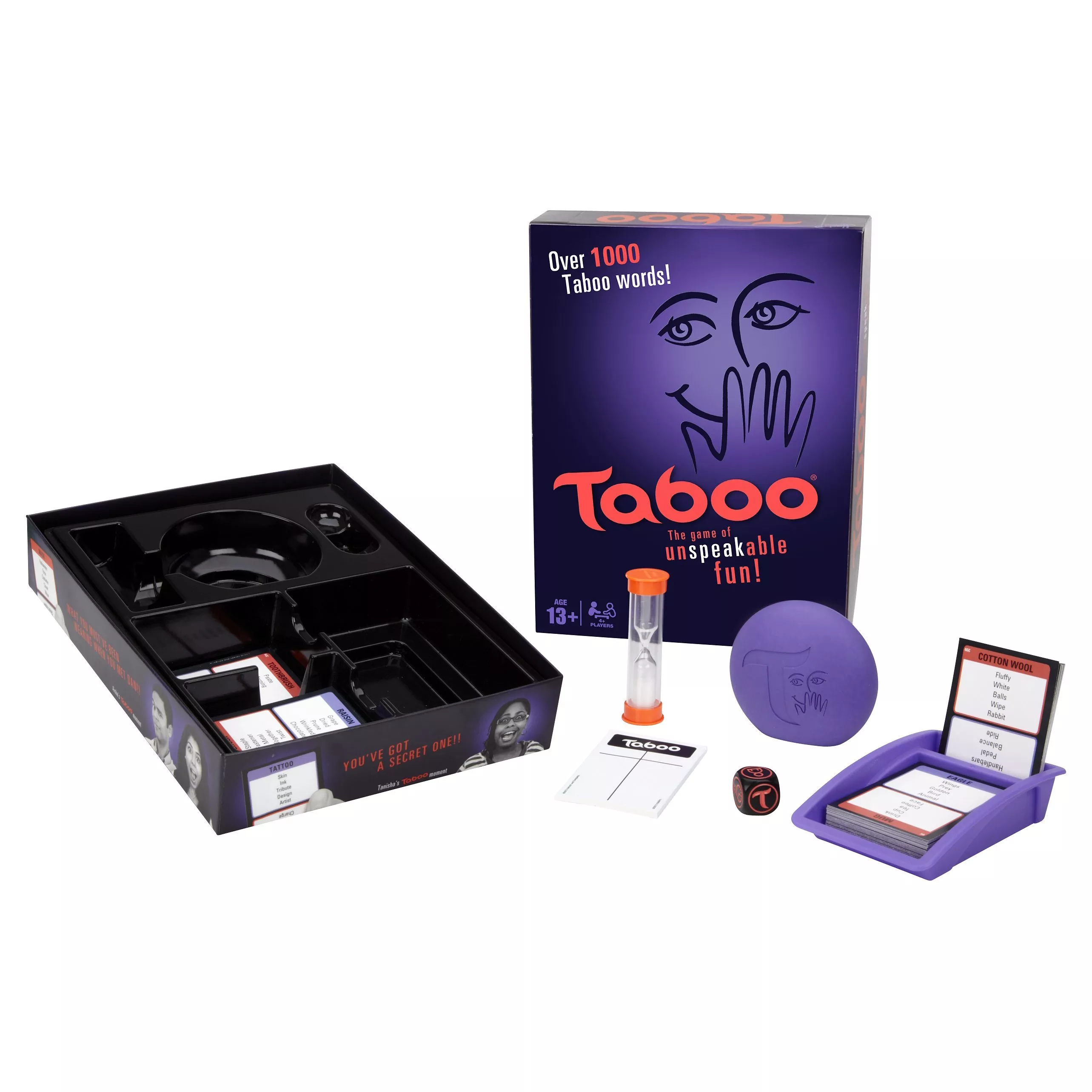 Taboo is the game of unspeakable fun! When you play, the obvious clues are strictly taboo. You have to give creative, carefully-worded clues to get your team to guess words fast. But don't mention unmentionables, or you'll get the squeaker and lose the point. Once you've mastered the classic game, you can use the game-changer die to mix it up. If it lands on 'One Guesser', only one teammate can guess on your turn. With 4 other possibilities on the die, you'd better be shrewd, quick-thinking and willing to take some risks.