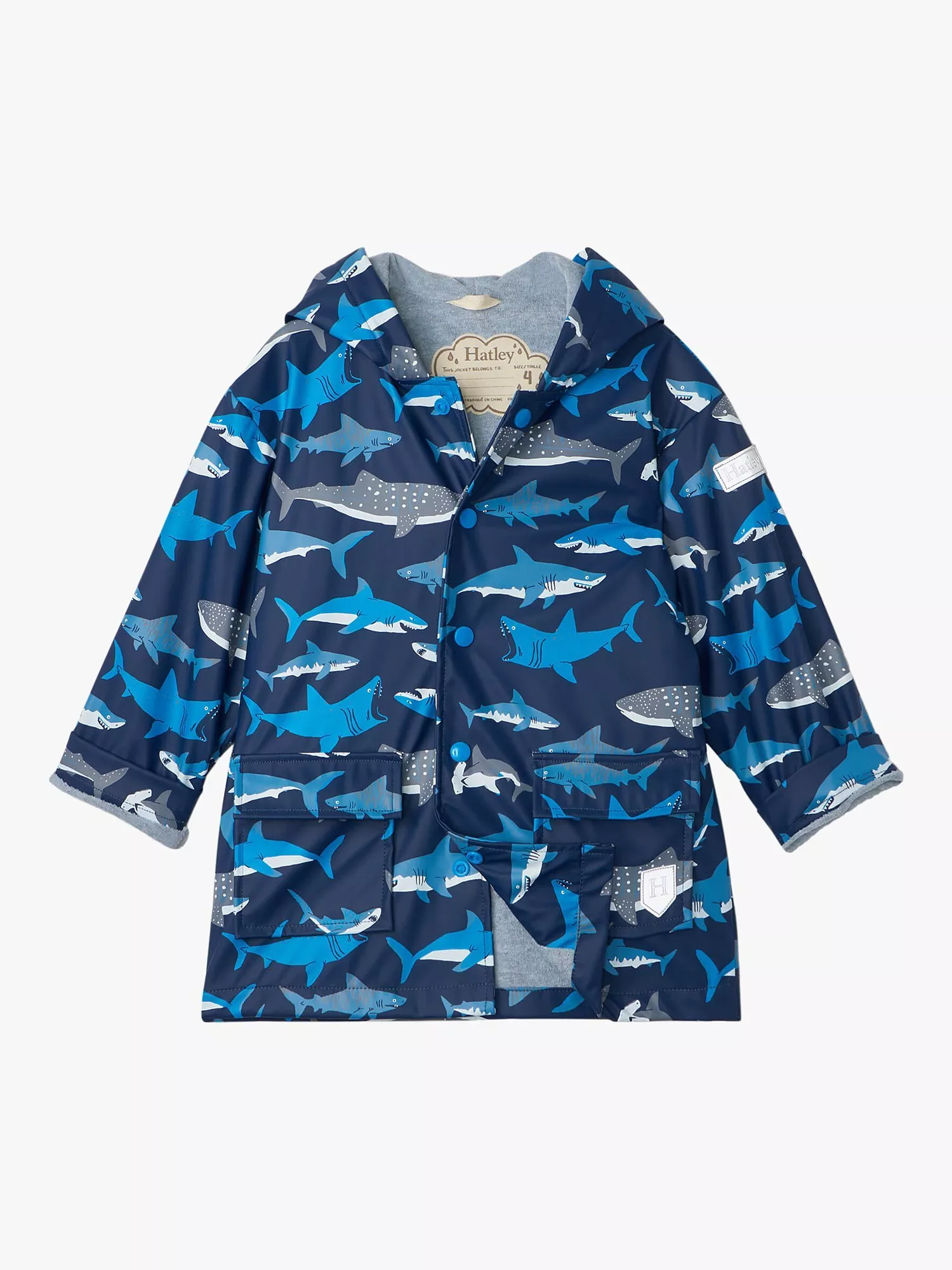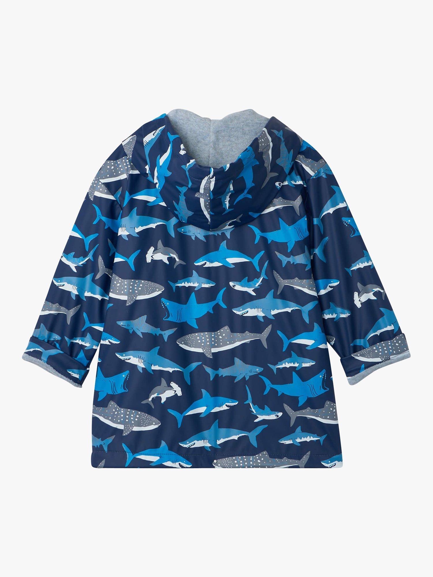 With a coated outer for keeping that pesky rain out, this fun raincoat comes with an all over shark print and is finished with two handy front patch pockets for keeping things safe.