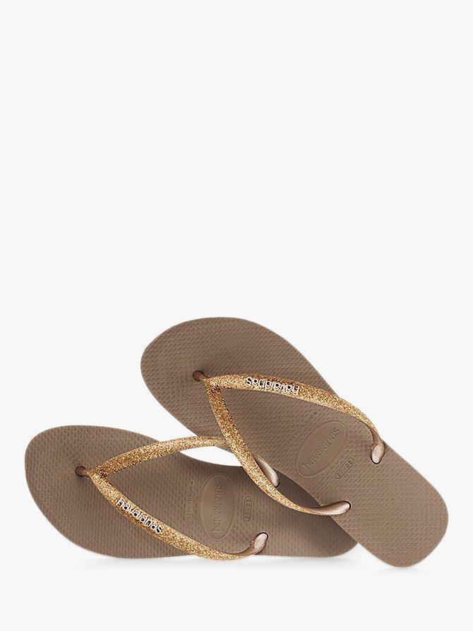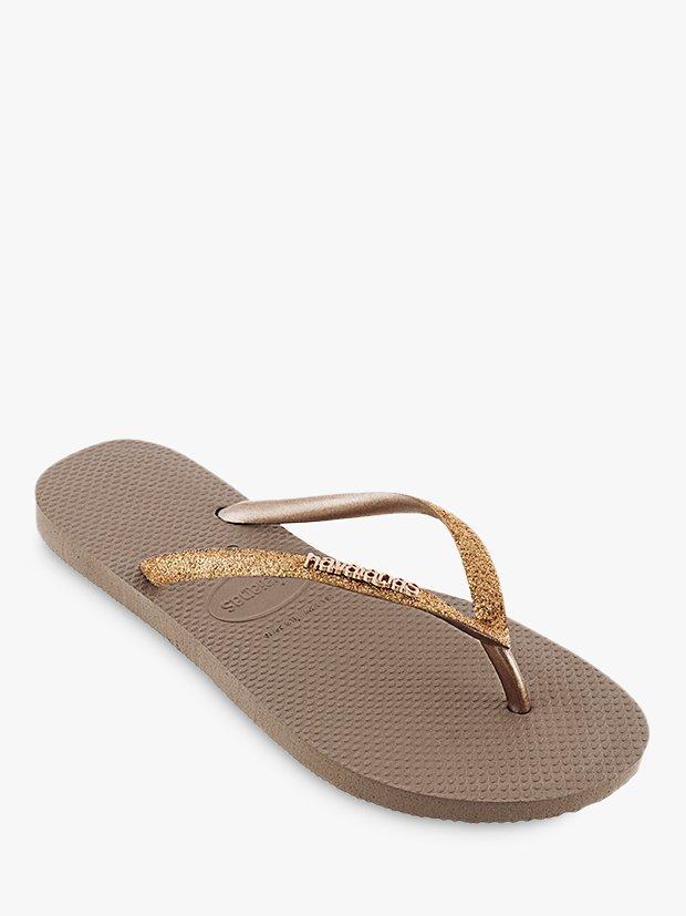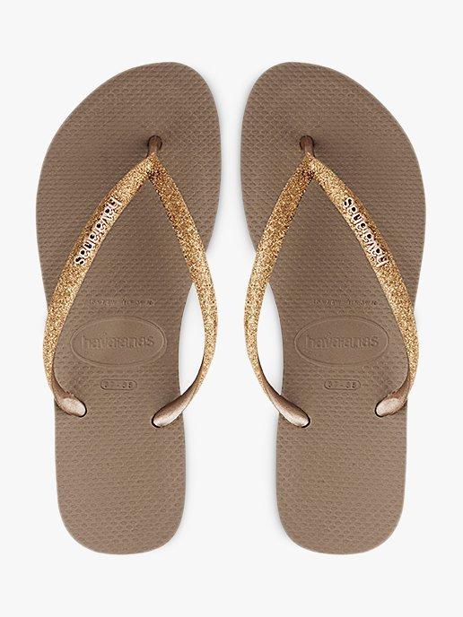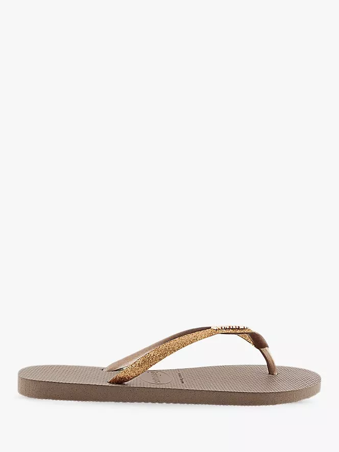 Opt for unprecedented comfort during the warmer months with these Slim Glitter Flip Flops from Havaianas. Designed with a slim fit, the classic slip-on style has sleek straps boasting a glitter pattern and a rice grain pattern on top of the sole.