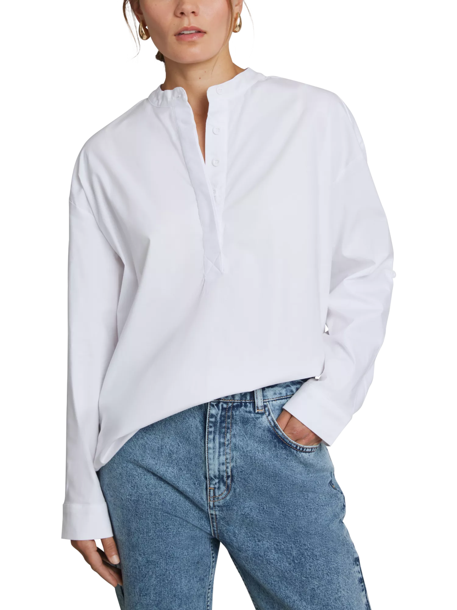 Introducing a refined twist on a timeless silhouette: the Tunic Shirt by Hay Life, crafted in premium poplin as part of our essential white shirt collection. This elegantly versatile piece is designed to be effortlessly pulled on overhead, with sleeves adjustable to three different lengths, allowing you to tailor your look to your personal style. Experience the embodiment of Hay Life's commitment to versatile design and sophisticated simplicity.