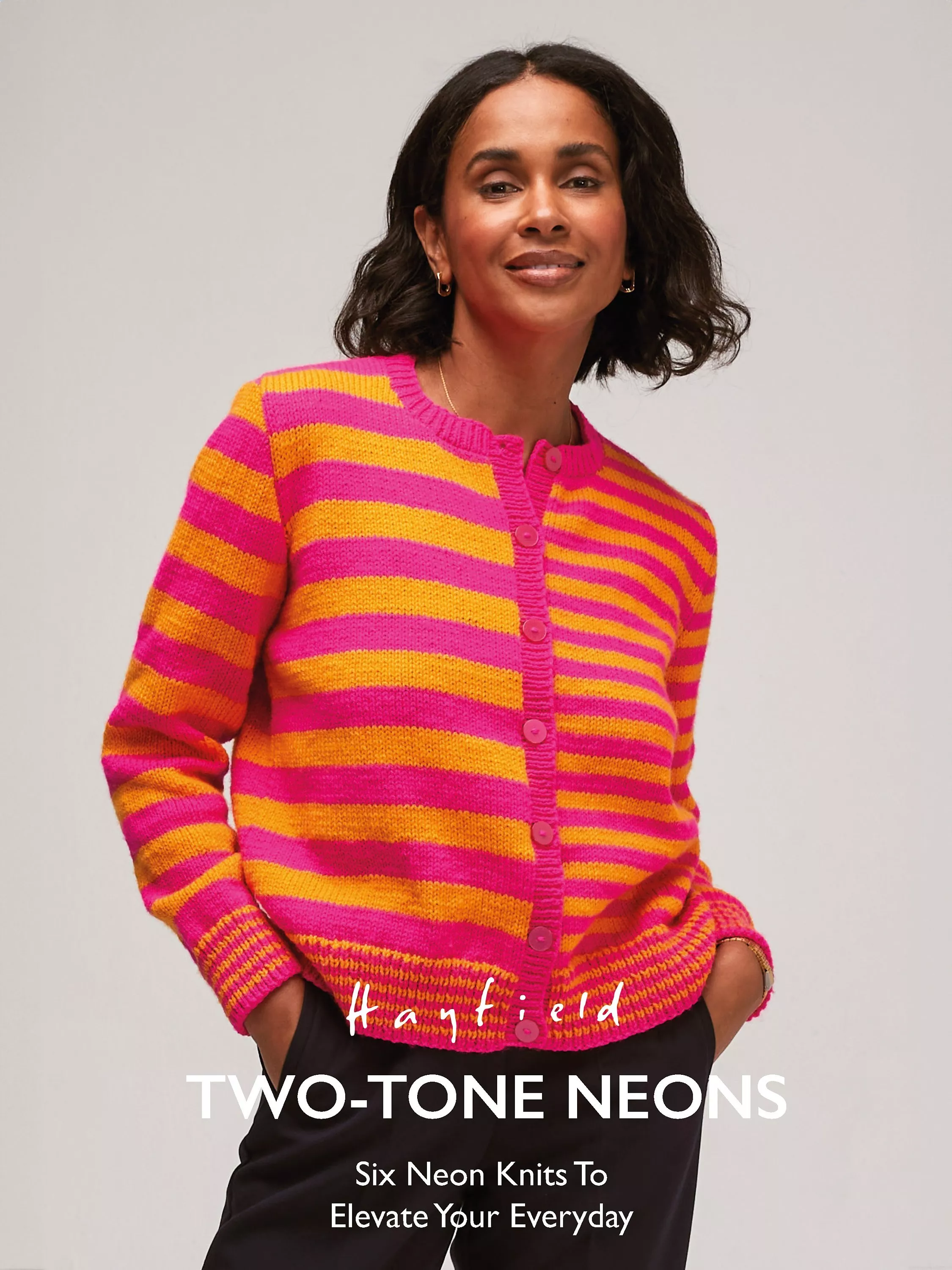 The stylish knitting patterns in Hayfields' Two-Tone Neons pair neon brights with classic shades in affordable Hayfield Bonus DK yarn to add a joyful burst of colour to everyday knitwear.