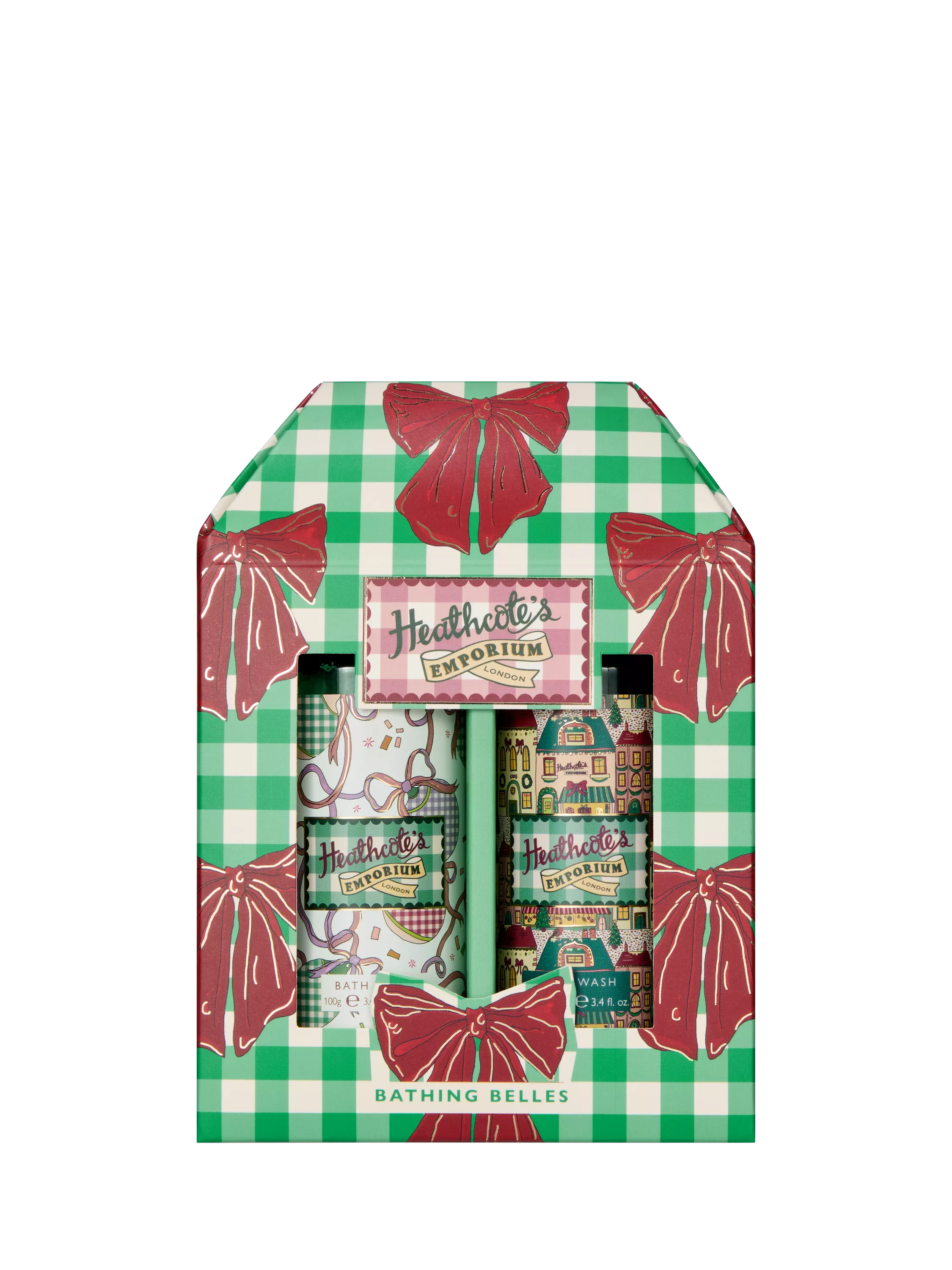 Two bathing belles in a jolly carton illustrated with festive gingham and bows.