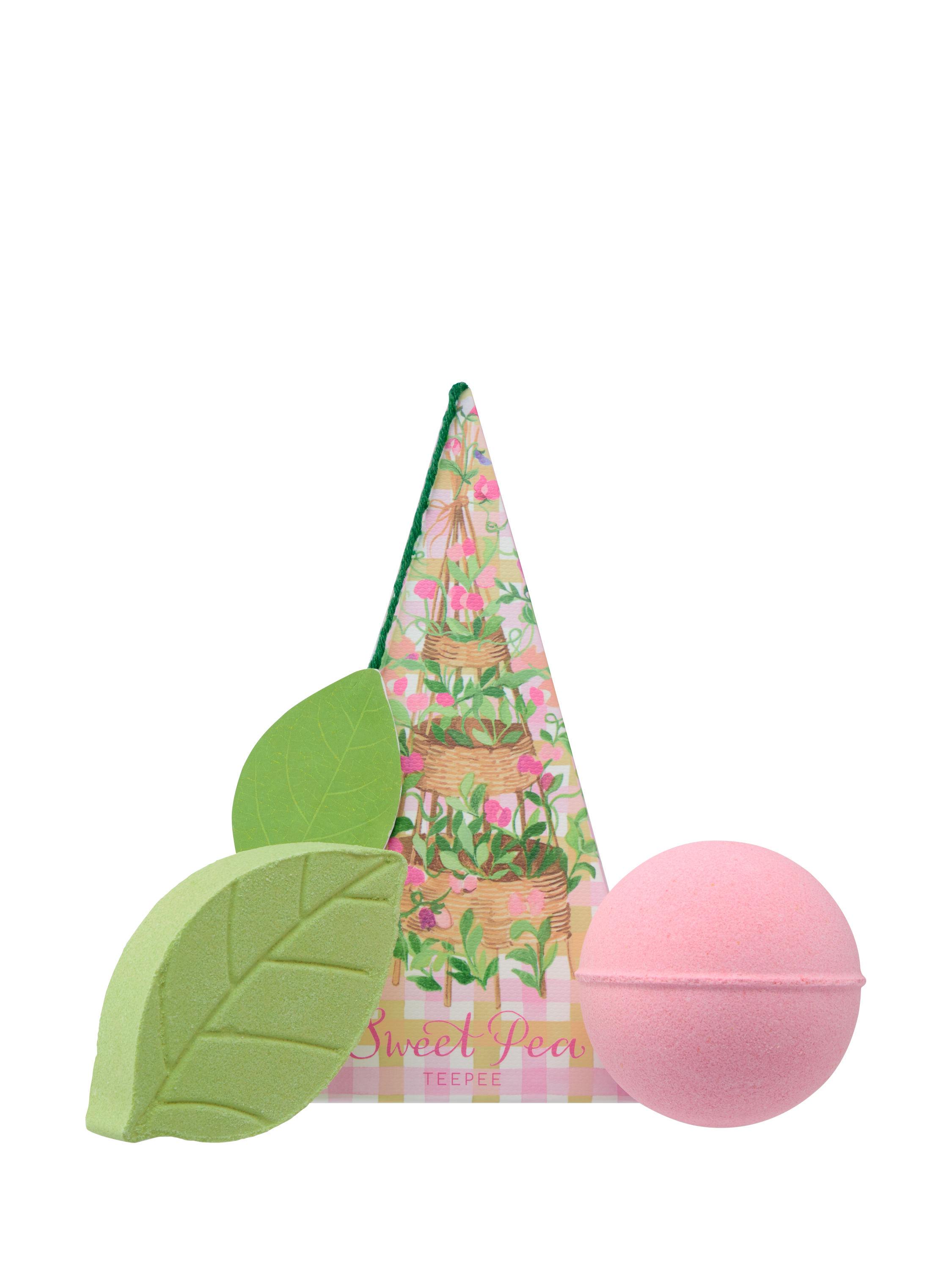A delightful bathtime gift of two sweet pea scented bath fizzers with skin-kind glycerin and evening primrose oil in a pretty teepee shaped carton. Decorated with hand-painted sweet pea illustrations and a leaf shape swing tag to personalise, this bath bomb set makes a perfect gift.