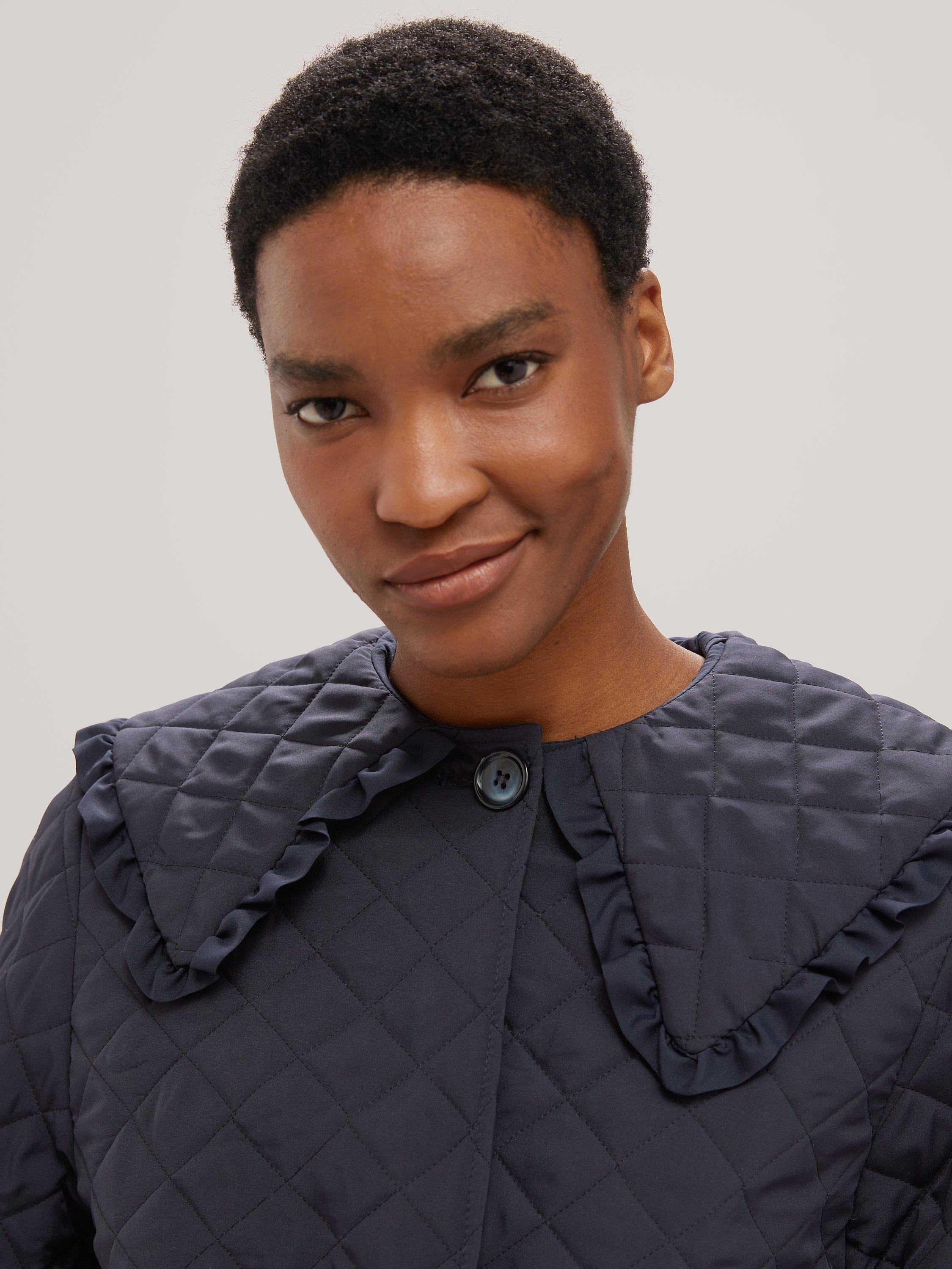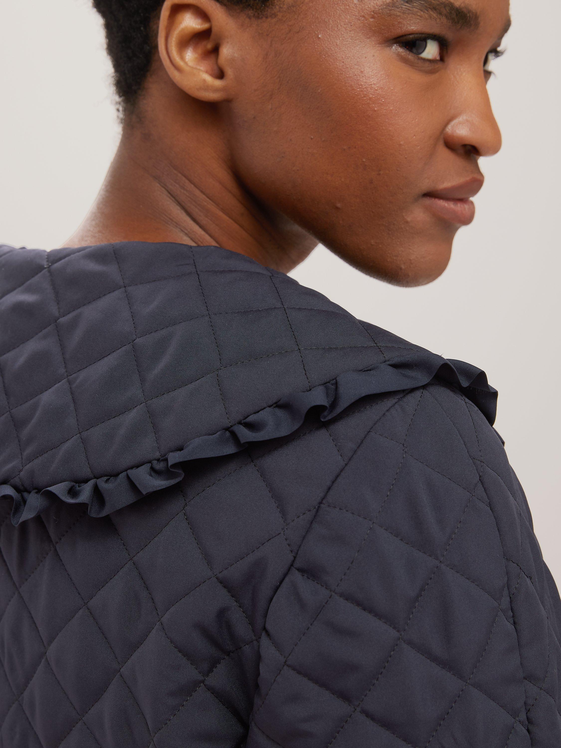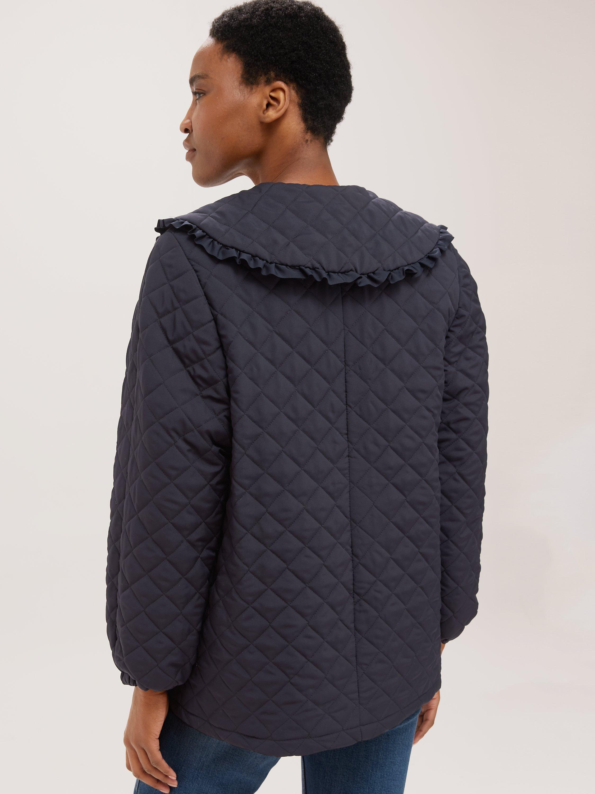 Made in the UK, this classic cut jacket features a tried and tested quilted texture throughout and is finished with charming, frill collar for added style.