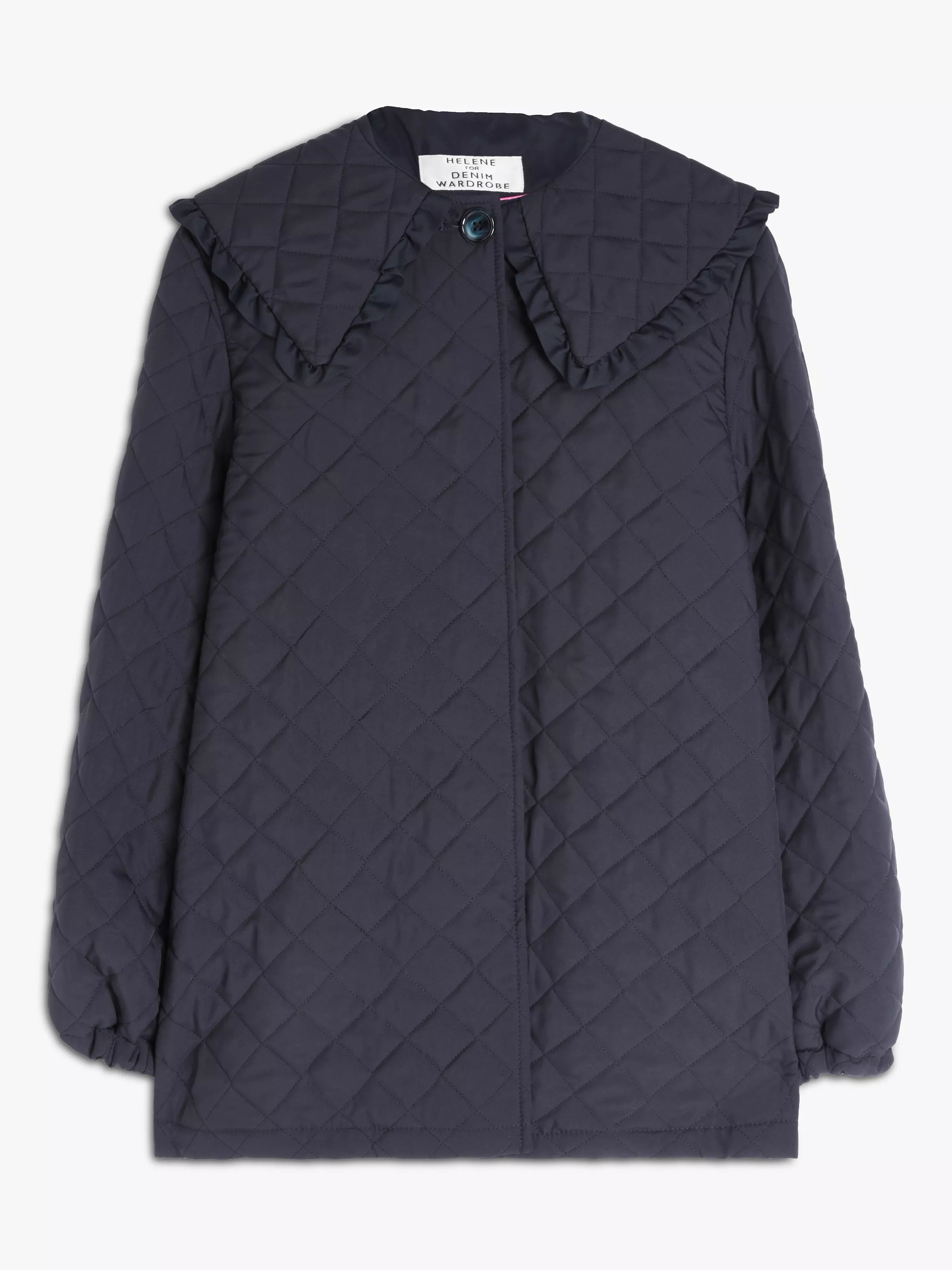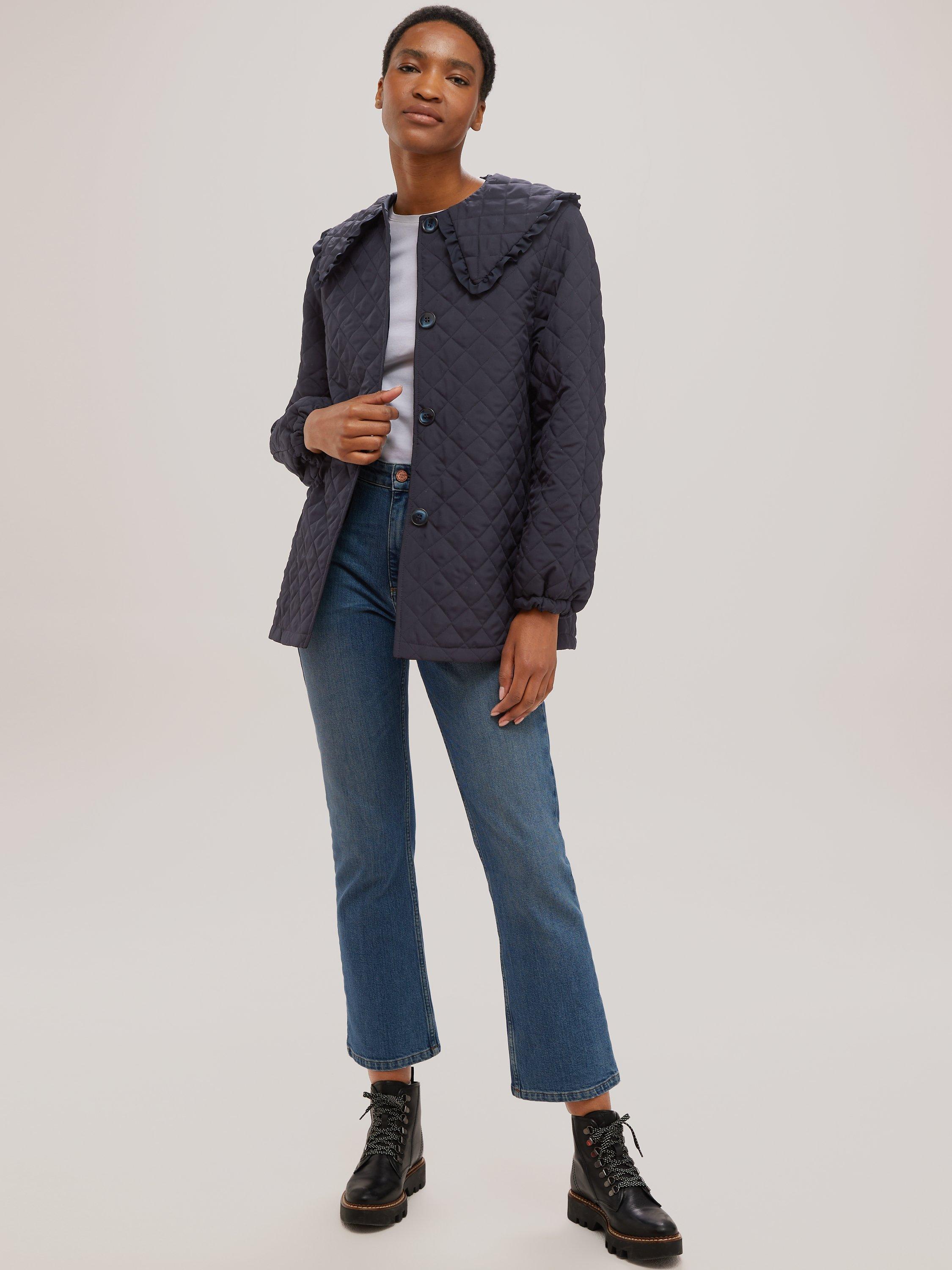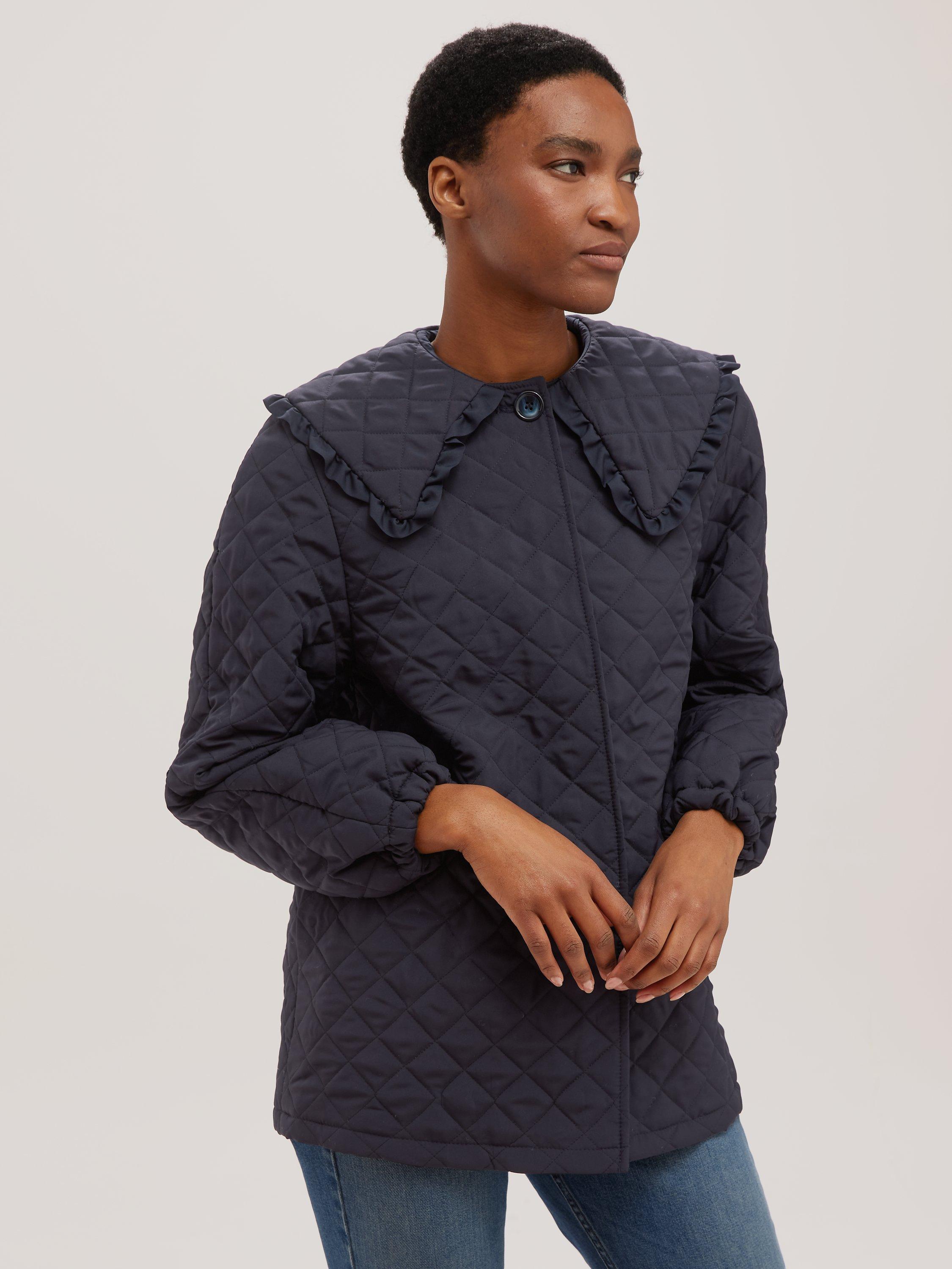 Made in the UK, this classic cut jacket features a tried and tested quilted texture throughout and is finished with charming, frill collar for added style.