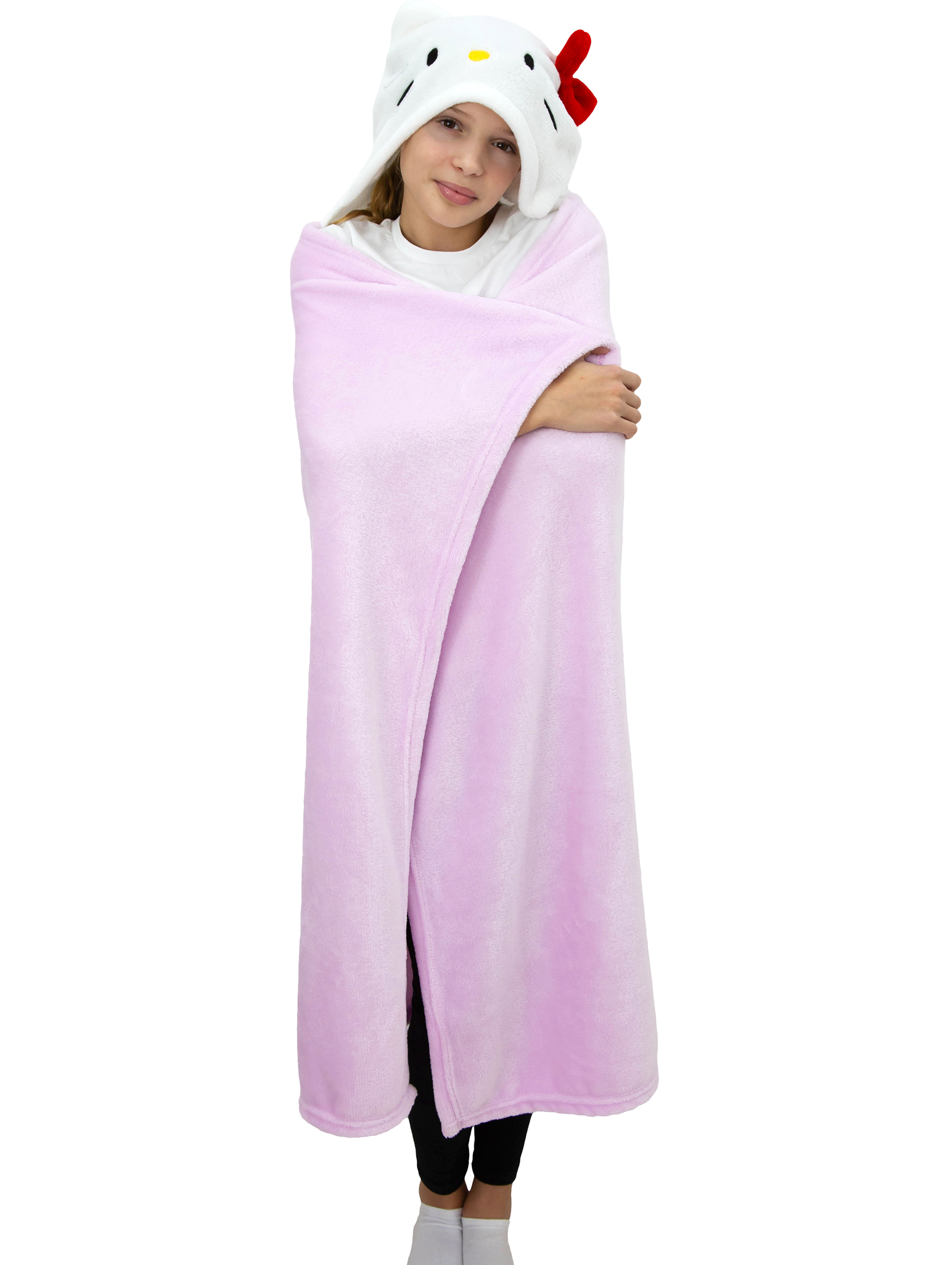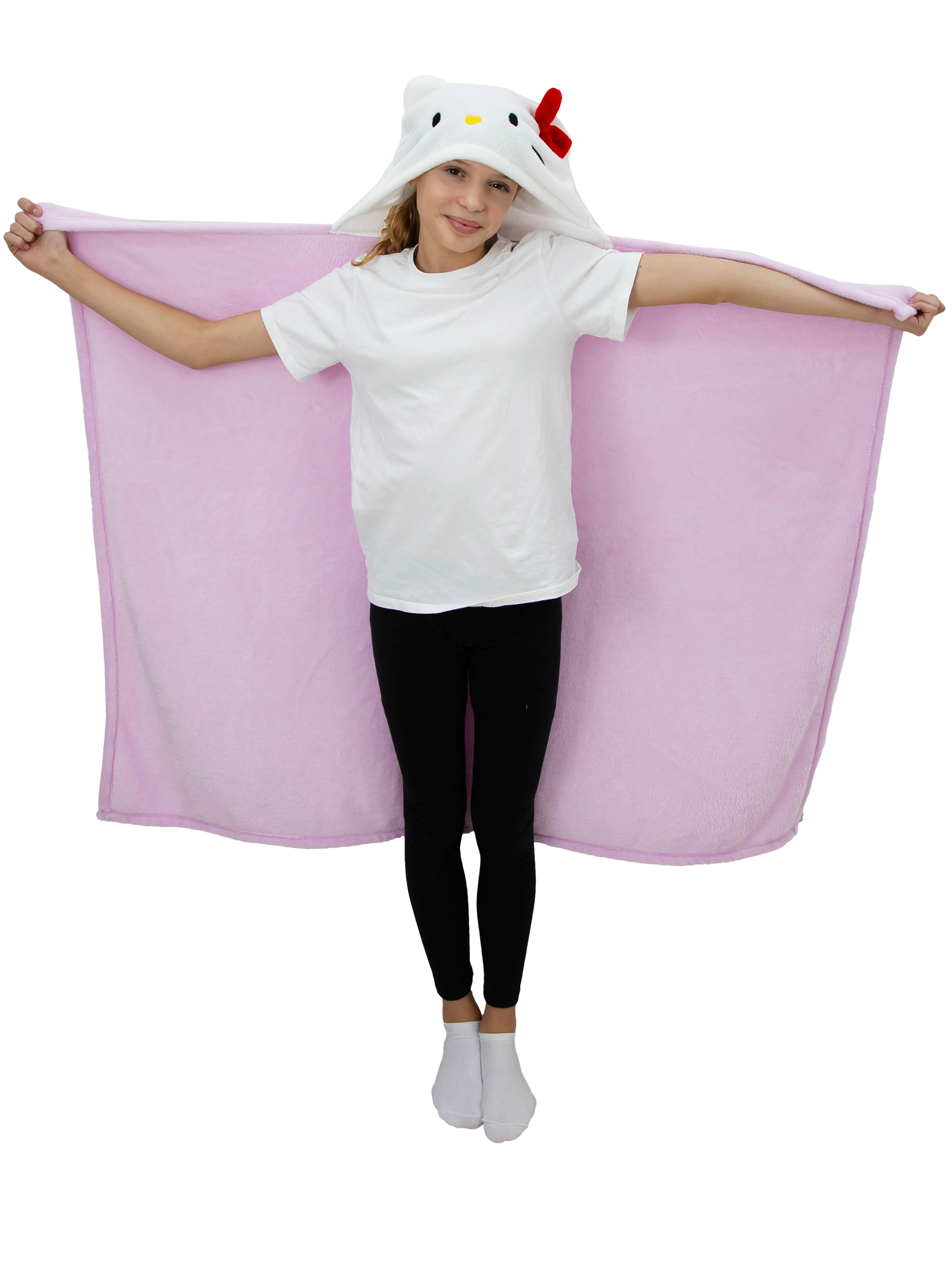 Packed with detail, this wearable blanket features a soft, strokable Hello Kitty hood with embroidered eyes, nose and whiskers, with her famous red bow. The fleece and hood are soft to the touch and thick enough to keep warm, but lightweight and easy to fold up to a compact size, making it great for car journeys and travel.