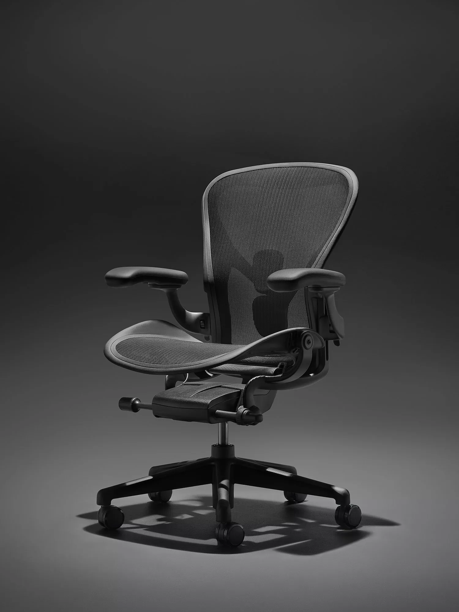 Herman Miller's Aeron office chair is designed to meet the needs of today's work, workers and work environments. Co-designed with industrial designer Don Chadwick, and using the latest research around the science of sitting, this innovative and ergonomic chair fully accommodates the widest possible range of activities and postures people adopt while working. The chair back and seat are linked, and tilt simultaneously at different ratios as you lean back to provide responsive support for your lower back. It's also easily adjustable, from intense forward-facing focus to a more relaxed, contemplative recline.