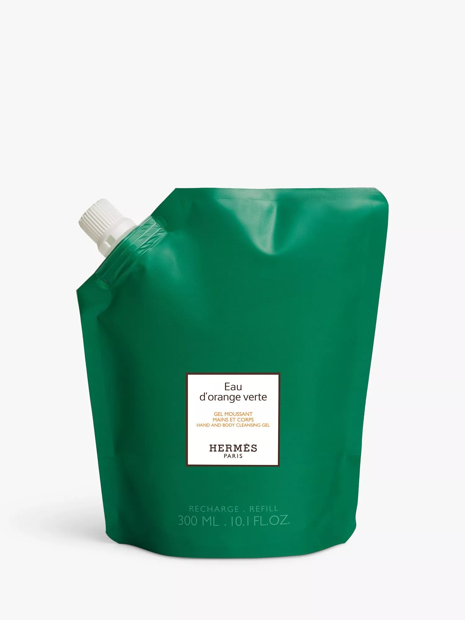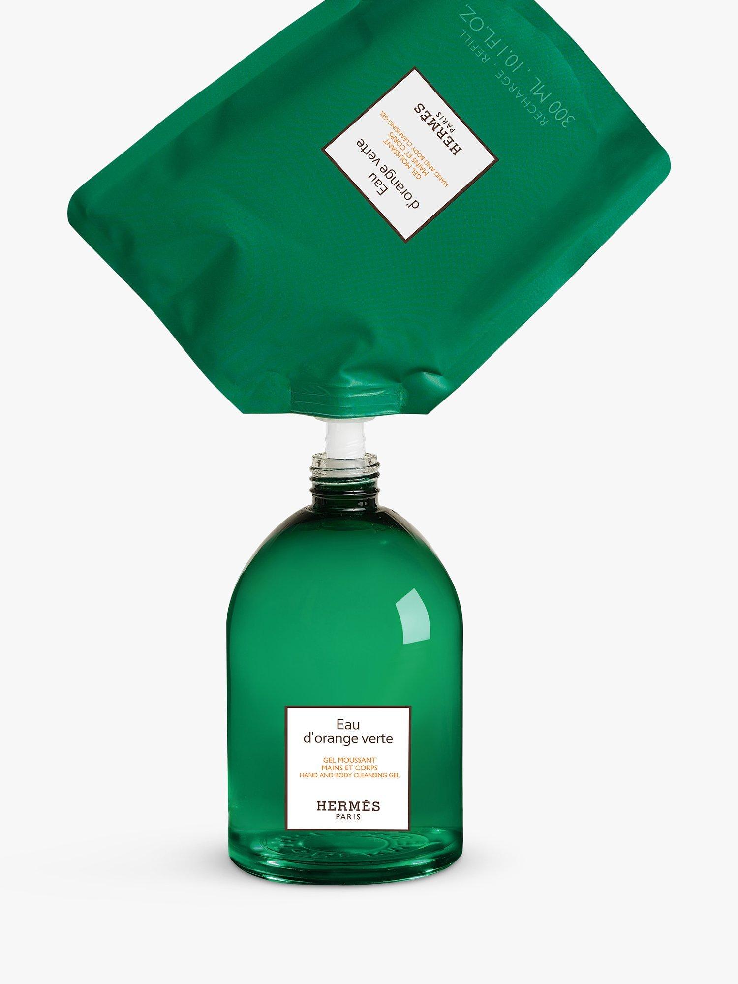 The fully recyclable refill can be used to replenish the glass Eau d'Orange Verte cleansing gel bottle of the same size. A responsible gesture, integral to an object created to last.