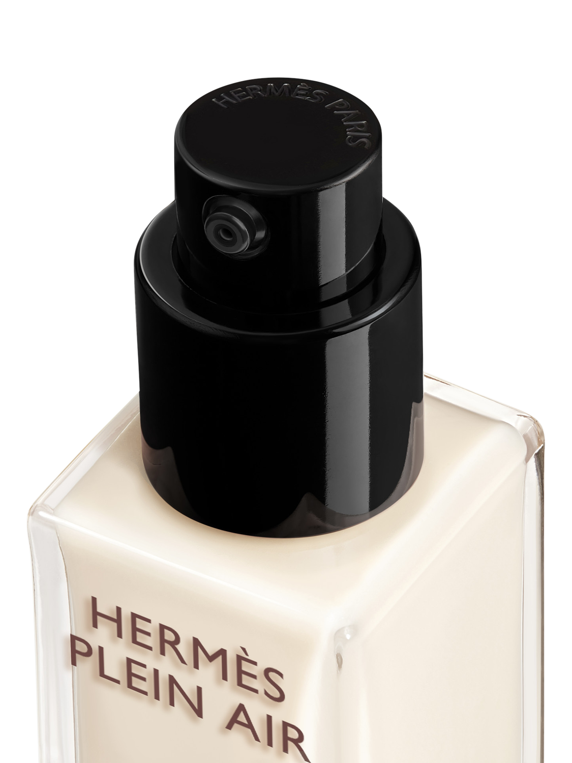 The object: The bottle was designed by Pierre Hardy, creator of Hermès Beauty objects. The clean, graphic lines combine the circle and the square and are crafted in noble materials. The glass is partly white-lacquered, partly transparent, playing with our perceptions. The black metal pump, engraved with the Hermès Paris signature, delivers just the right amount for one application. And the white metal cap with its jewel-like finish is decorated with the Hermès Ex-Libris in gold permabrass.