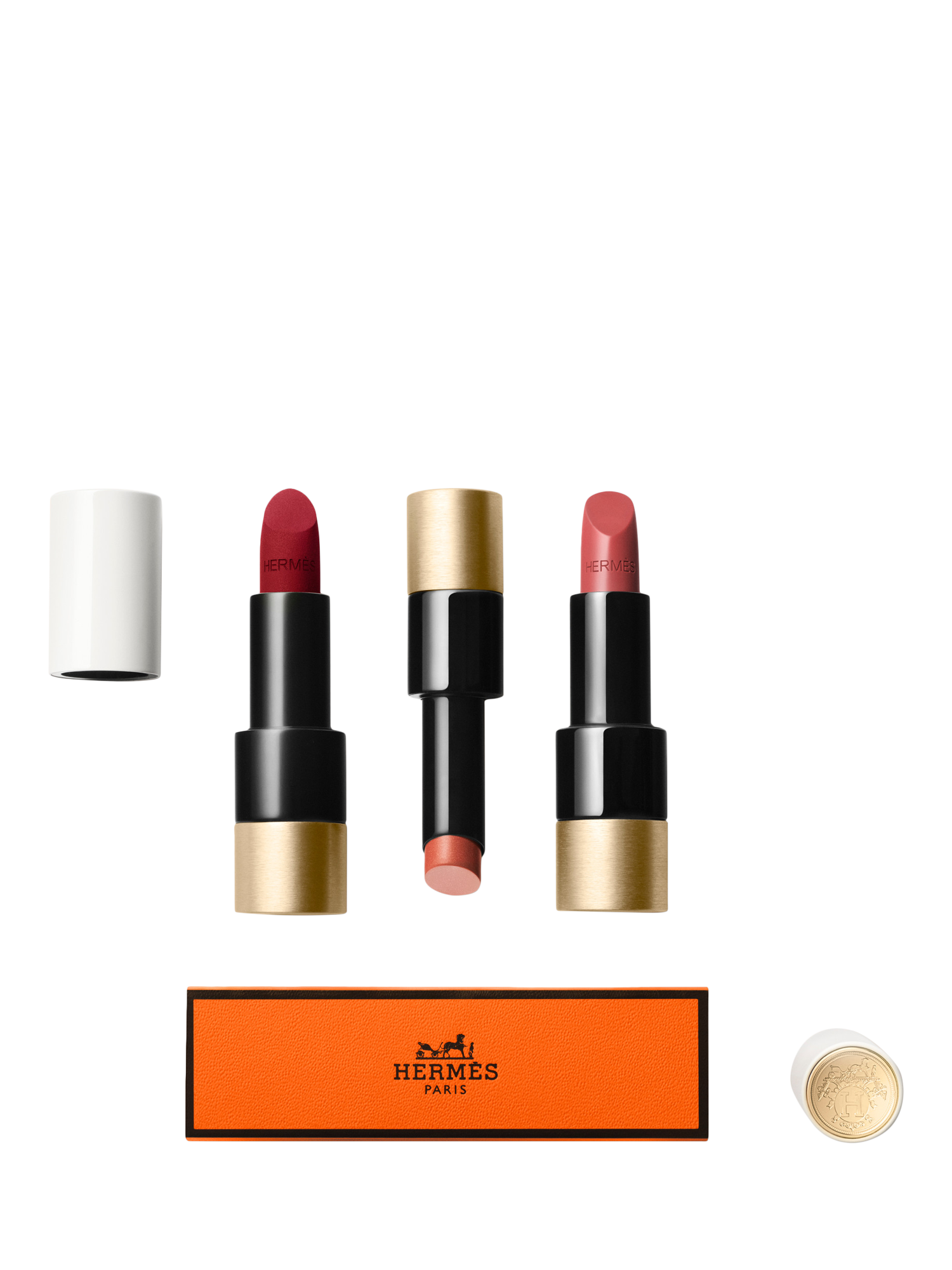 Object: Pierre Hardy has designed an object with slender lines and a lacquered and brushed metal finish. Its cap is engraved with the Hermès ex-libris. Silky Lipstick Shine is protected by a Rouge H canvas pouch and nestled in an orange box.