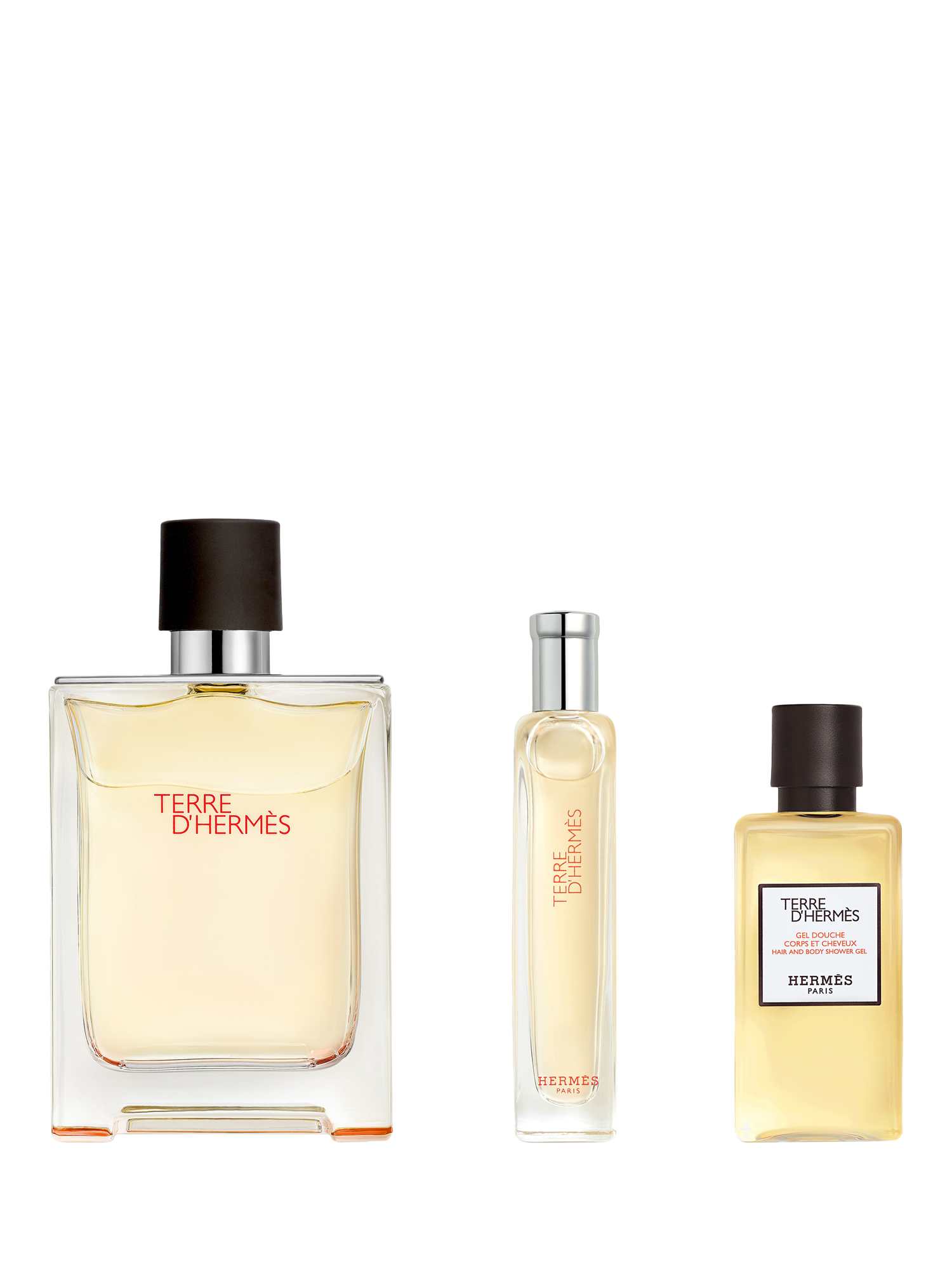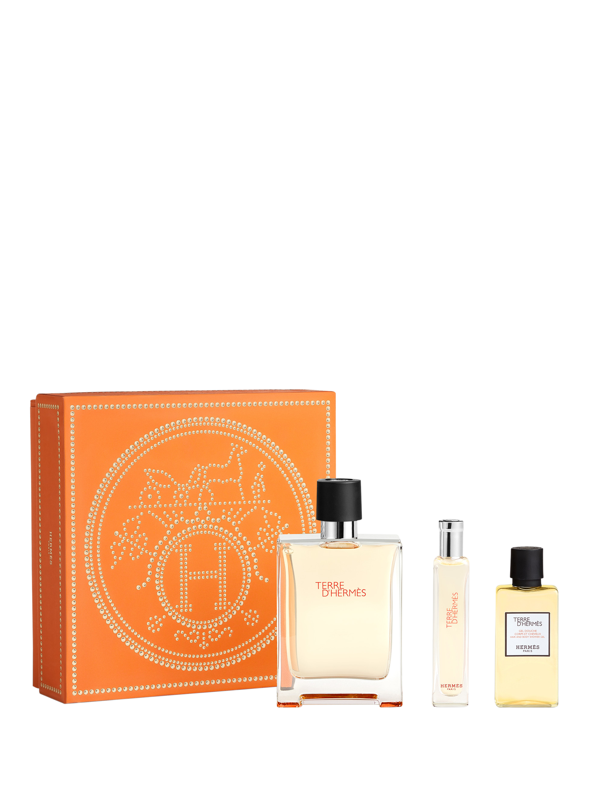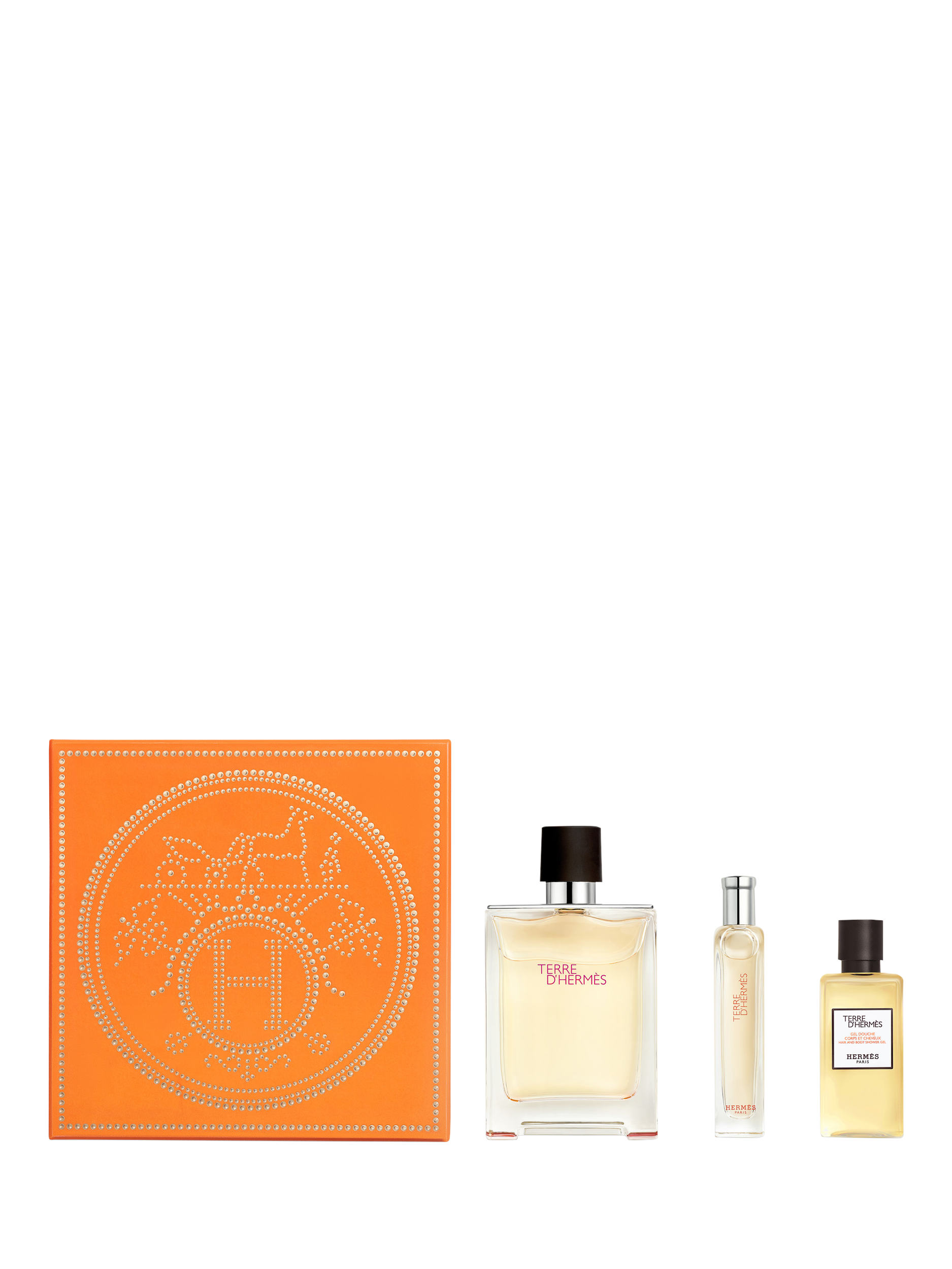 This gift set comprises one 100ml Terre d’Hermès Eau de Toilette, one 15ml travel size Terre d’Hermès Eau de Toilette, and one 40ml hair and body shower gel.