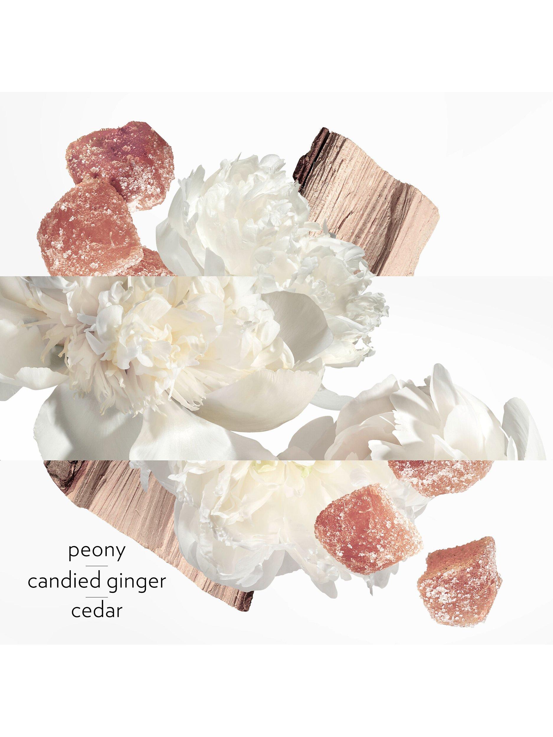 With its floral composition, the Eau de Parfum expresses its joyful spirit through candied ginger, generous peony and lively cedar.
