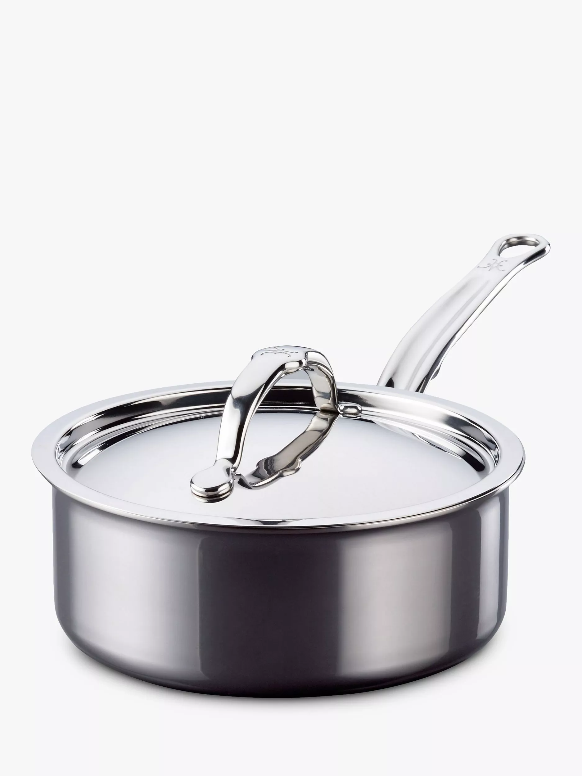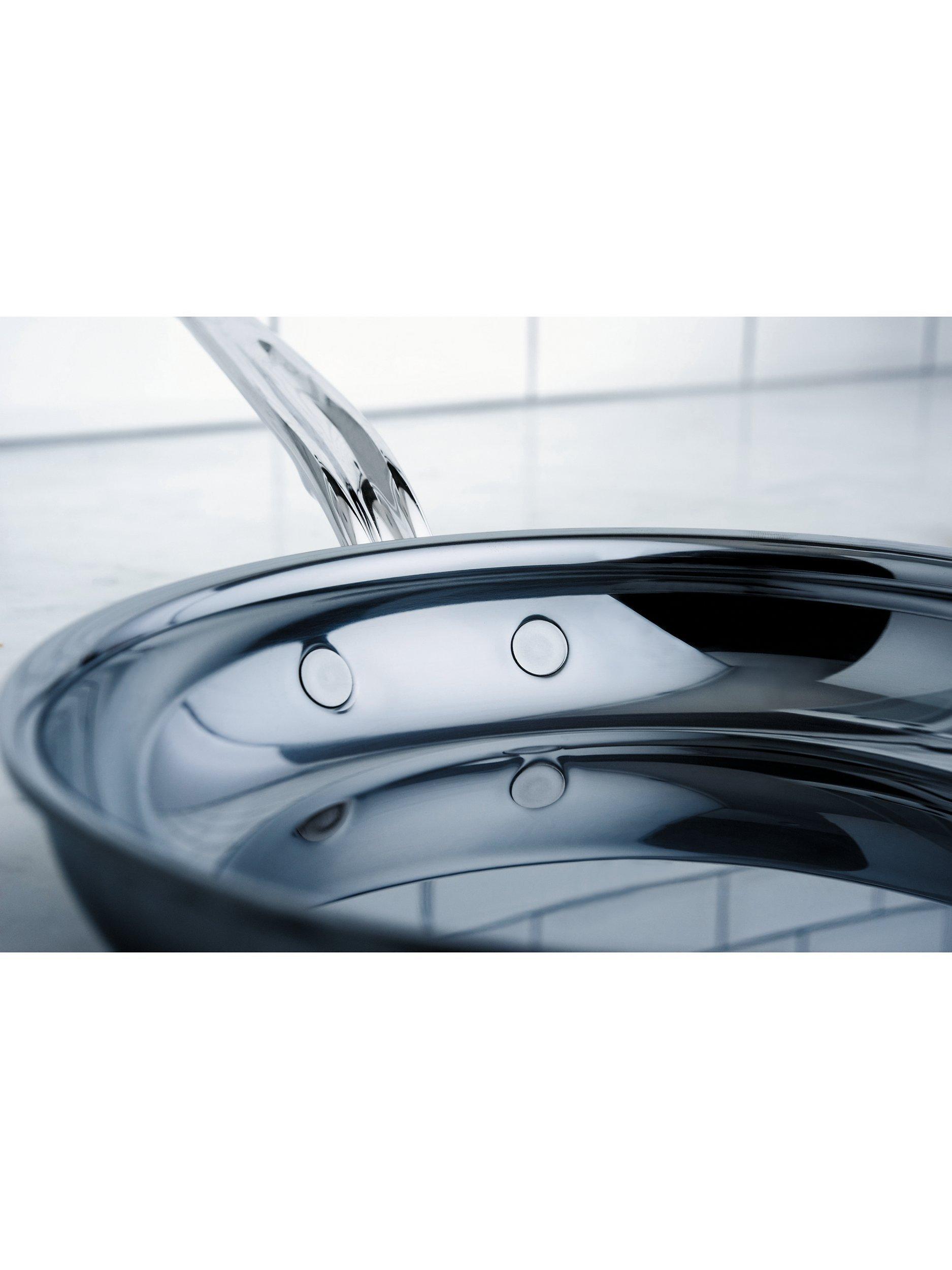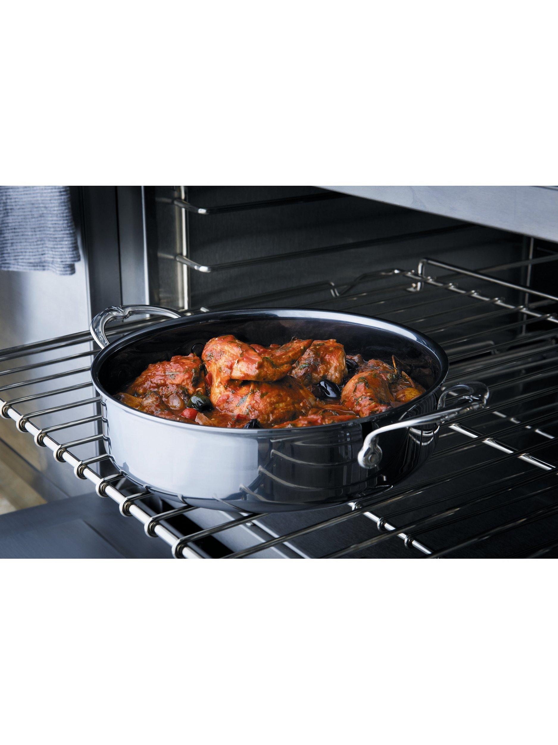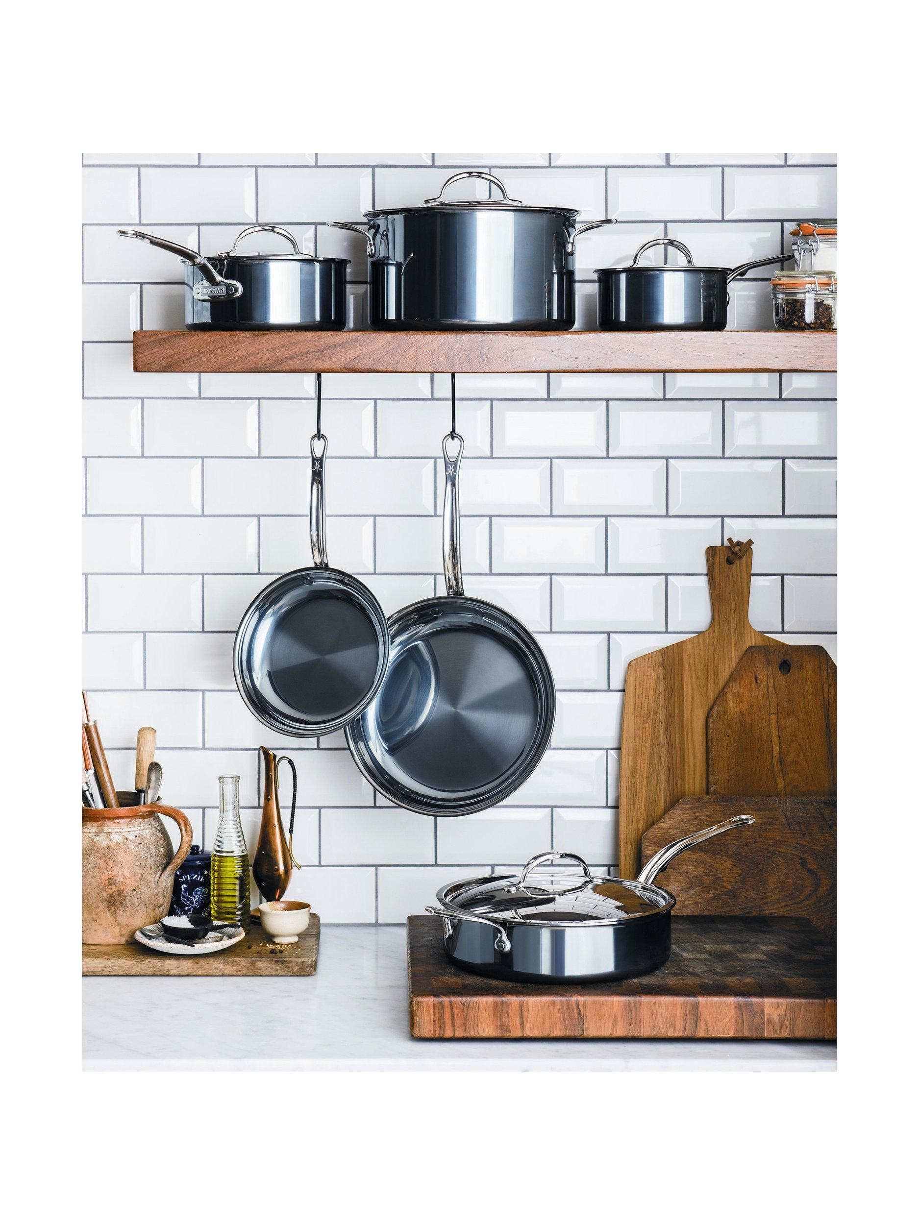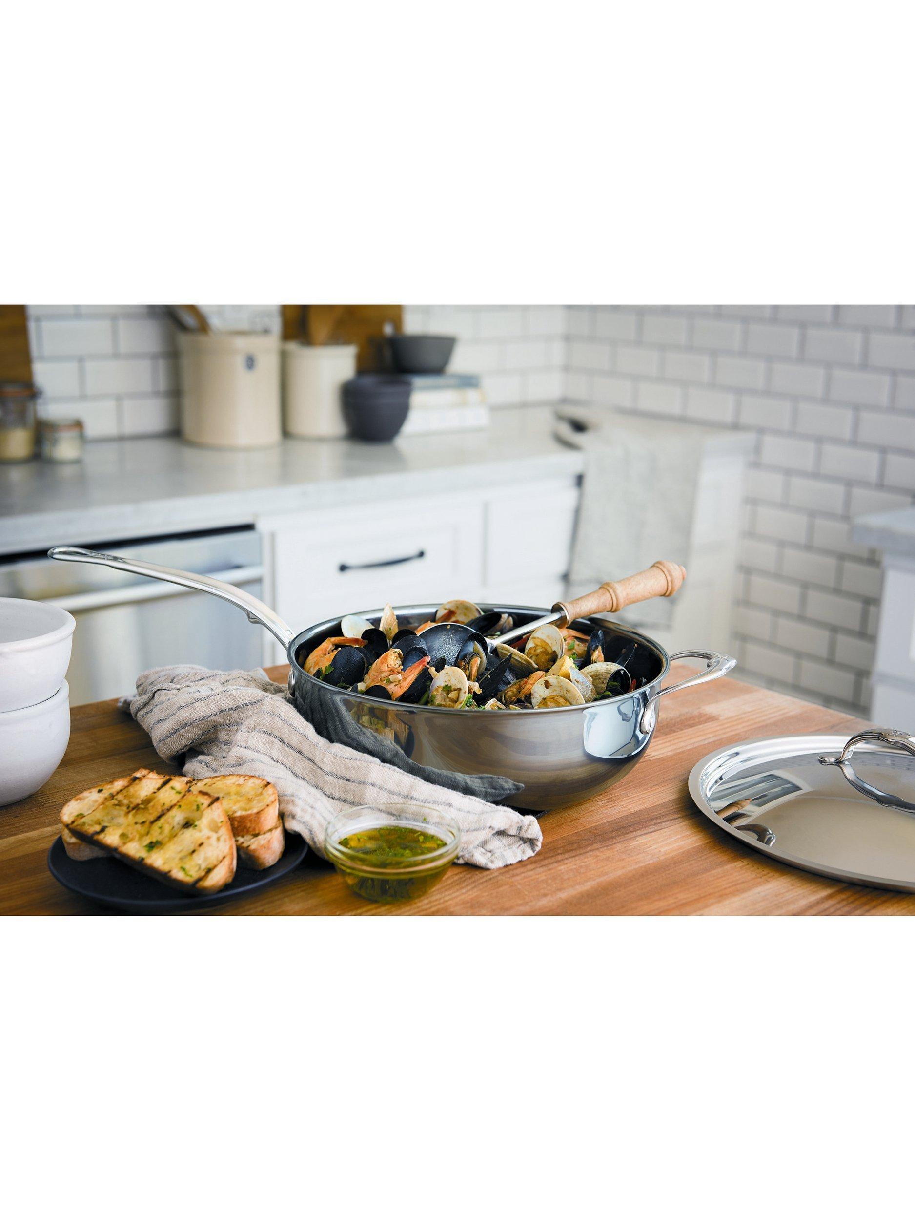 Designed for ease of use, the cookware has thin side walls so it's light in weight, with ergonomic handles for greater comfort and total control and flared rims for easy pouring. Flush rivets prevent food build up, allowing for easy cleaning, stacking and nesting. The cookware is dishwasher safe, metal utensil safe and you can even clean it with steel wool. It's finished with a two-toned brushed steel exterior and beautifully polished steel band.