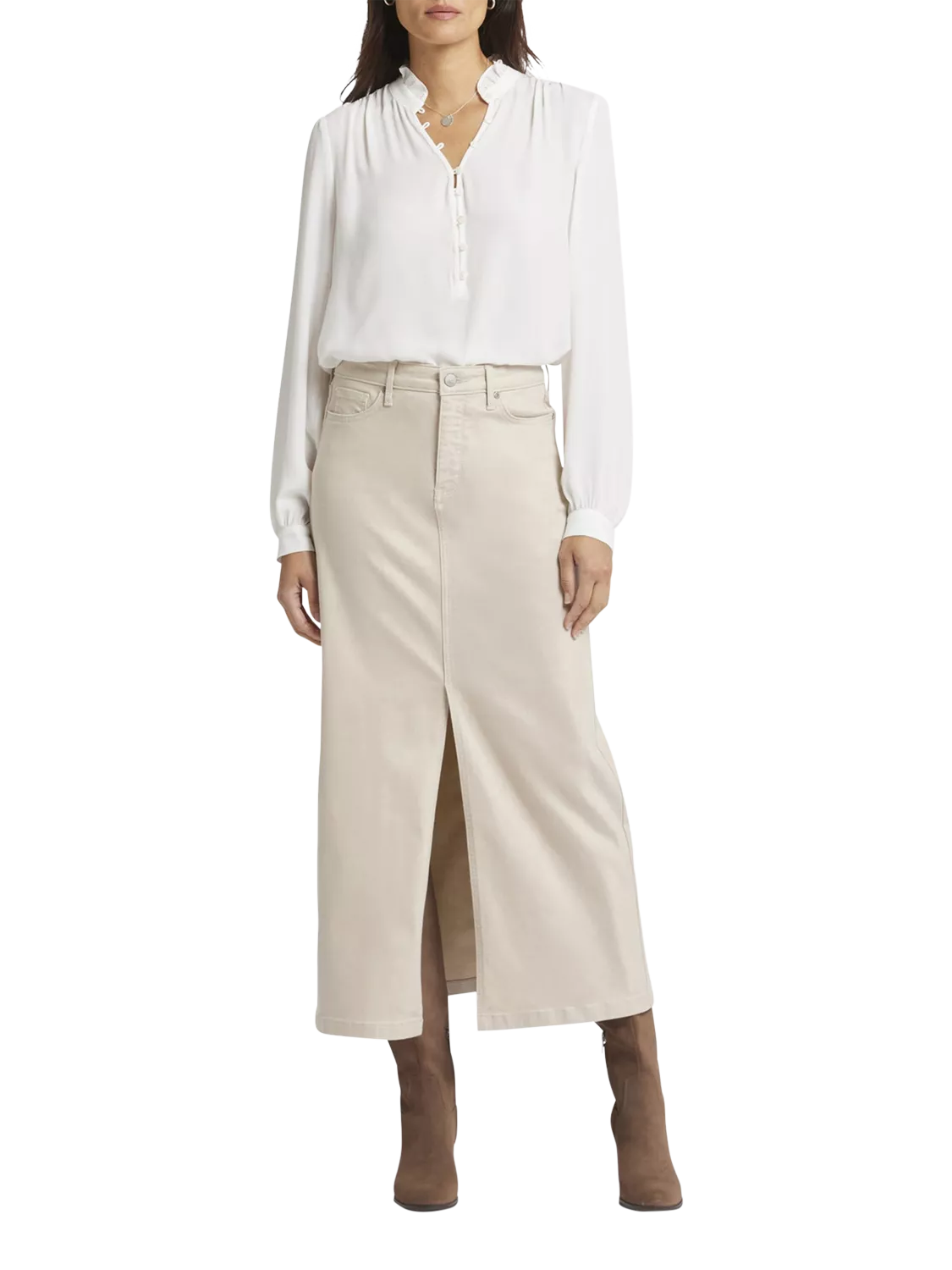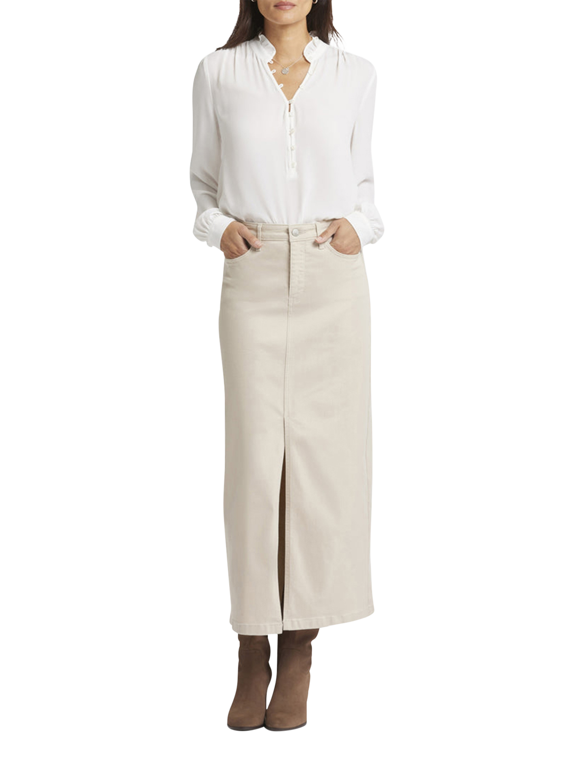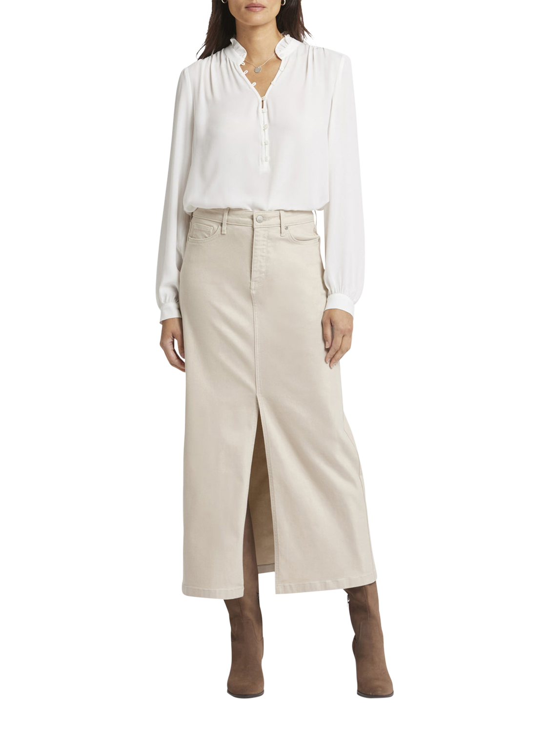 NYDJ's High Rise Long Skirt is a classic wardrobe staple that you'll get endless wears out of all season long. Our signature Lift Tuck® Technology provides just the right amount of support for a smooth, flawless figure—all thanks to an innovative, proprietary slimming panel with a patented criss-cross design. Finished with five-pocket styling, zip fly, button closure and center front slit for ease of movement. This skirt is made with earth-friendly methods that result in reduced consumption of water, chemicals and/or energy.