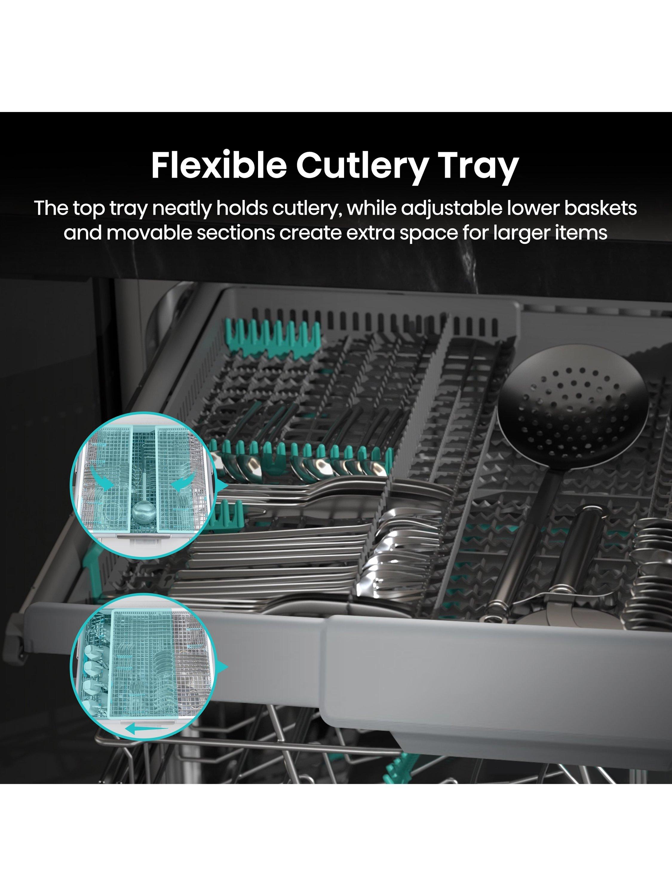 Neatly lay out your cutlery in the dedicated top tray, leaving you with ample amount of room in the two lower adjustable baskets for crockery, pots and pans. With added flexibility, the moveable sections allow for additional room for those taller items.