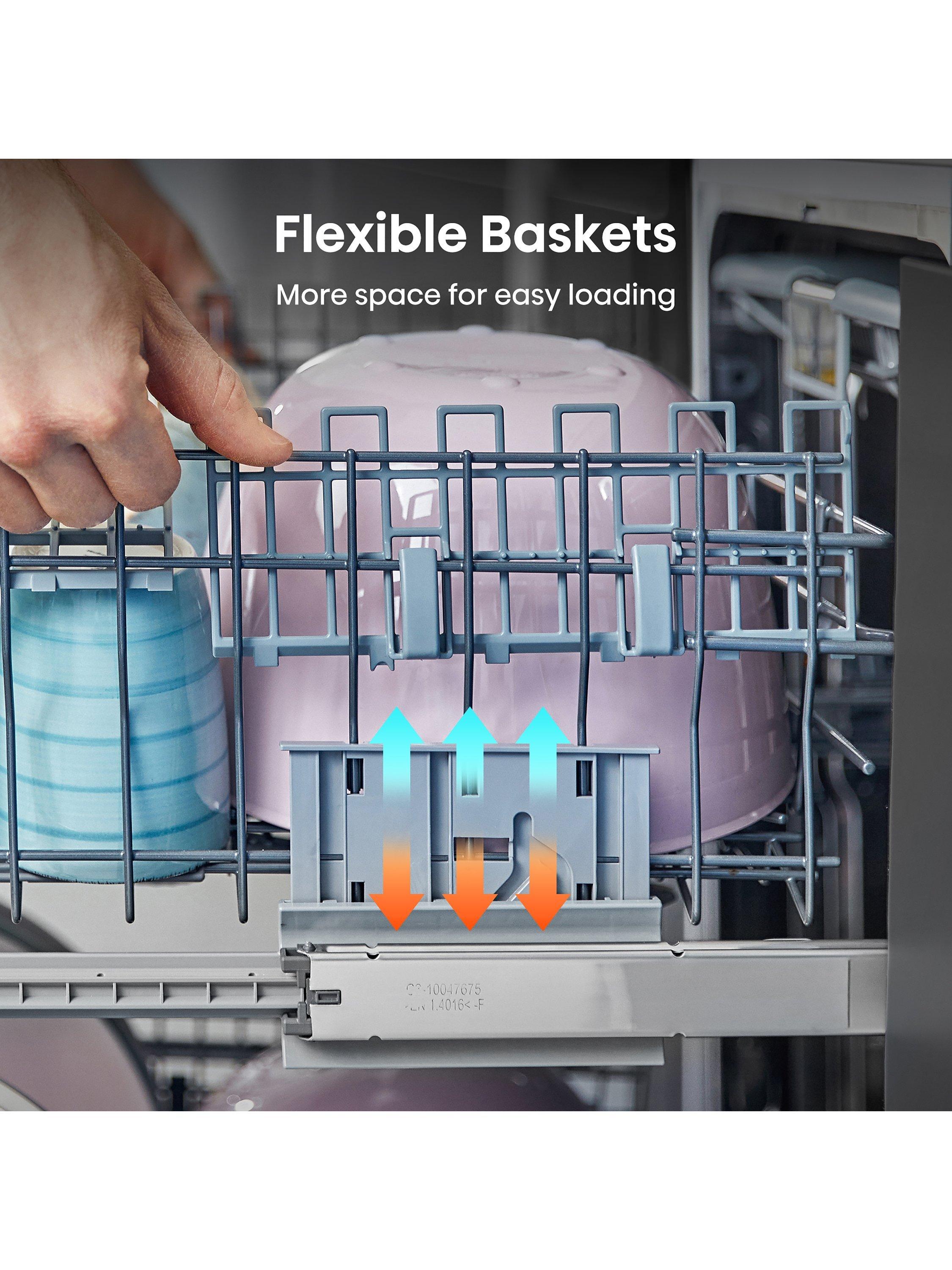 Neatly lay out your cutlery in the dedicated top tray, leaving you with ample amount of room in the two lower adjustable baskets for crockery, pots and pans. With added flexibility, the moveable sections allow for additional room for those taller items.