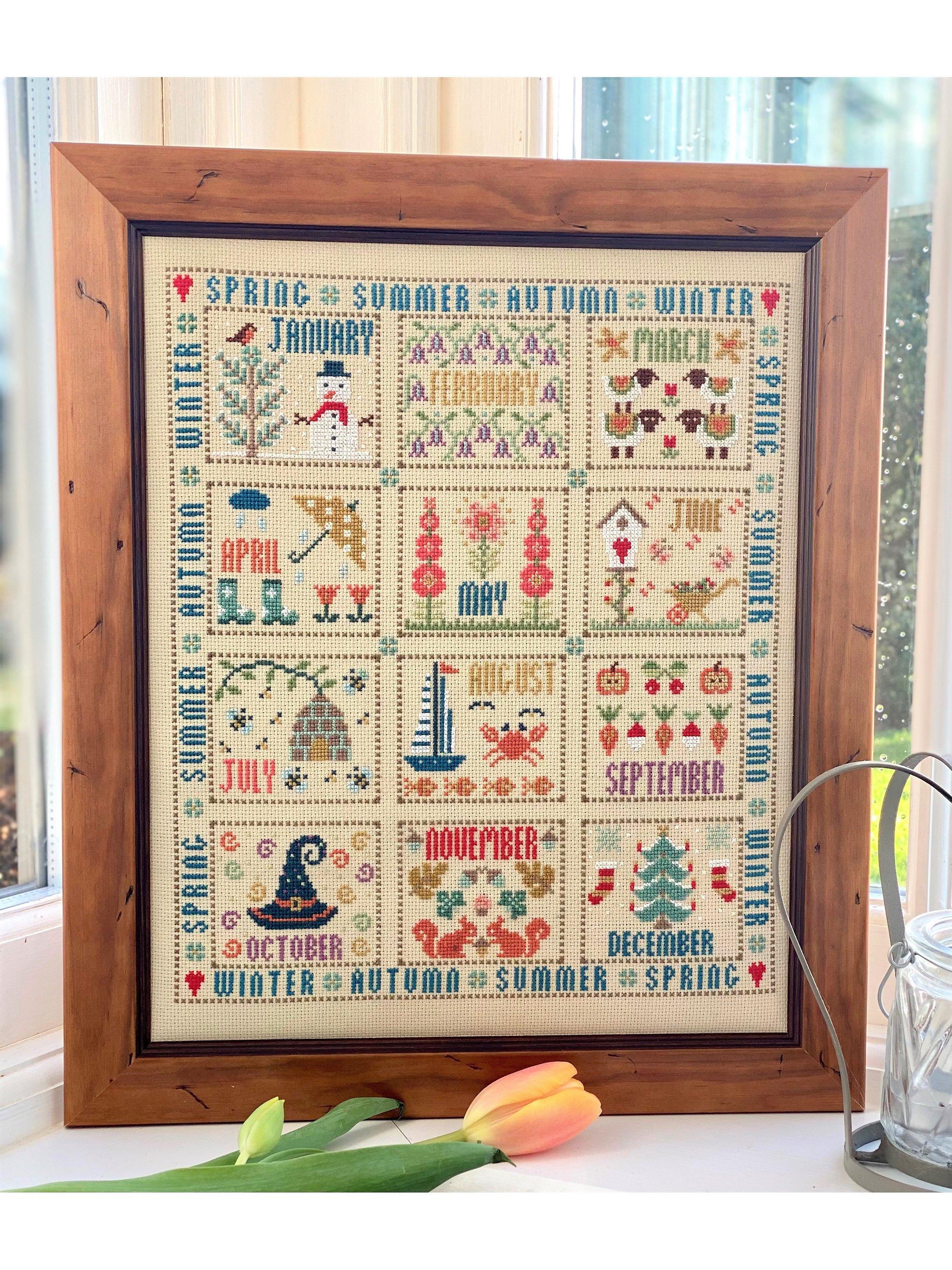 A fantastic cross stitch design featuring the twelve months of the year, in individual boxes, with an appropriate motif in each box. Stitched in an array of muted tones, this would make a gorgeous addition to any room and will be a lovely heirloom for years to come.