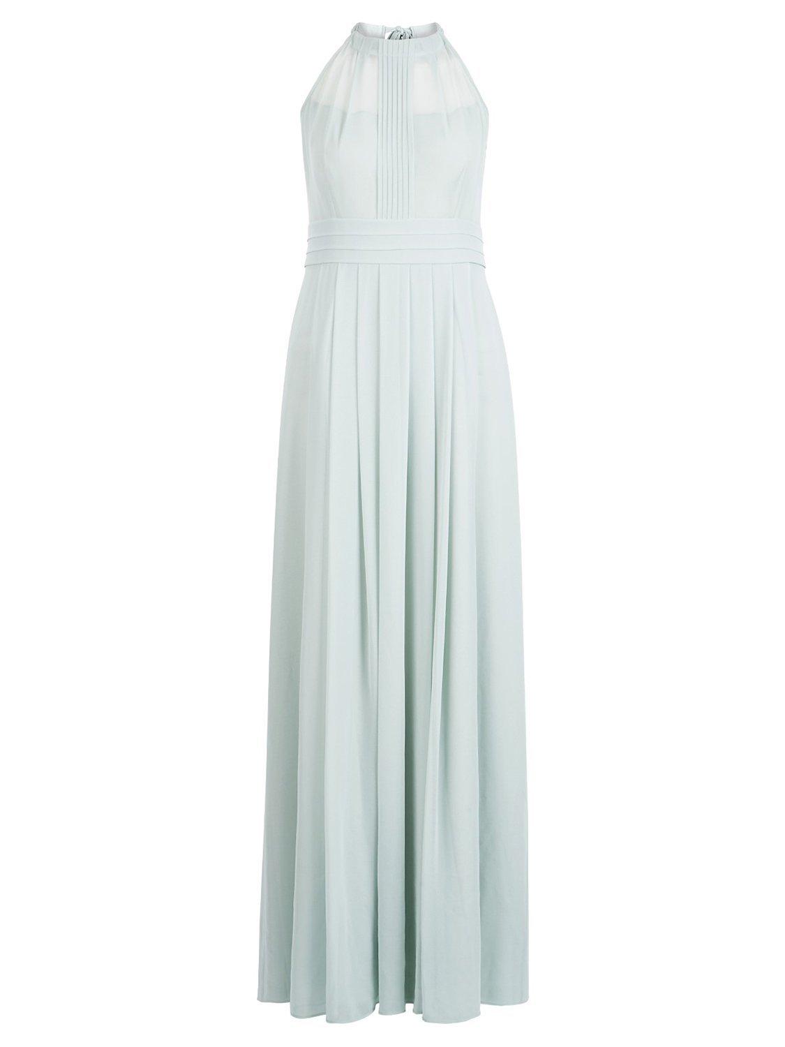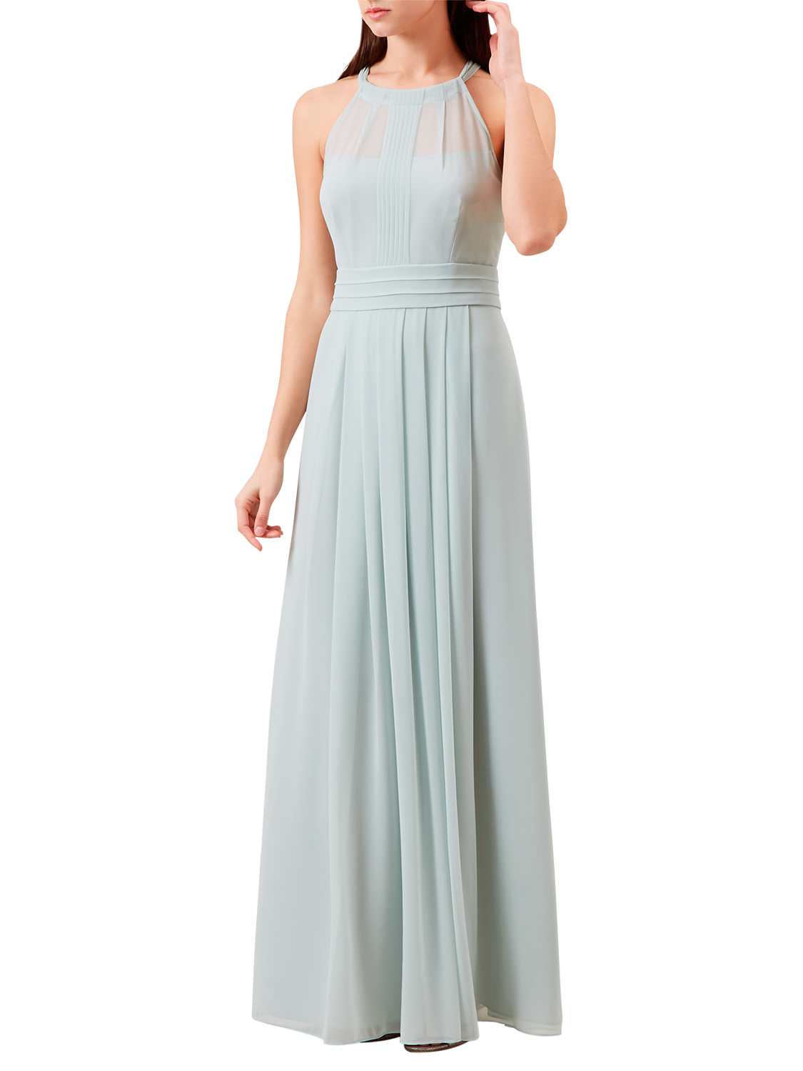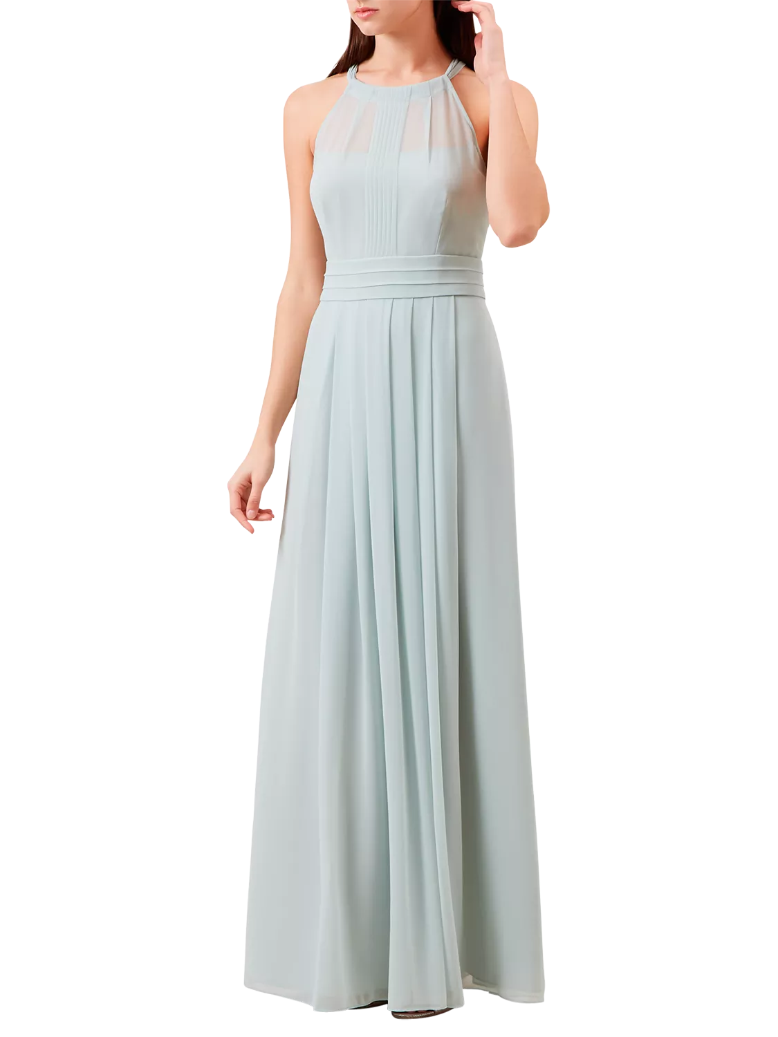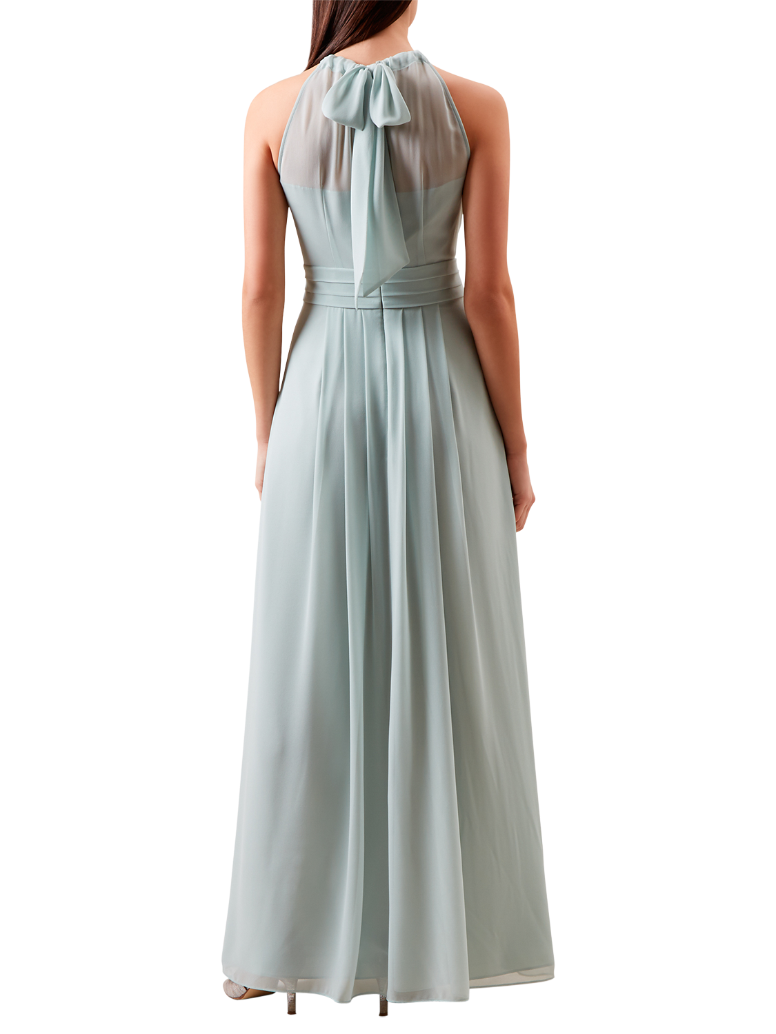 The fabric is designed with a stunning lightweight layer over a full lining, while the floor-lengthened cut beautifully elongates your silhouette. The sleeveless bodice, high halterneck, empire line drape, and gorgeous back bow enable you to showcase an elegant and sophisticated look.