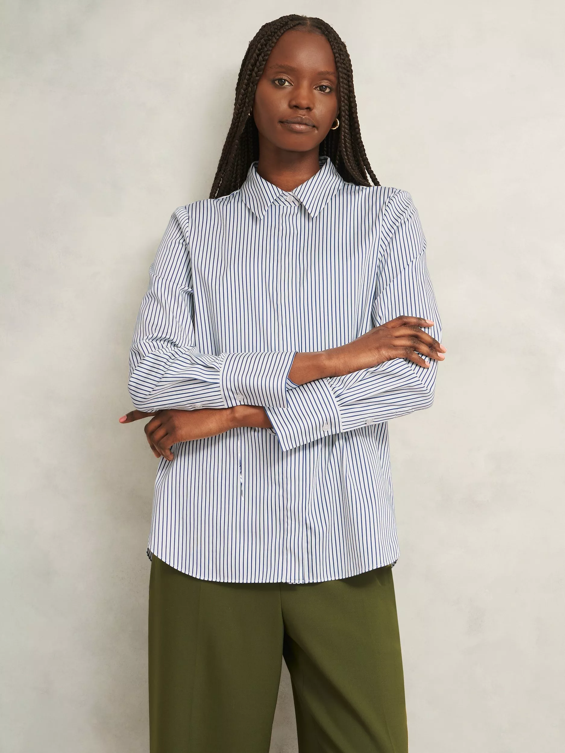 Refreshing a wardrobe staple for this season and next, the Andra shirt boasts blue stripes over a white backdrop. Just add denim.