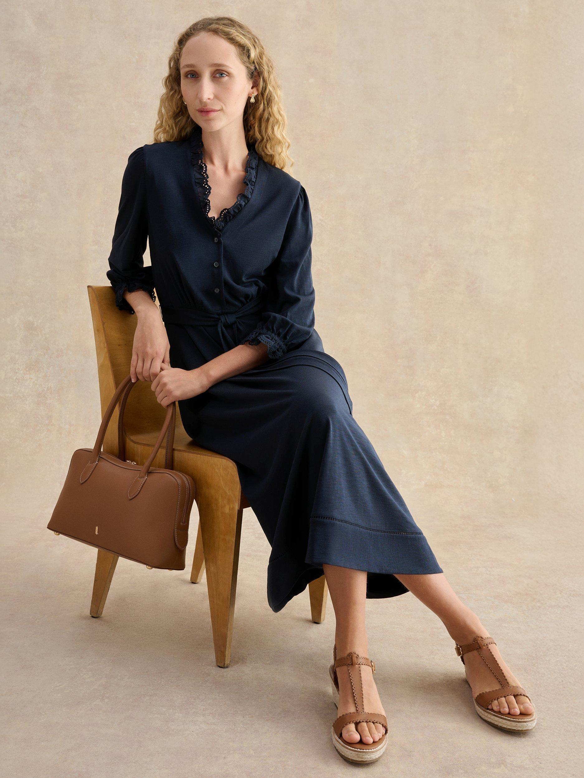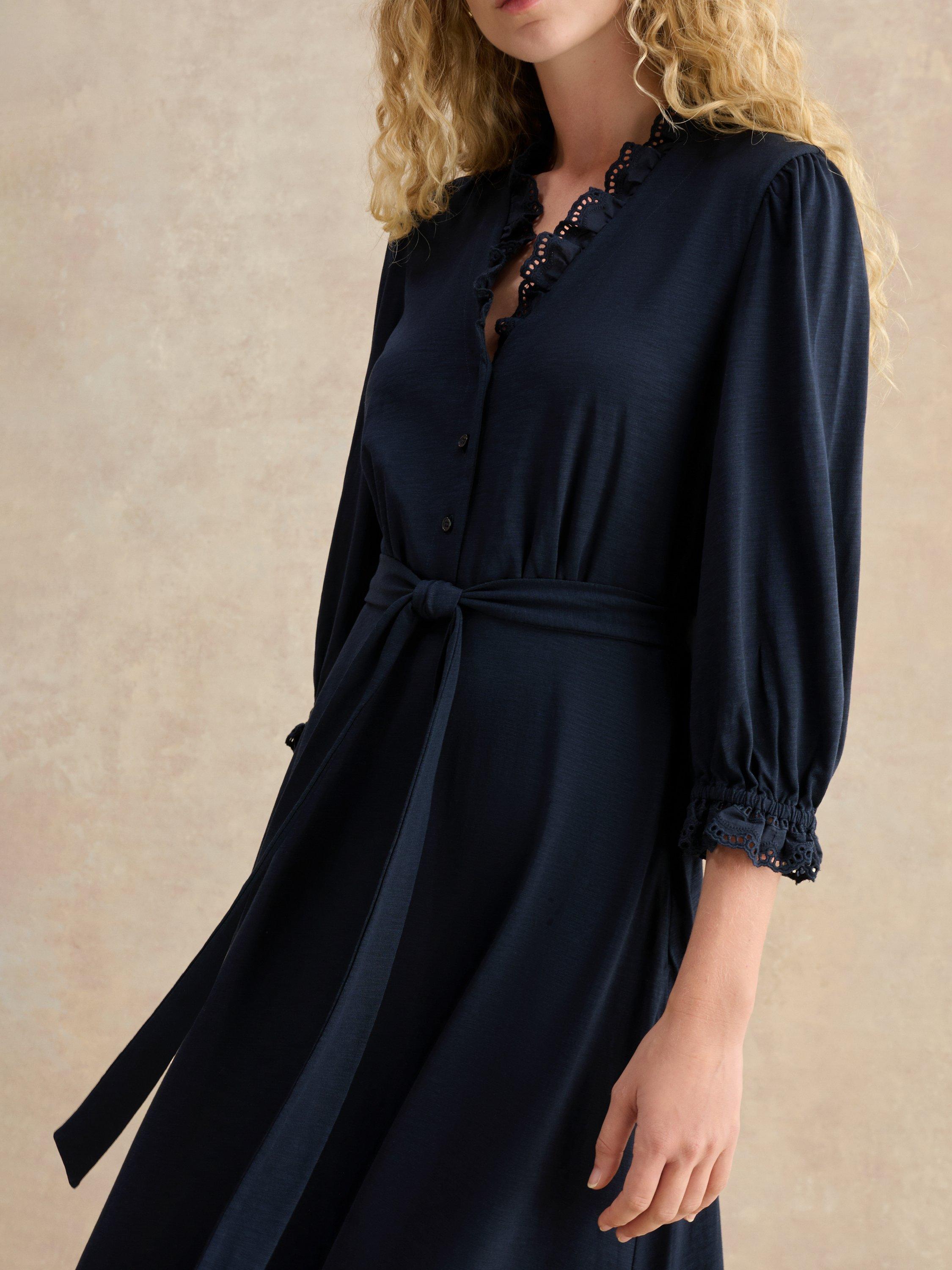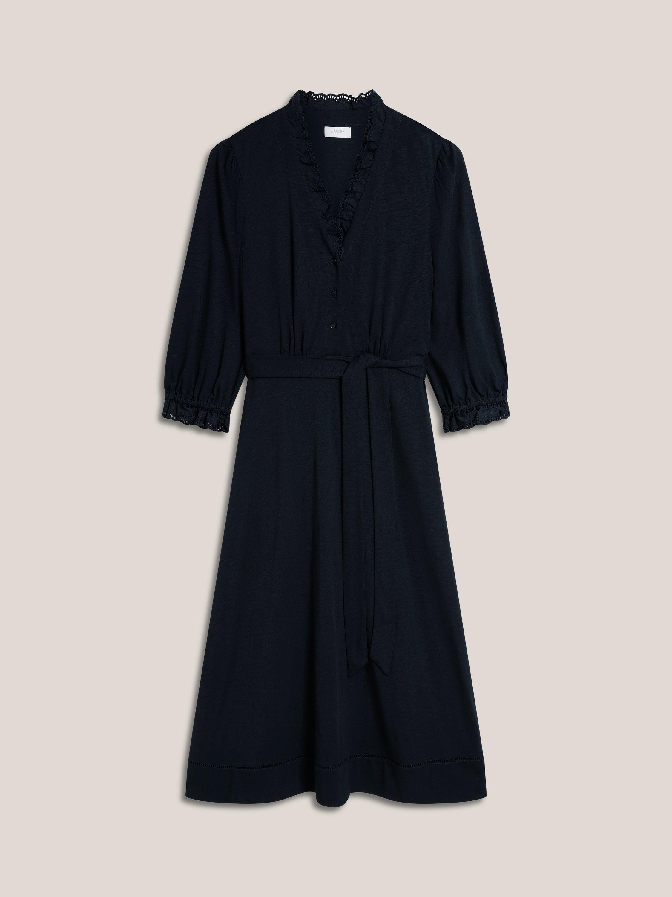 Elevated with ruffle, cutwork trims, the Arya jersey dress lends itself to both weekends at home and casual destination dressing.