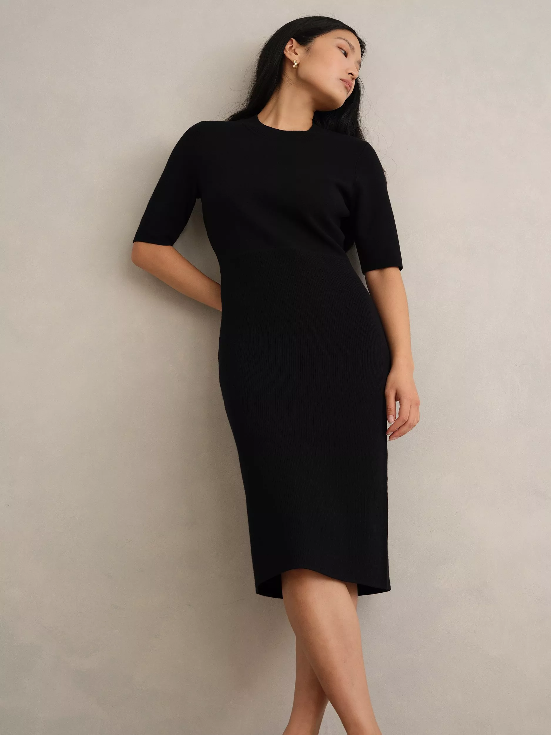 A knitted midi shift dress by Hobbs. It's simple crew neck and short sleeves offer comfort, while the clever design makes it easy to style for work or relaxed plans.