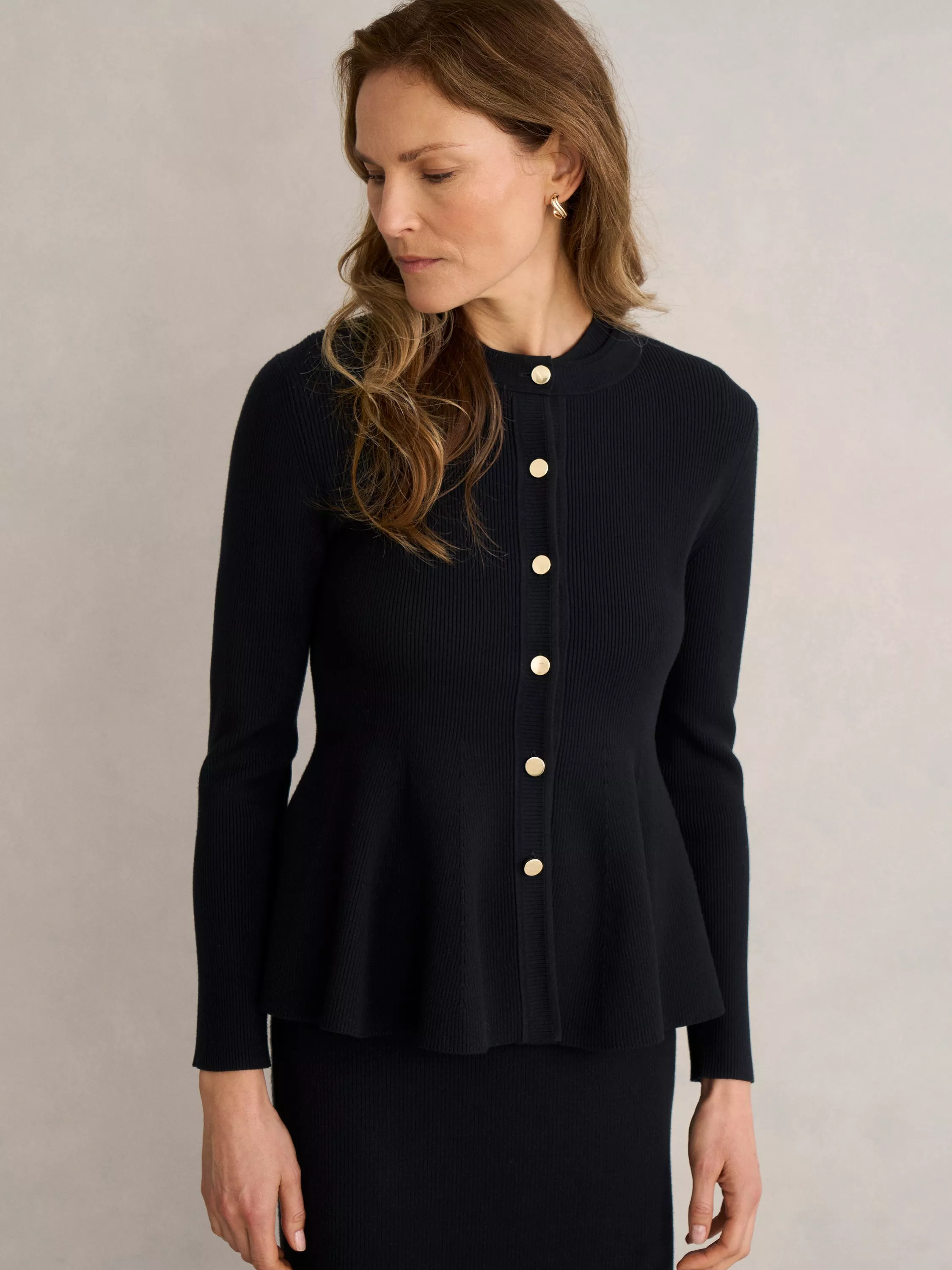 Cut in a flattering peplum cut, the Bridget knitted jacket is the perfect in-between layer for workday and weekend needs.