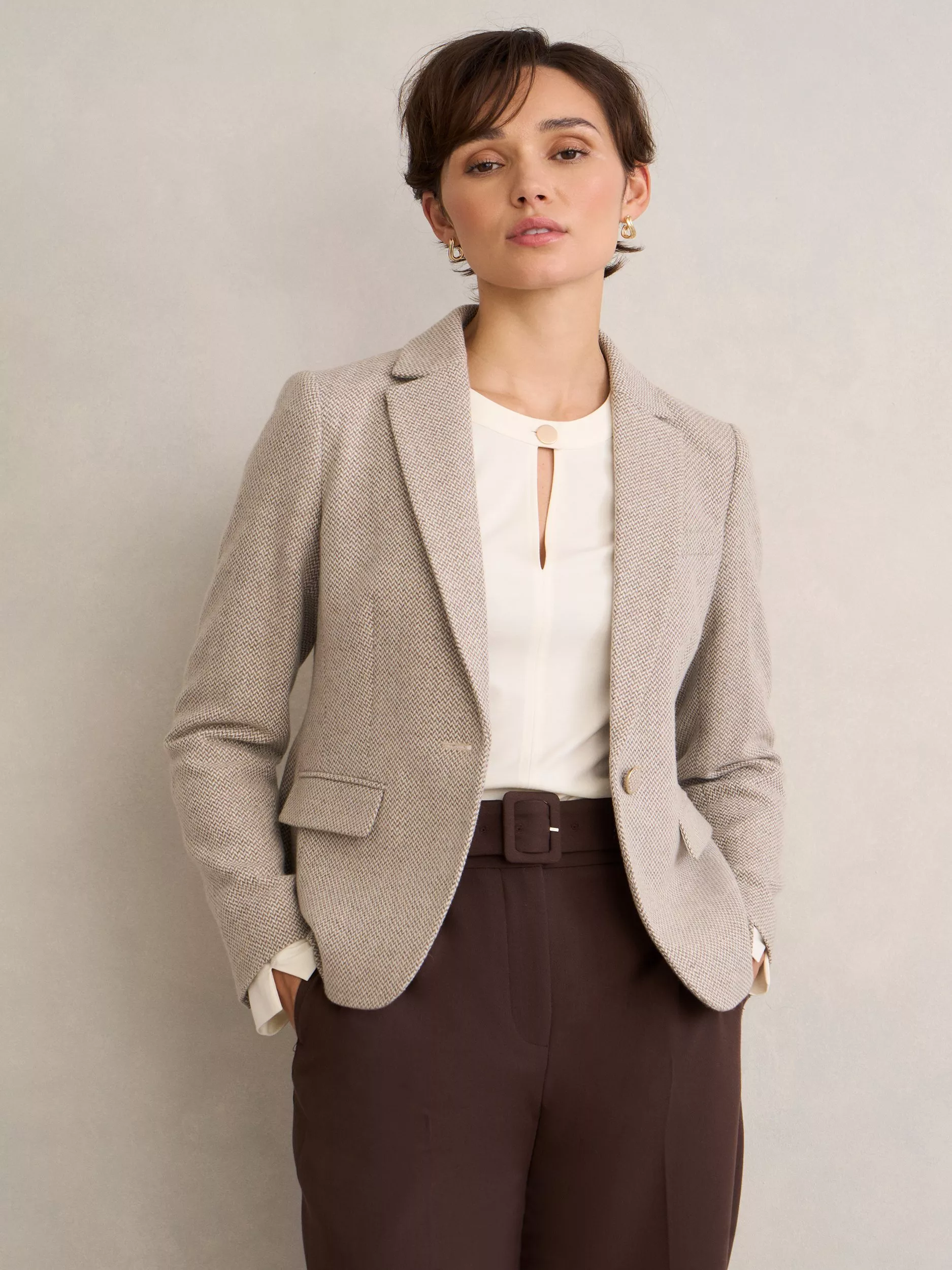 Chelsey lends itself as a sartorial layer come spring and summer. In a wool-rich herringbone weave with a single-breasted cut.