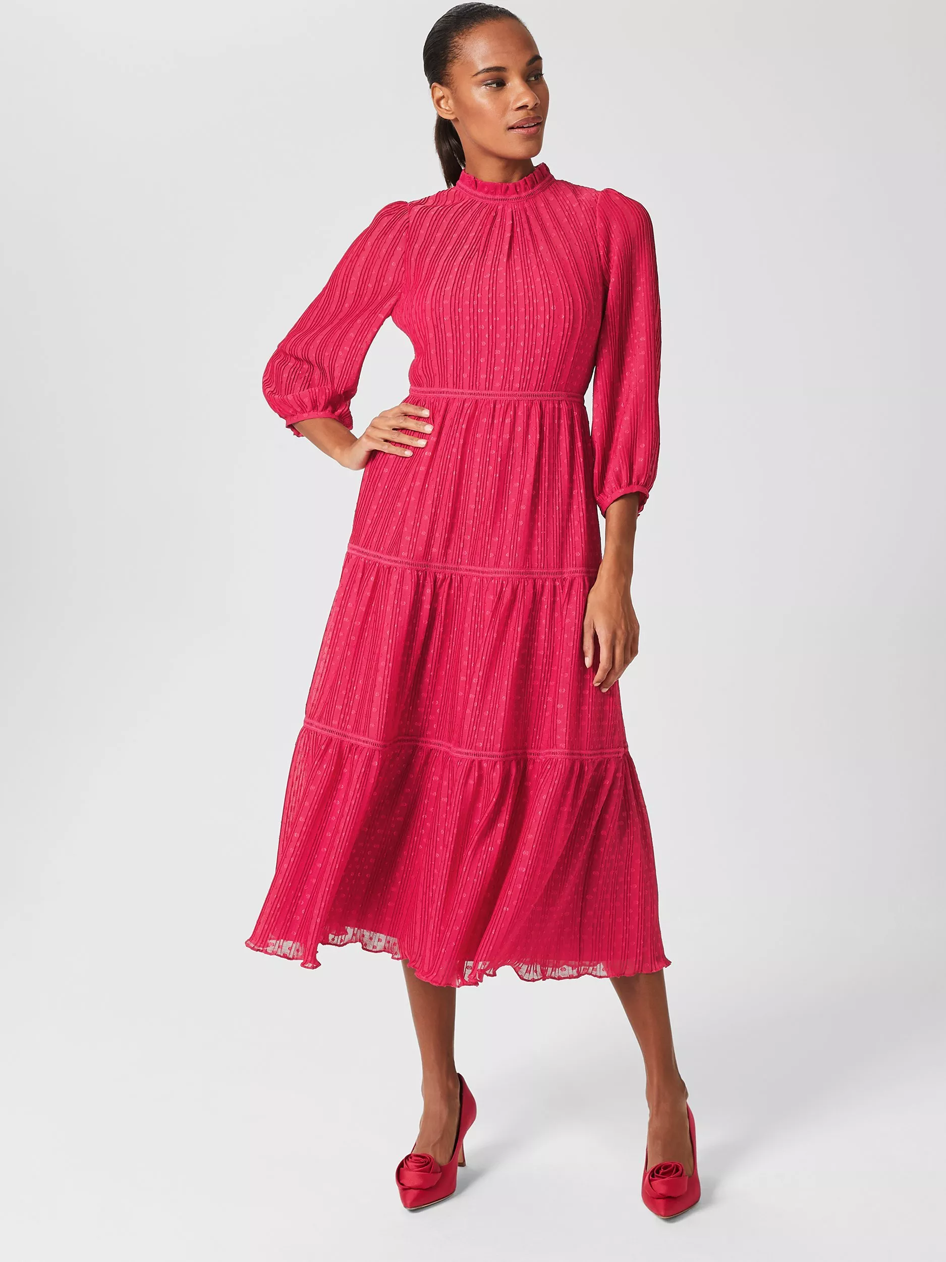Flaring out at the hem for a feminine silhouette, this midi dress by Hobbs has a understated texture of stripes and spots.