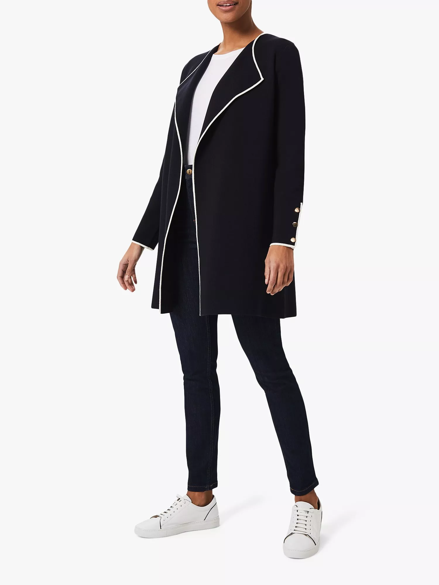 A stylish alternative to a coat. In a longer line, the Darcy coatigan is shaped by shawl lapels and detailed with contrast tipping and gold button cuffs for a nautical feel. Endlessly versatile, slip it on over jeans and a tee or pair it with work dresses when the office beckons. Made from LENZING ECOVERO sustainable viscose jersey.