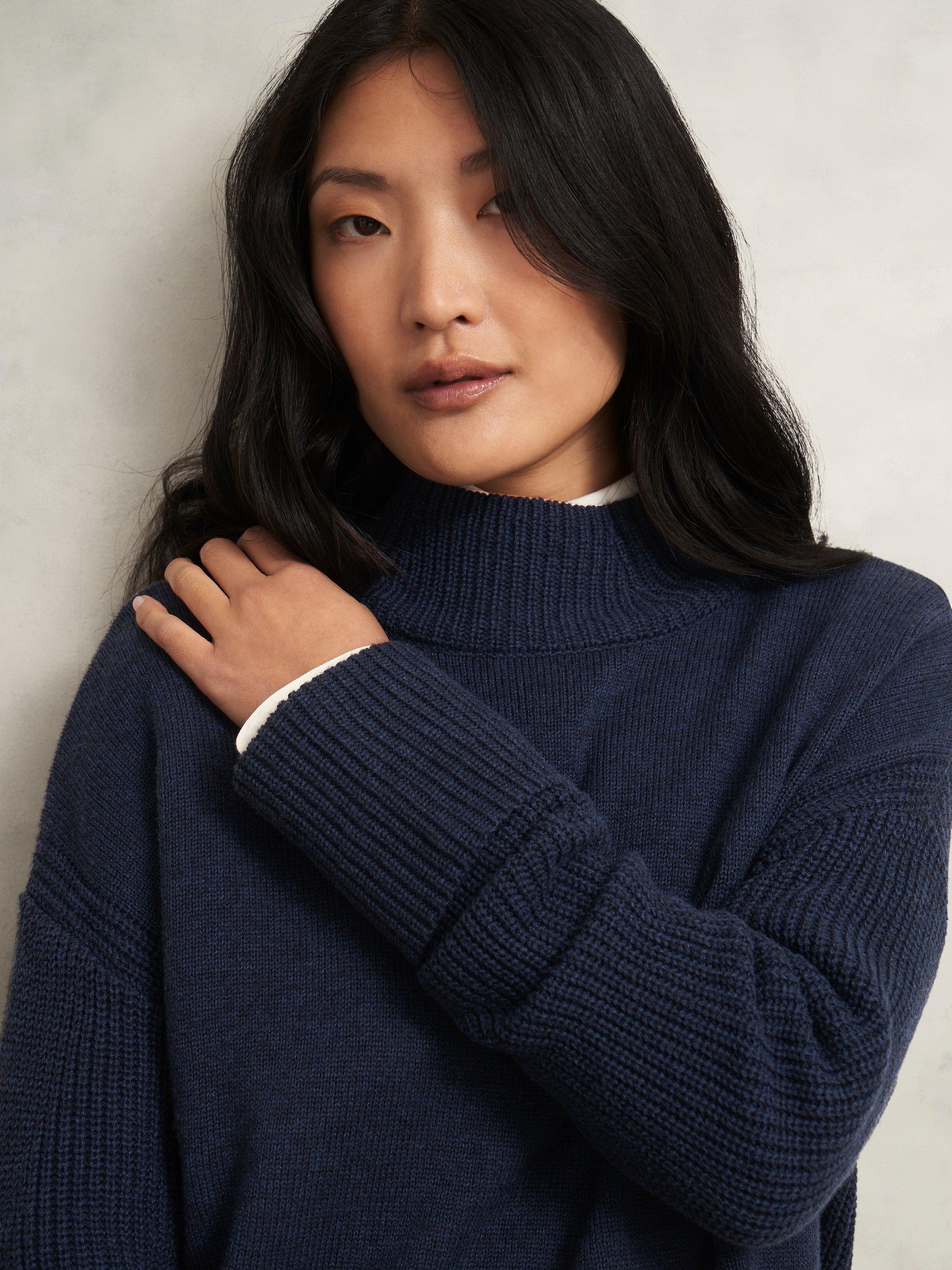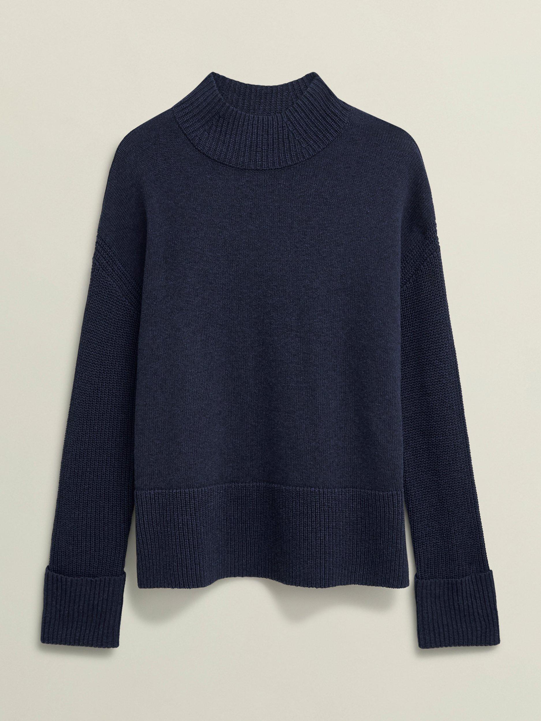 A reliable knit, the Gaskell jumper is made in a Merino wool blend. Cut in a relaxed fit with a high neck, ribbed sleeves and trims, and side splits.