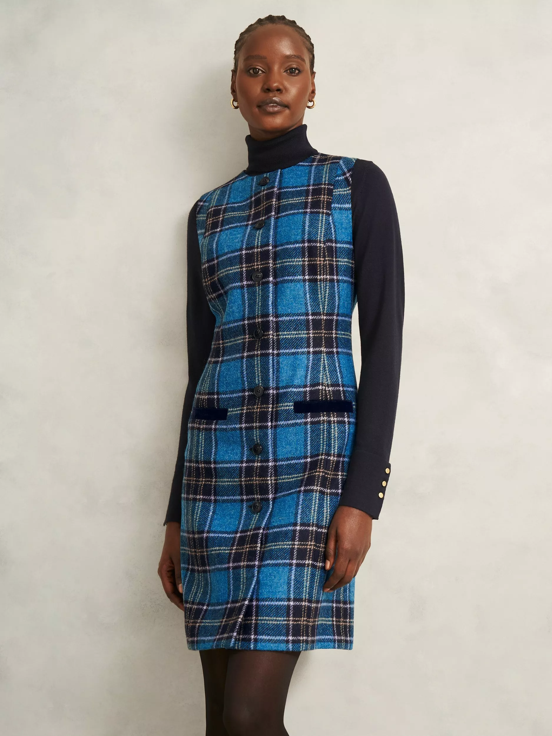 Hallmarking their heritage, Hobbs's Joella dress features British-woven wool and a timeless check. Fully lined with non-functional buttons.
