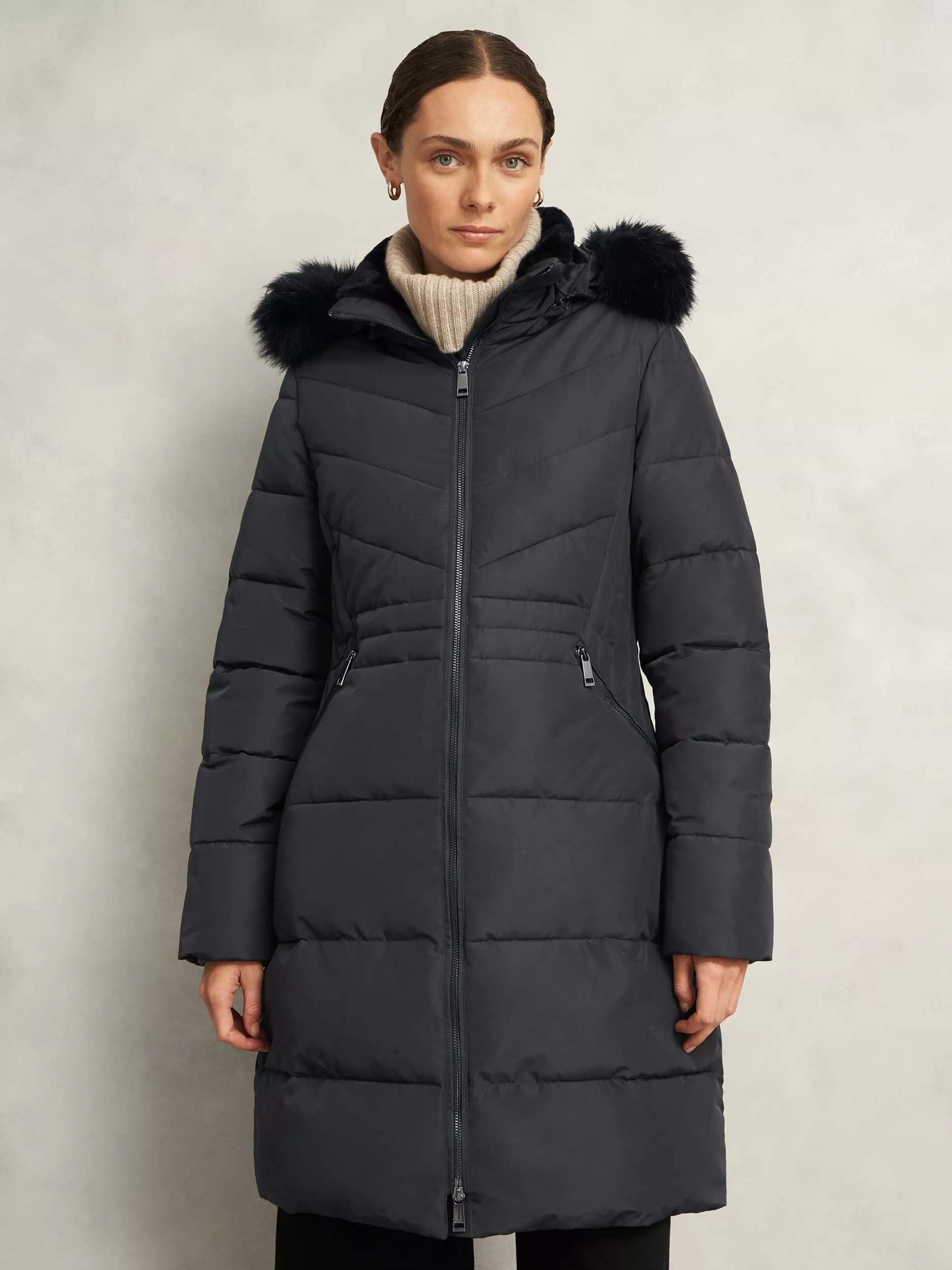 Reimagining the brand's bestselling silhouette with cleverly-placed padding that flatters every shape, it's time to meet the newest coat on the Hobbs block, Kaia. Designed with a shower-resistant coating, stand collar with removable faux-fur hood, fitted waist panels, ribbed cuffs, and fleece-lined zip pockets.