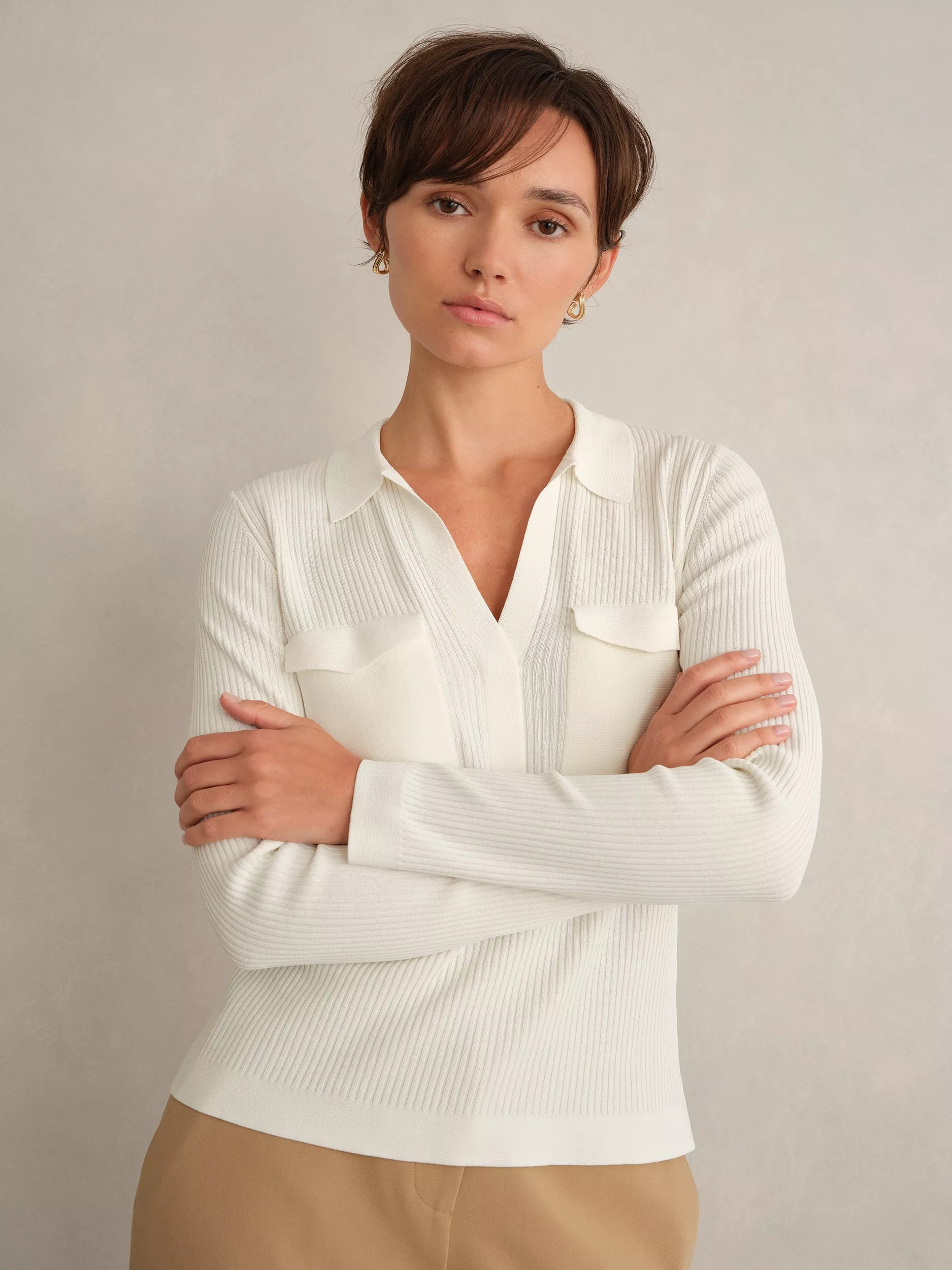 This patch pocket ribbed jumper pairs a sharp collar with a plain knit, making your daily wardrobe refreshingly easy. Its medium weight and soft viscose blend keep you comfortable.
