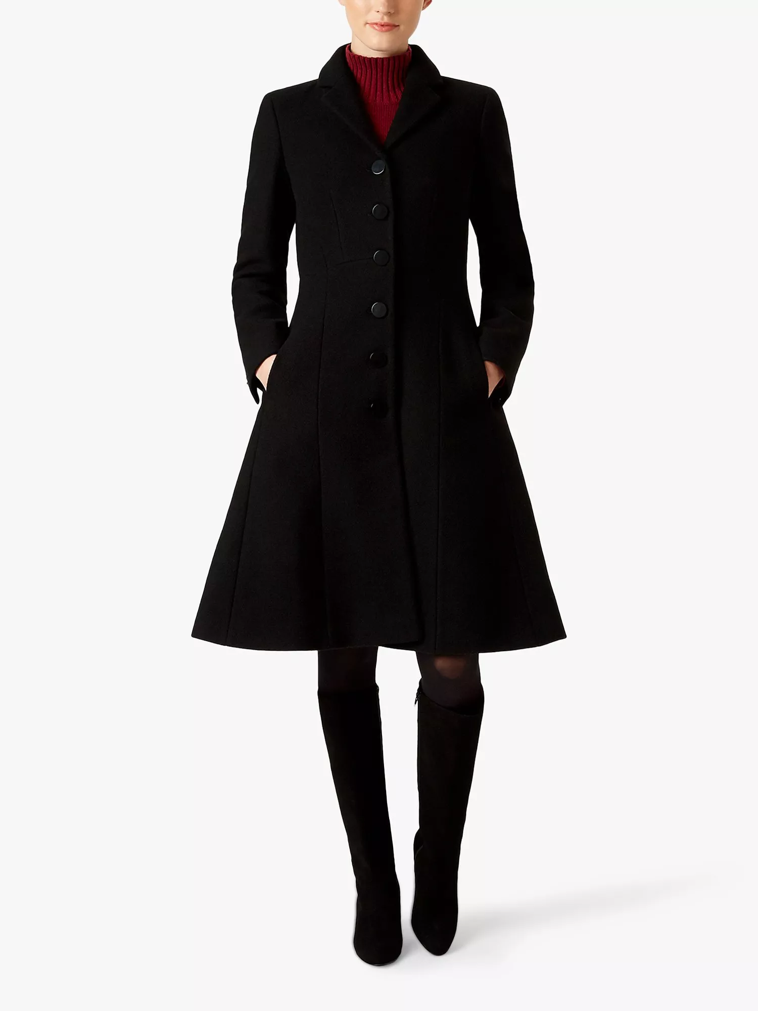 In a flattering fit and flare silhouette, the Milly coat from Hobbs features a full, knee-length skirt for an hourglass shape you'll love. Crafted from wool-rich fabric for extra warmth, slip pockets add a practical touch.