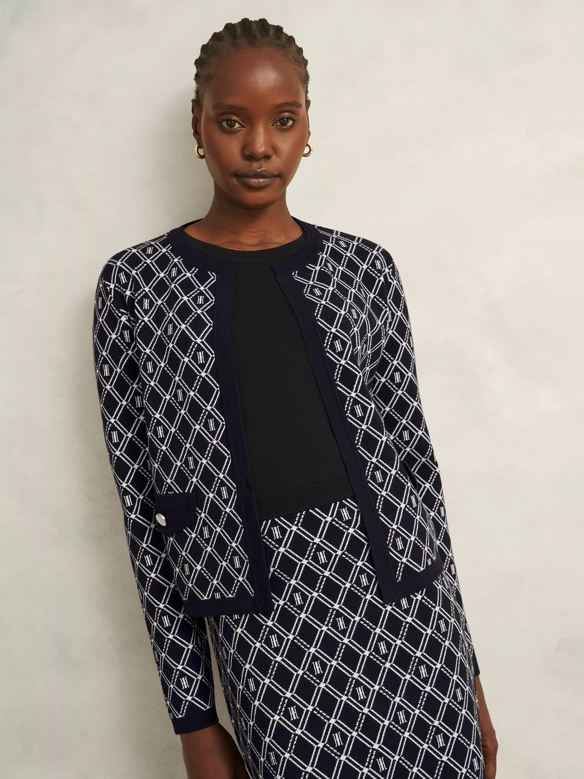 Framed with an open neckline and long sleeves, this mid-weight jacket features a smart logo pattern. Practical for daily wear, its soft viscose blended knit offers comfort.