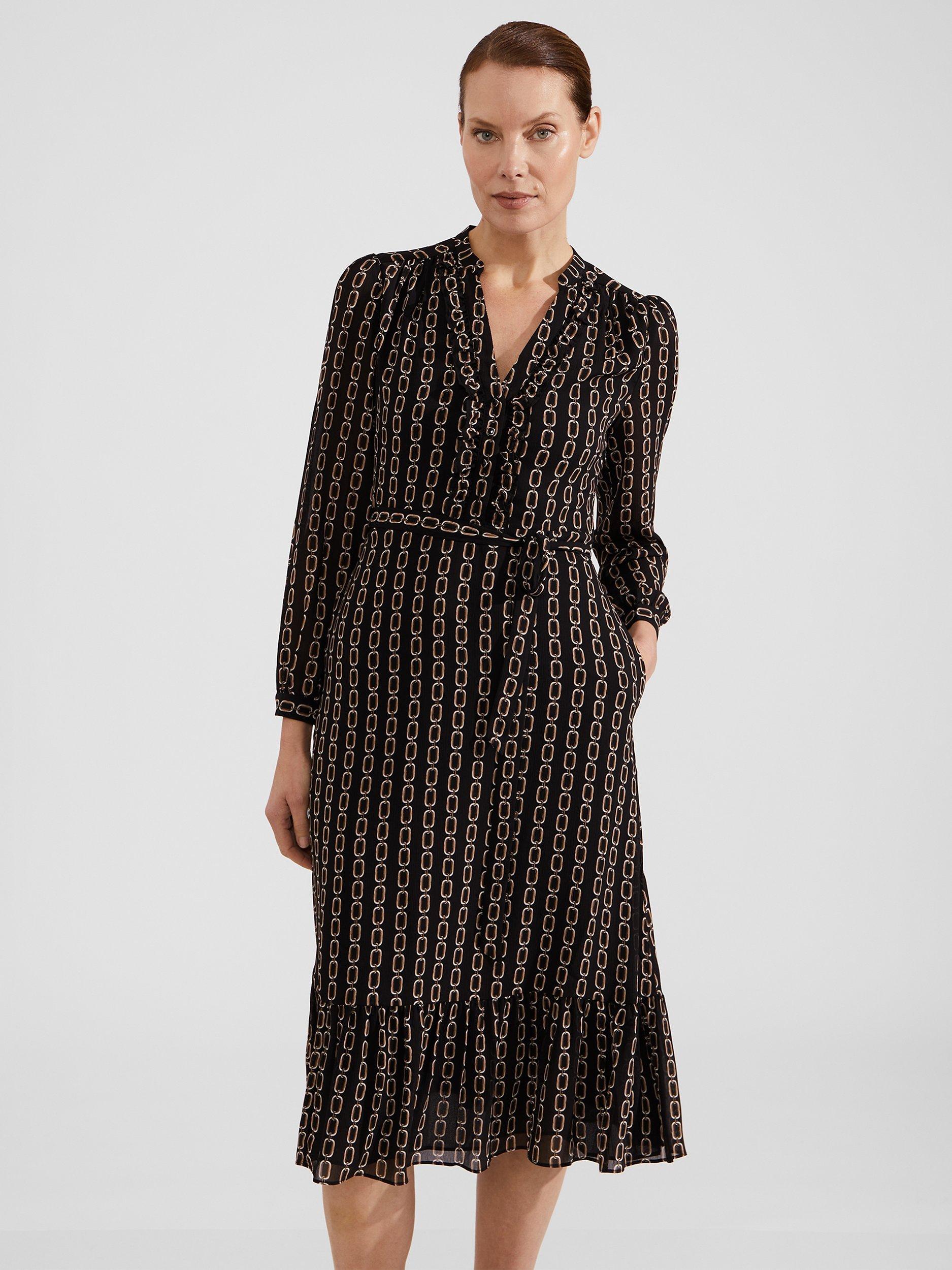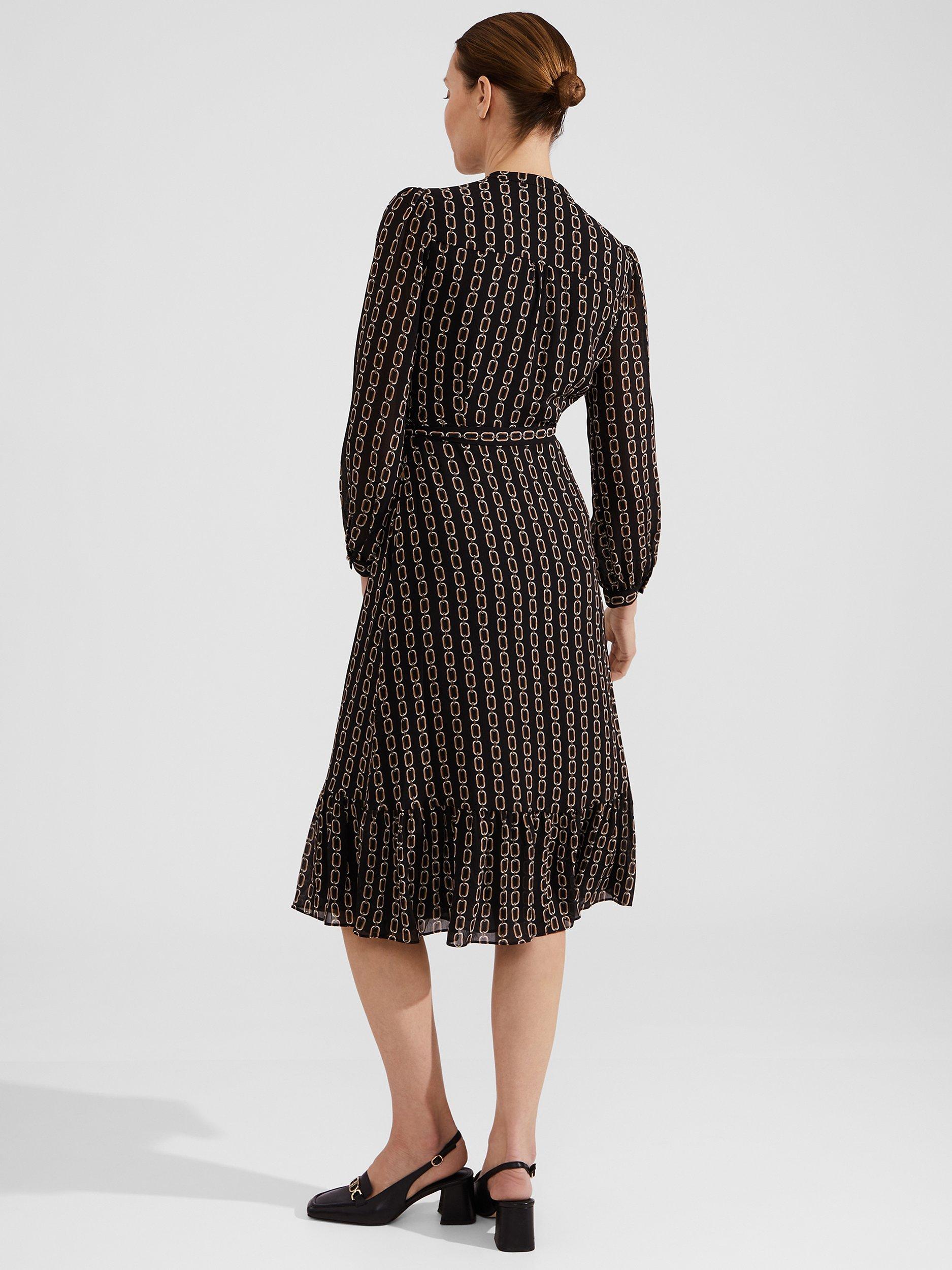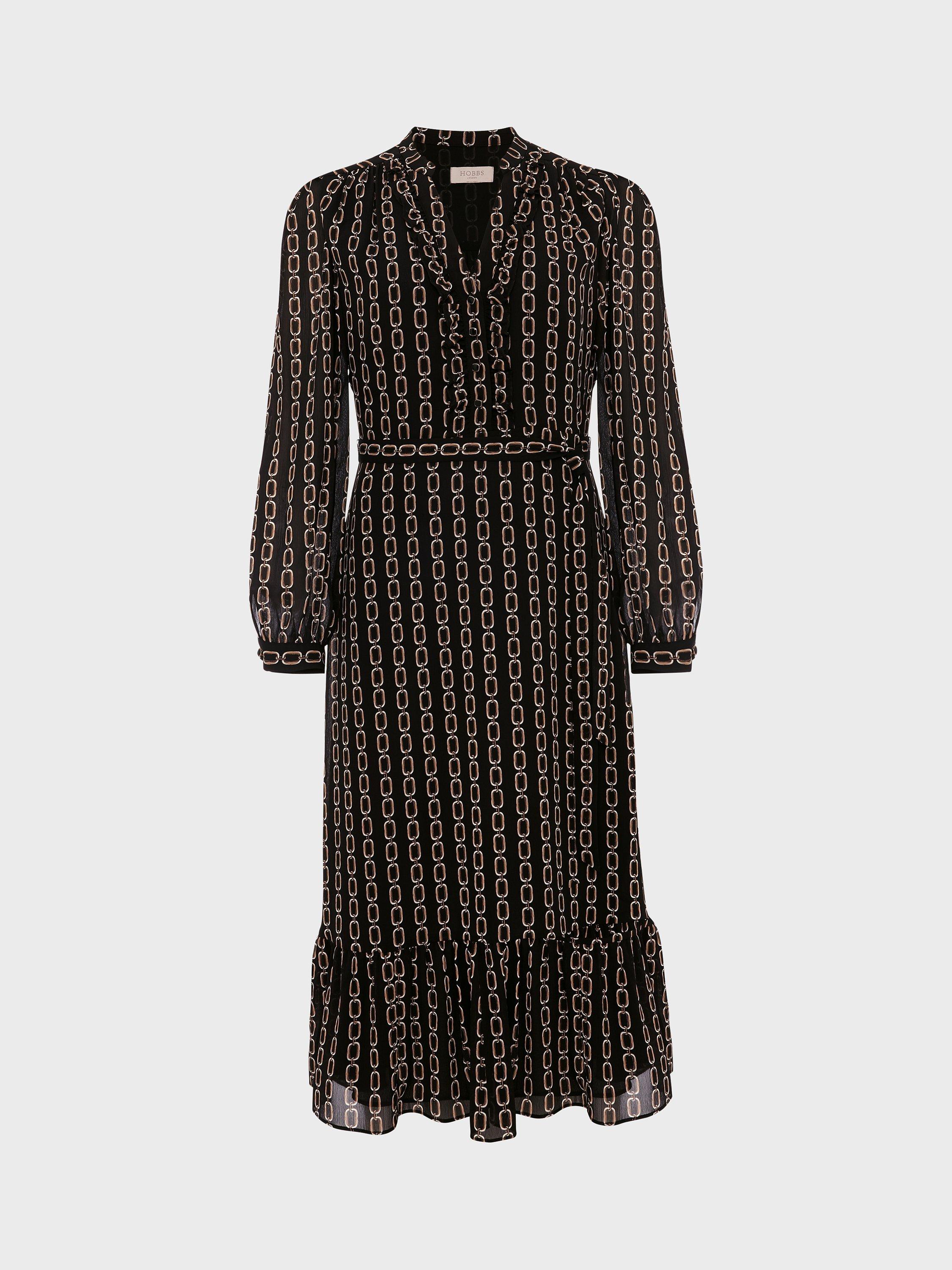 A tried-and-true favourite, this knee length dress from Hobbs is made using a synthetic fabric. With a fuss-free but smart v-neckline and full-length sleeves, this style is splattered with an abstract print.