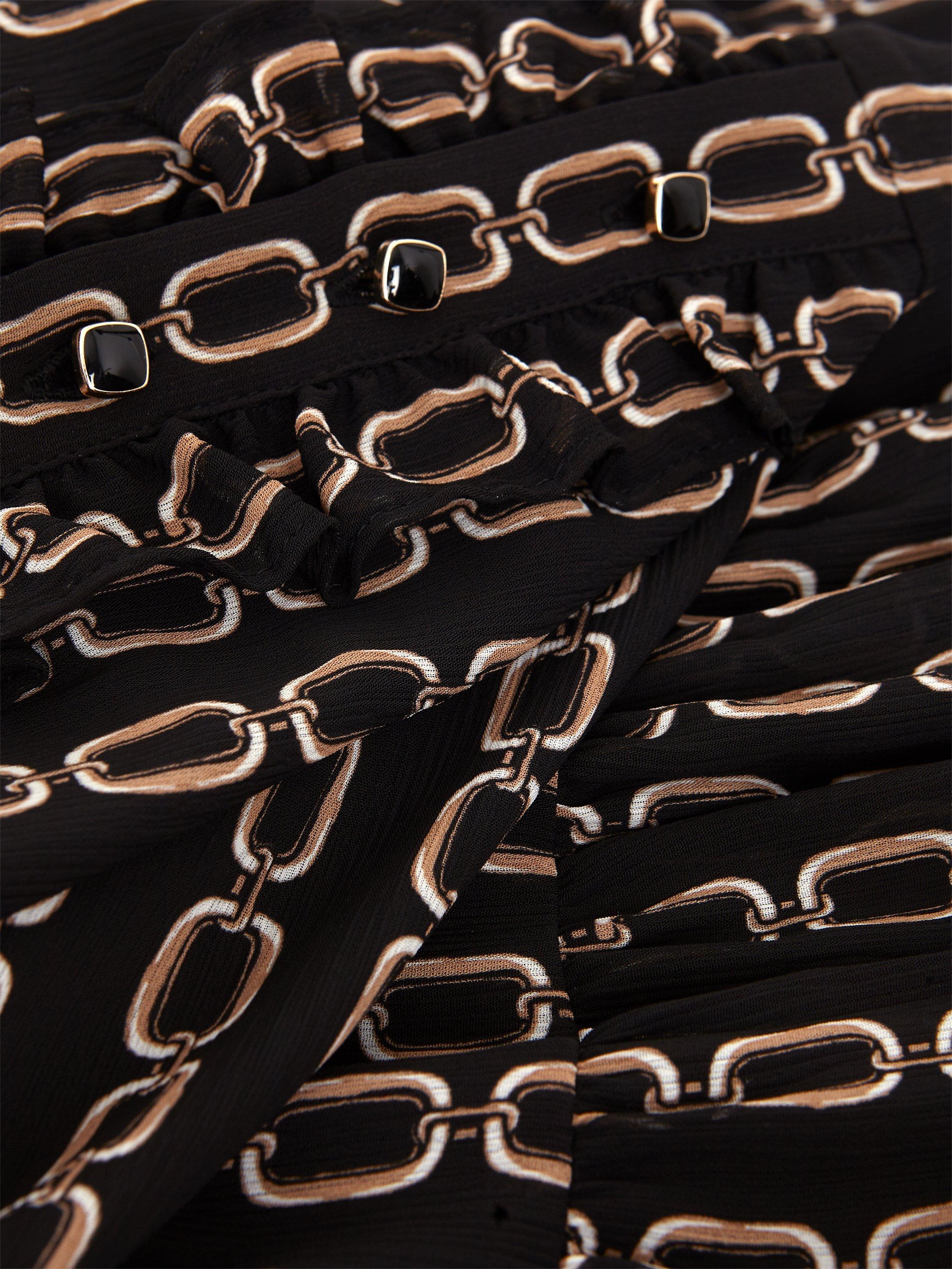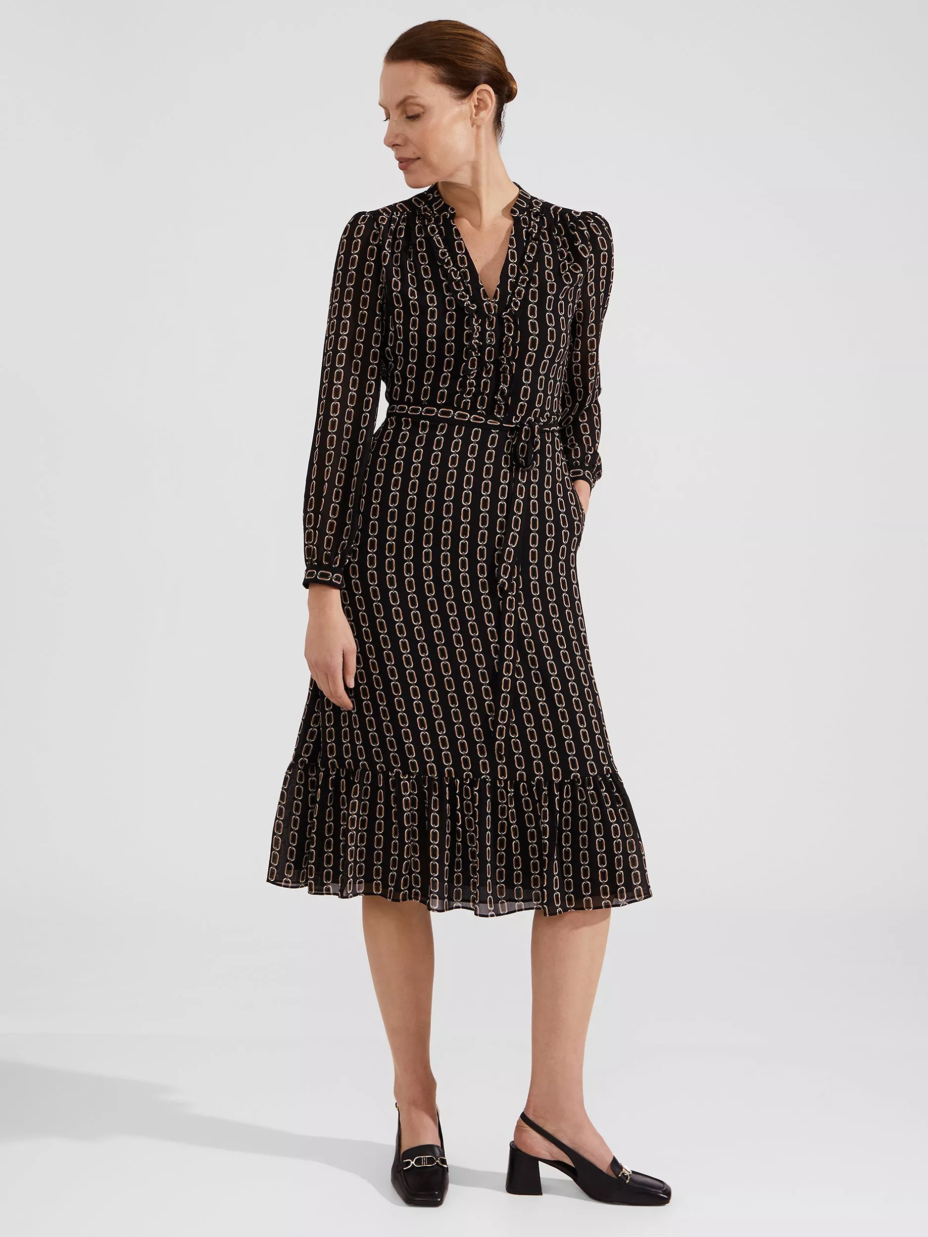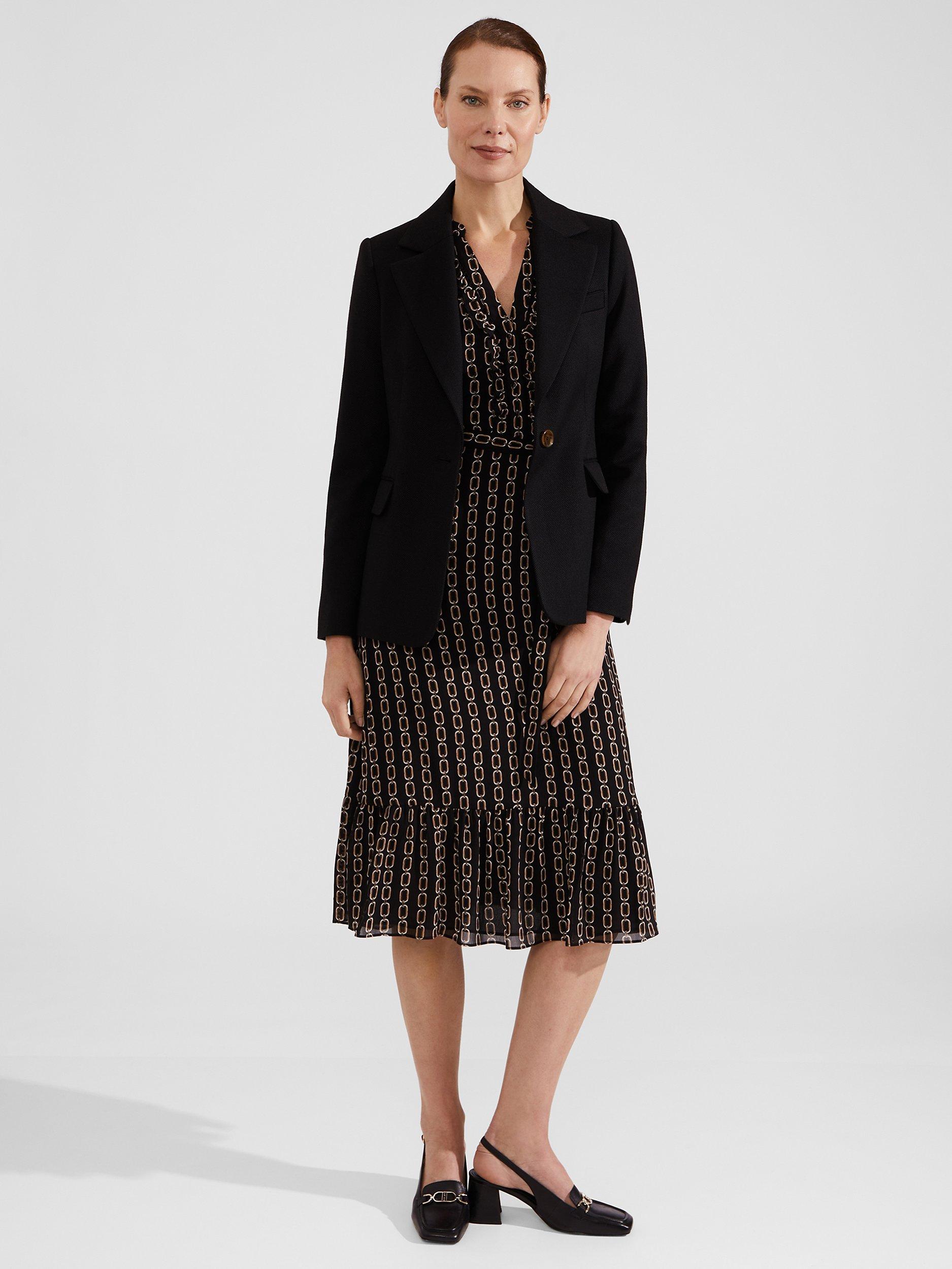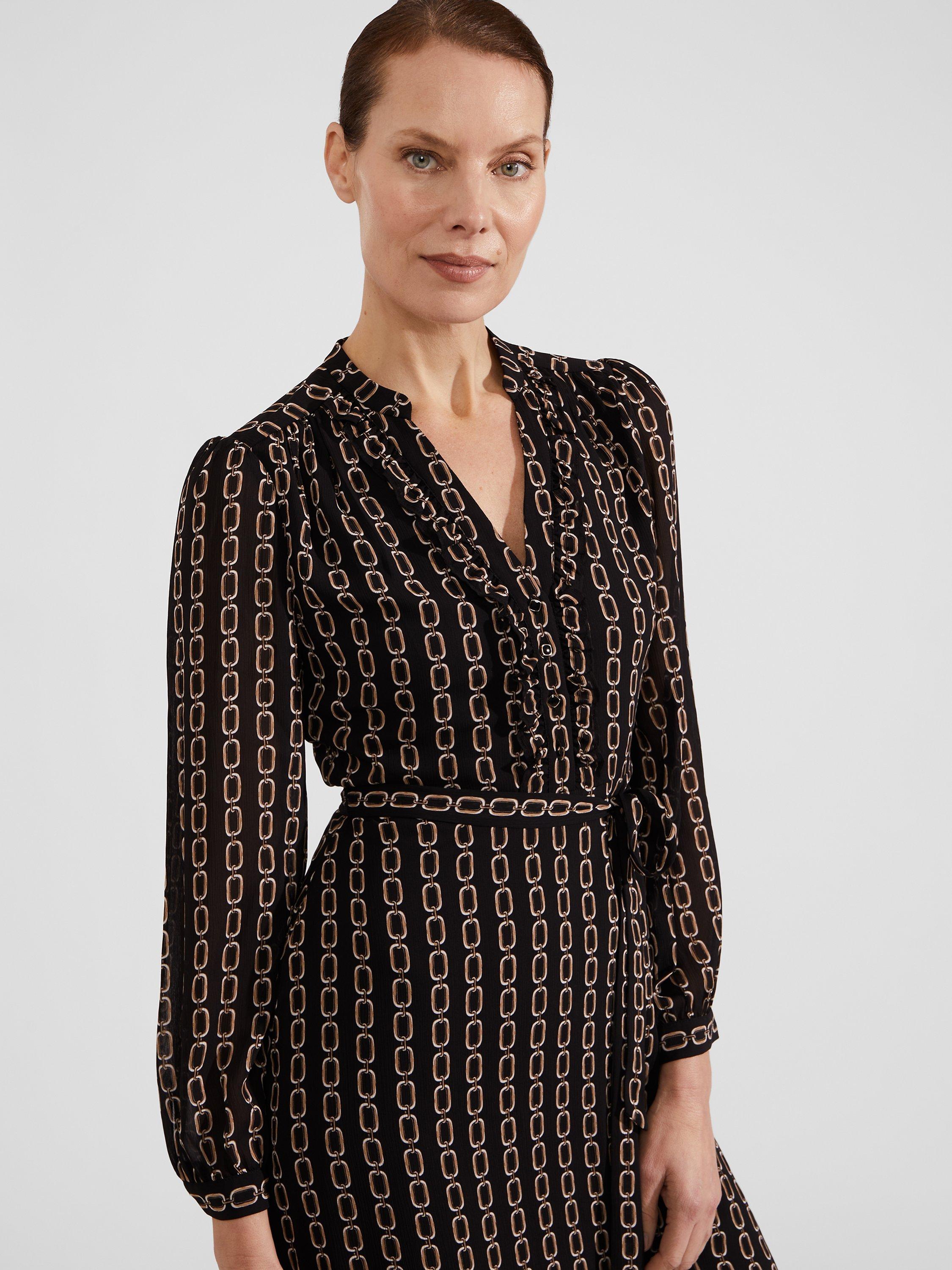 A tried-and-true favourite, this knee length dress from Hobbs is made using a synthetic fabric. With a fuss-free but smart v-neckline and full-length sleeves, this style is splattered with an abstract print.