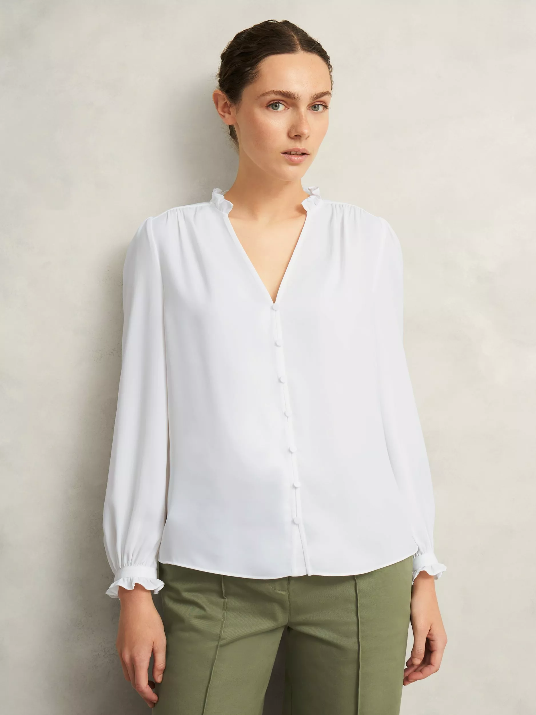 A chic undersuiter or feminine layer, the Rosalie blouse is accented with frill trims for a romantic finish.