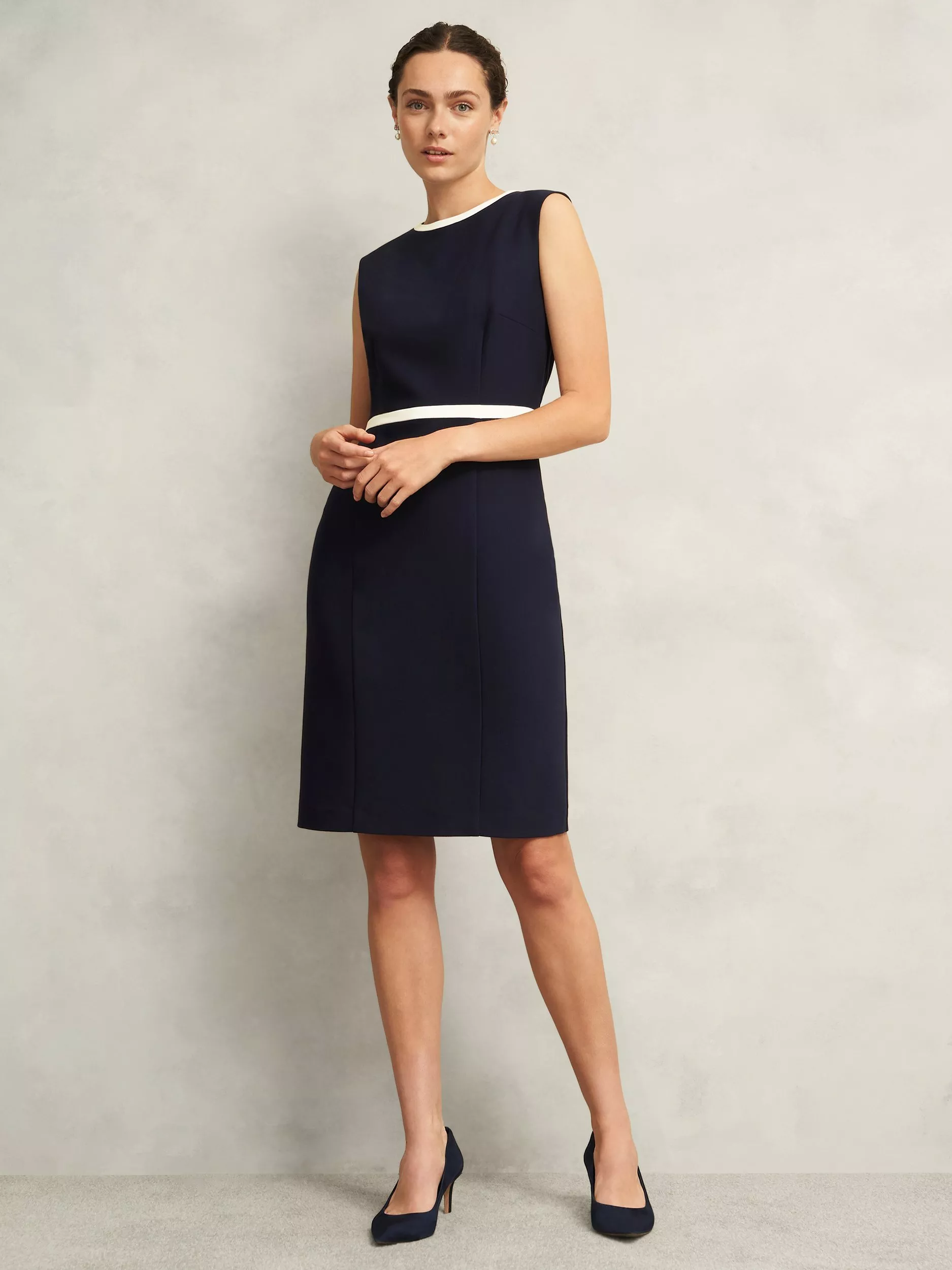 Updating the signature shift silhouette with contrast trims, the Sally dress redefines workwear with a modern edge.