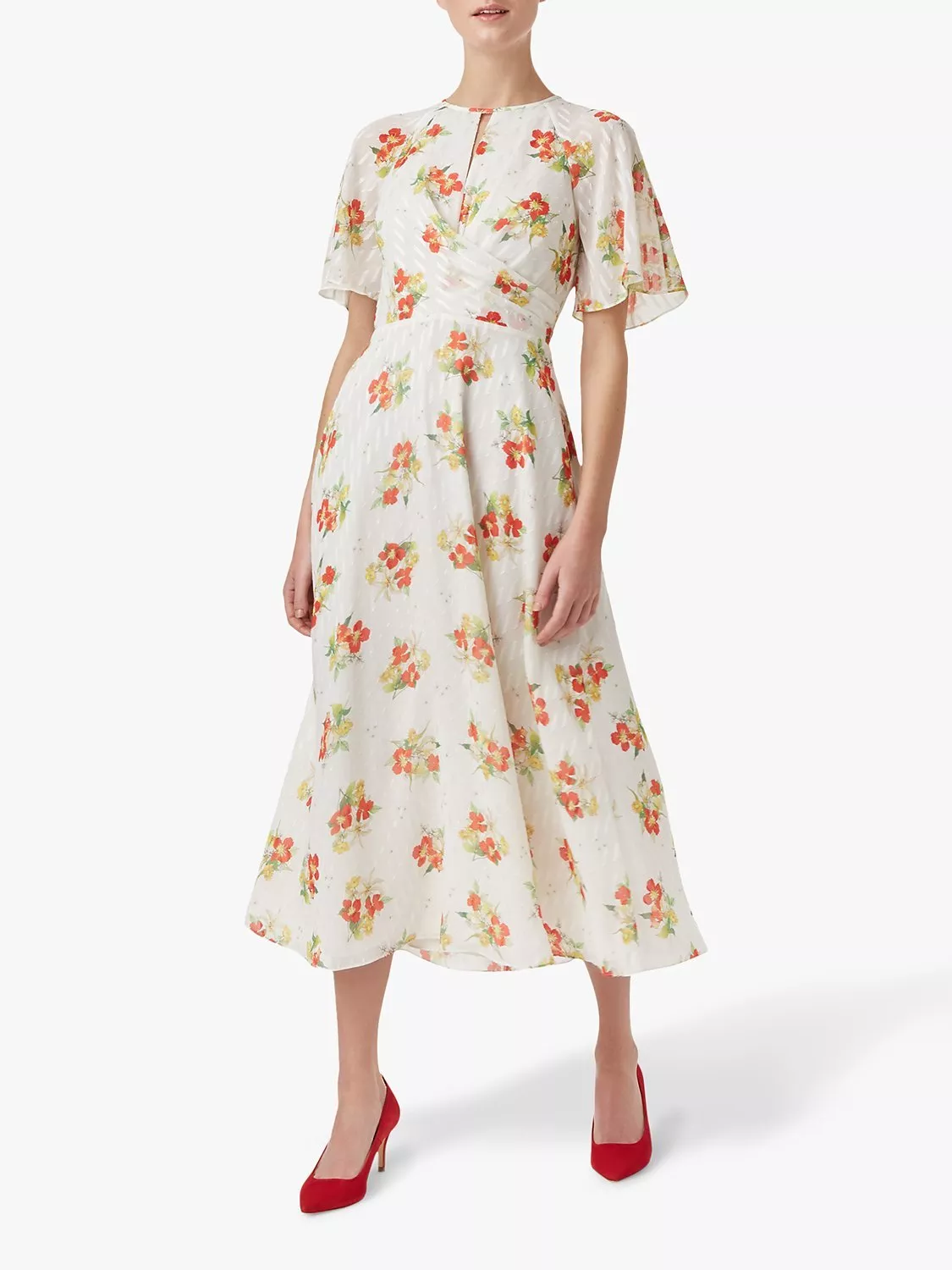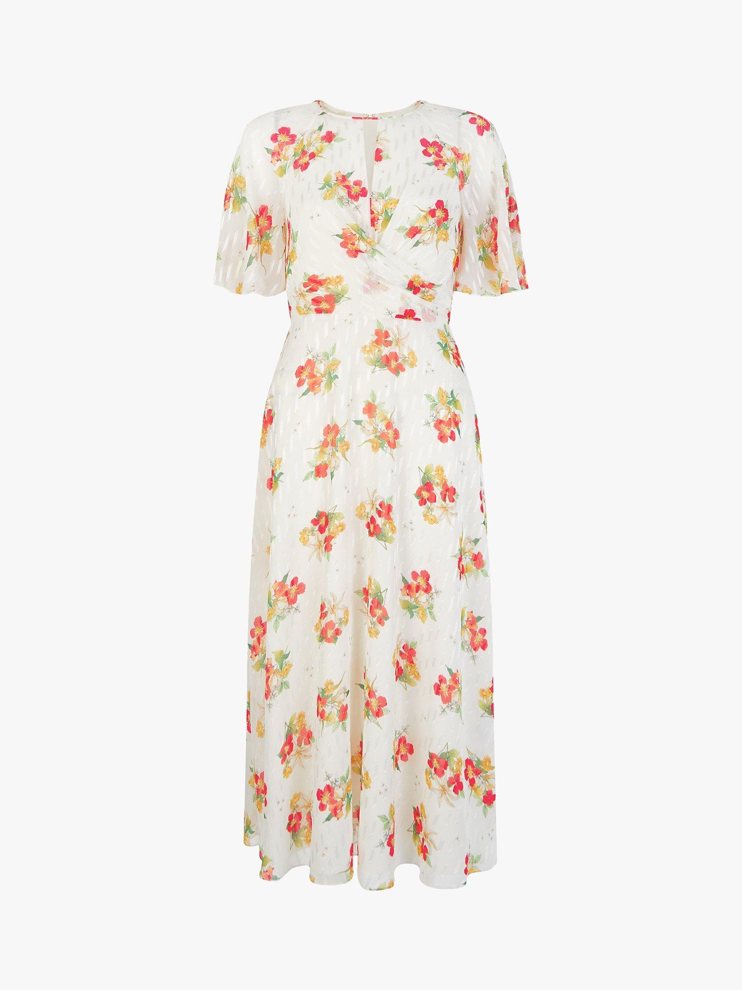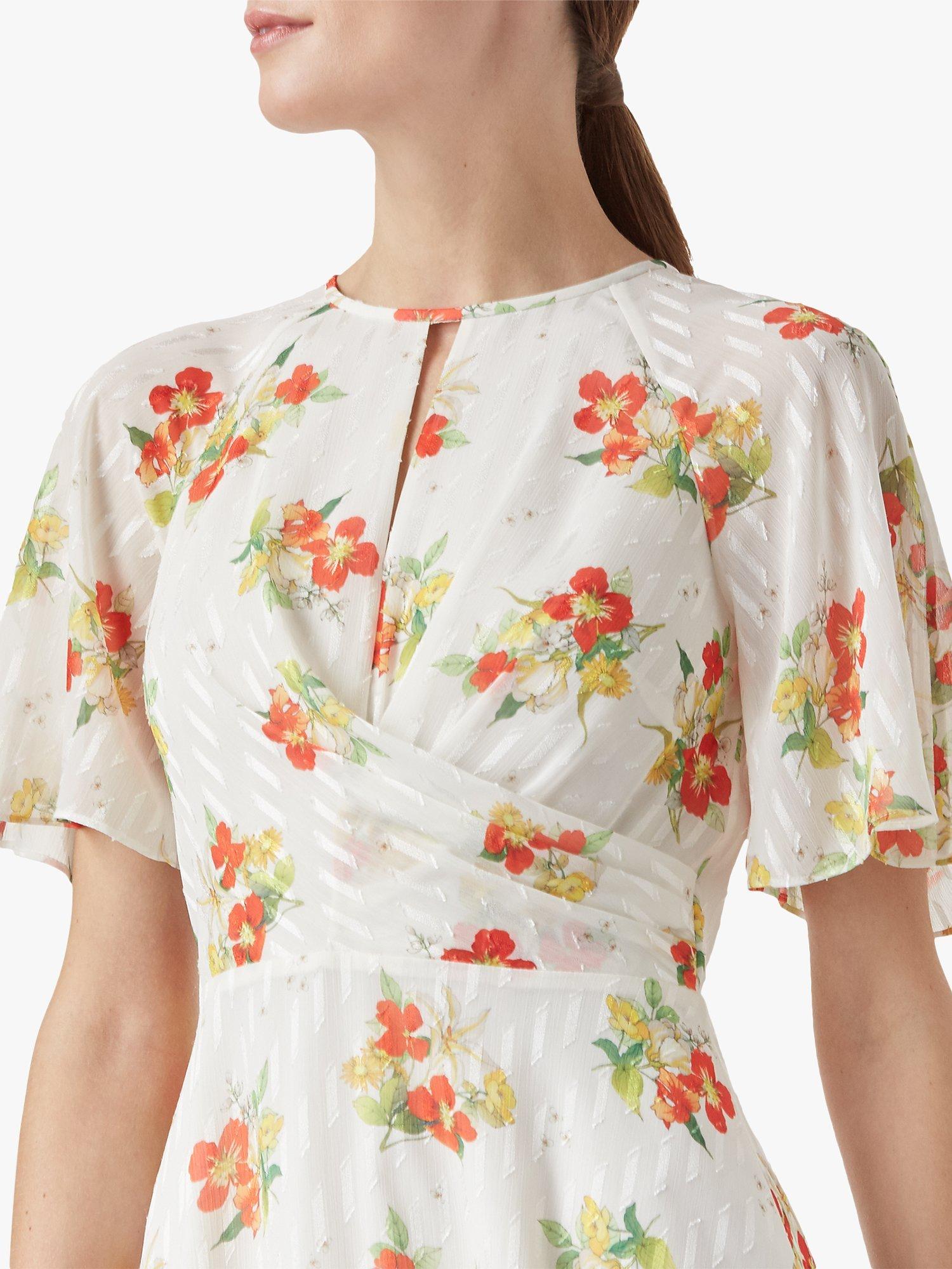 Cut from lustrous jacquard, it features a beautiful meadow flower print, twist waist detail and feminine fluted sleeves, the A-line skirt falls into an on-trend midi length.