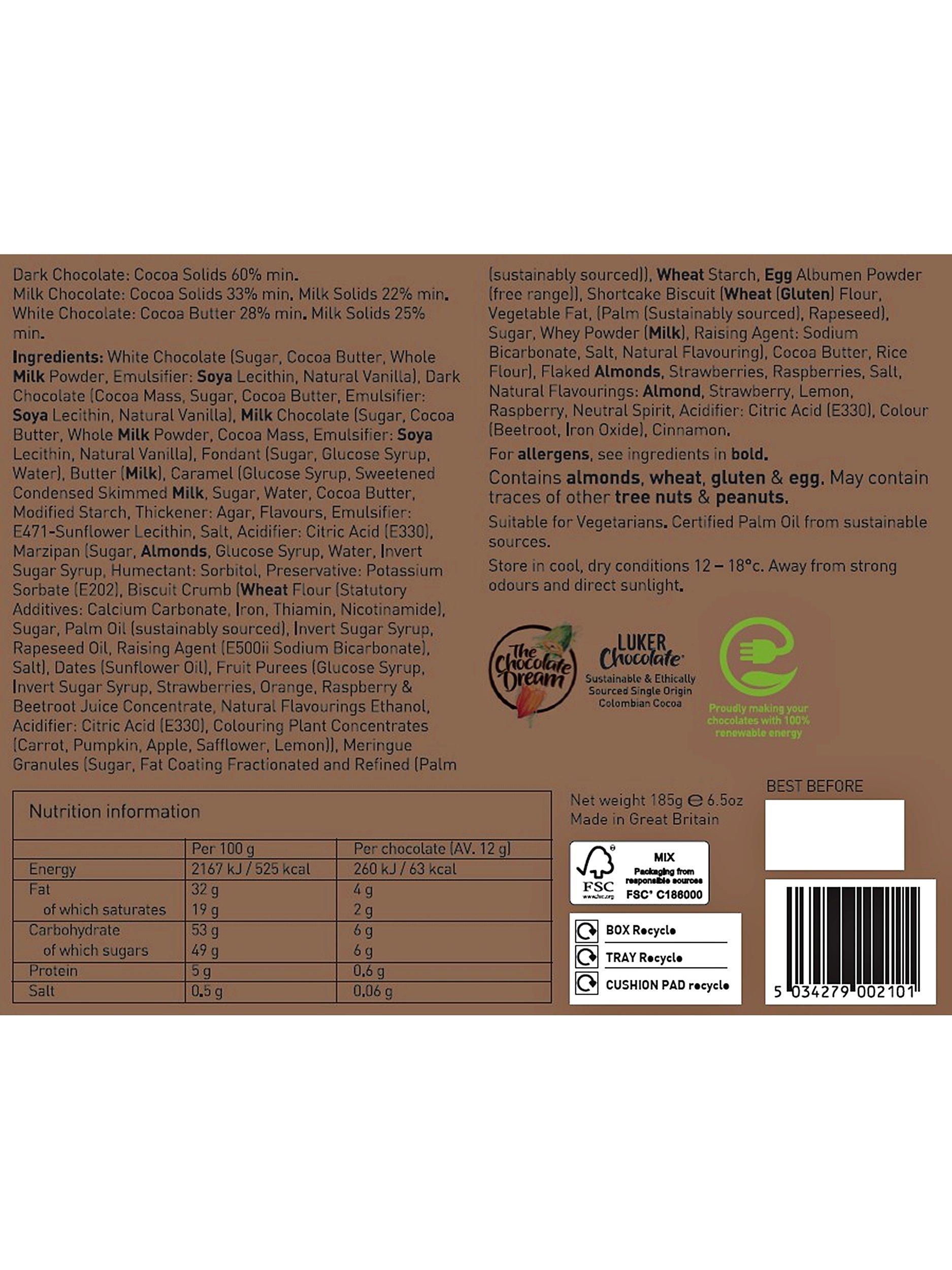 - White Chocolate (Sugar, Cocoa Butter, Whole MILK Powder, Emulsifier: SOYA Lecithin, Natural Vanilla), Dark Chocolate (Cocoa Mass, Sugar, Cocoa Butter, Emulsifier: SOYA Lecithin, Natural Vanilla), MILK Chocolate (Sugar, Cocoa Butter, Whole MILK Powder, Cocoa Mass, Emulsifier: SOYA Lecithin, Natural Vanilla), Fondant (Sugar, Glucose Syrup, Water), Butter (MILK), Caramel (Glucose Syrup, Sweetened Condensed Skimmed MILK, Sugar, Water, Cocoa Butter, Modified Starch, Thickener: Agar, Flavours, Emulsifier: E471-Sunflower Lecithin, Salt, Acidifier: Citric Acid (E330), Marzipan (Sugar, ALMONDS, Glucose Syrup, Water, Invert Sugar Syrup, Humectant: Sorbitol, Preservative: Potassium Sorbate (E202), Biscuit Crumb (WHEAT Flour (Statutory Additives: Calcium Carbonate, Iron, Thiamine, Nicotinamide), Sugar, Palm Oil (sustainably sourced), Invert Sugar Syrup, Rapeseed Oil, Raising Agent (E500ii Sodium Bicarbonate), Salt), Dates (Sunflower Oil), Fruit Purees (Glucose Syrup, Invert Sugar Syrup, Strawberries, Orange, Raspberry & Beetroot Juice Concentrate, Natural Flavourings Ethanol, Acidifier: Citric Acid (E330), Colouring Plant Concentrates (Carrot, Pumpkin, Apple, Safflower, Lemon)), Meringue Granules (Sugar, Fat Coating Fractionated and Refined (Palm (sustainably sourced)), WHEAT Starch, EGG Albumen Powder (free range)), Shortcake Biscuit (WHEAT (GLUTEN) Flour, Vegetable Fat, (Palm (Sustainably sourced), Rapeseed), Sugar, Whey Powder (MILK), Raising Agent: Sodium Bicarbonate, Salt, Natural Flavouring), Cocoa Butter, Rice Flour), Flaked ALMONDS, Strawberries, Raspberries, Salt, Natural Flavourings: ALMOND, Strawberry, Lemon, Raspberry, Neutral Spirit, Acidifier: Citric Acid (E330), Colour (Beetroot, Iron Oxide), Cinnamon. For allergens, see ingredients in capitals.