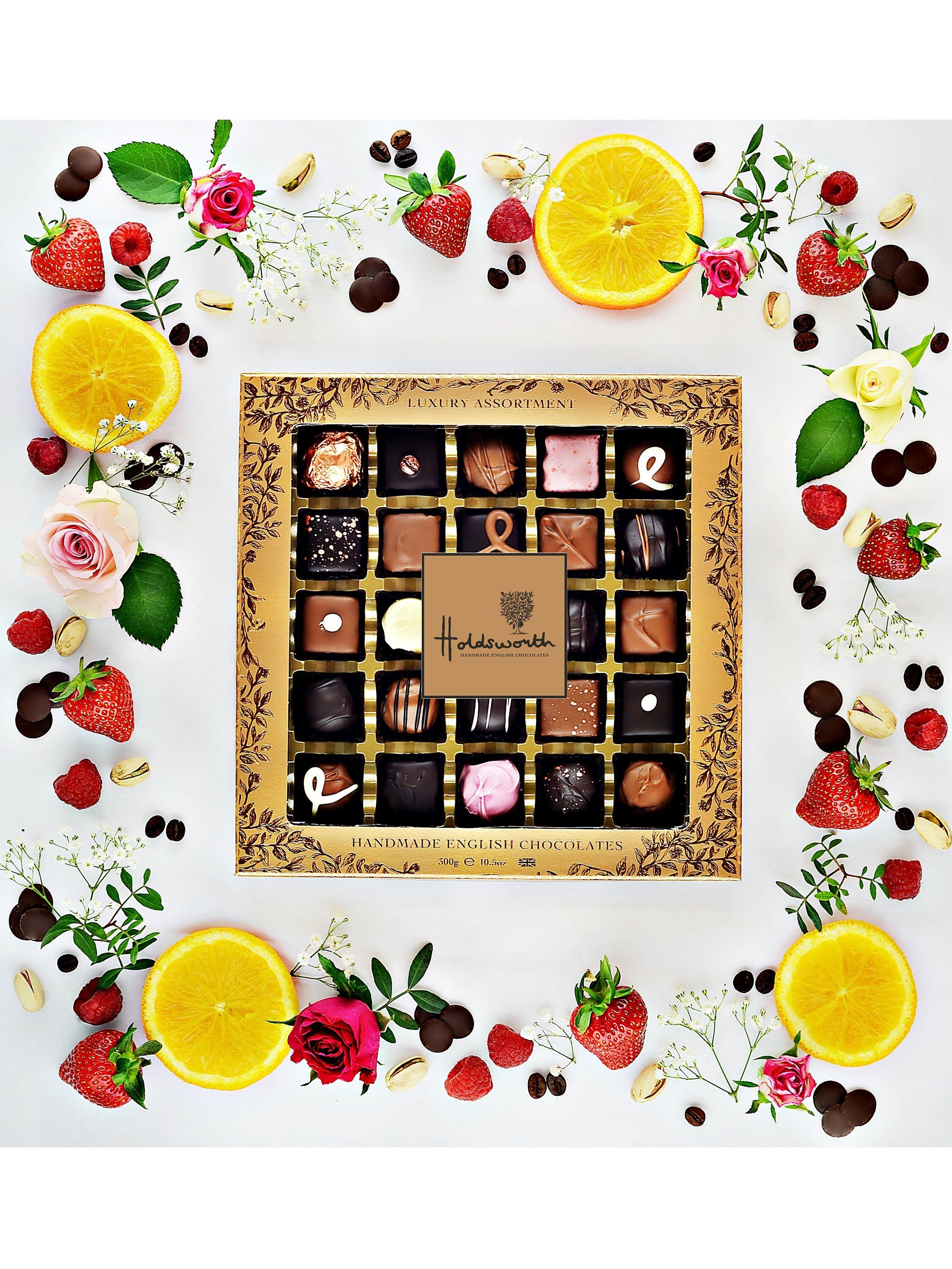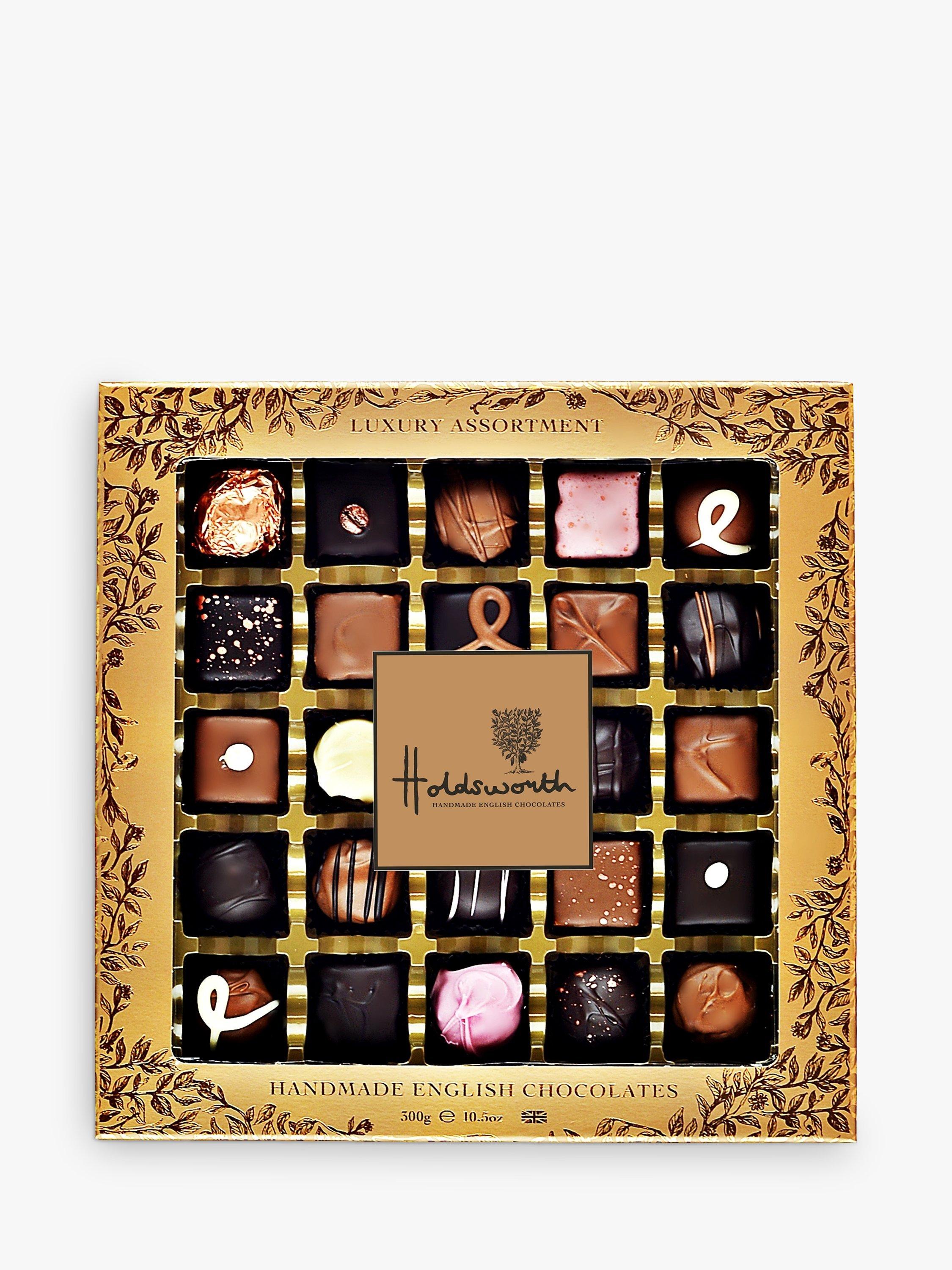 A luxury collection of assorted handmade chocolates, presented in a stunning brass embossed window box.