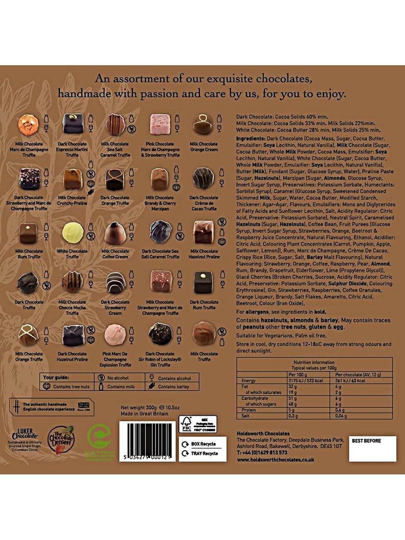 Milk Chocolate Marc de Champagne Truffle; Dark Chocolate Espresso Martini Truffle; Milk Chocolate Sea Salt Caramel Truffle; Pink Strawberry & Marc de Champagne Truffle with Popping Candy; Milk Chocolate Orange Cream; Dark Chocolate Strawberry & Marc de Champagne Truffle with Popping Candy; Milk Chocolate Crunchy Praline; Dark Chocolate Orange Truffle; Milk Chocolate Brandy & Cherry Marzipan; Dark Chocolate Creme de Cacao Truffle; Milk Chocolate Rum Truffl; White Chocolate Truffle; Milk Chocolate Coffee Cream; Dark Chocolate Sea Salt Caramel Truffle; Milk Chocolate Hazelnut Praline; Dark Chocolate Truffle; Milk Chocolate Chocca Mocha Truffle; Dark Chocolate Strawberry Cream; Milk Chocolate Strawberry & Marc de Champagne Truffle with Popping Candy; Dark Chocolate Rum Truffle; Milk Chocolate Orange Truffle; Dark Chocolate Hazelnut Praline; Pink Marc de Champagne Explosion Truffle; Dark Chocolate Sir Robin of Locksley Gin Truffle; 1 x Milk Chocolate Truffle.