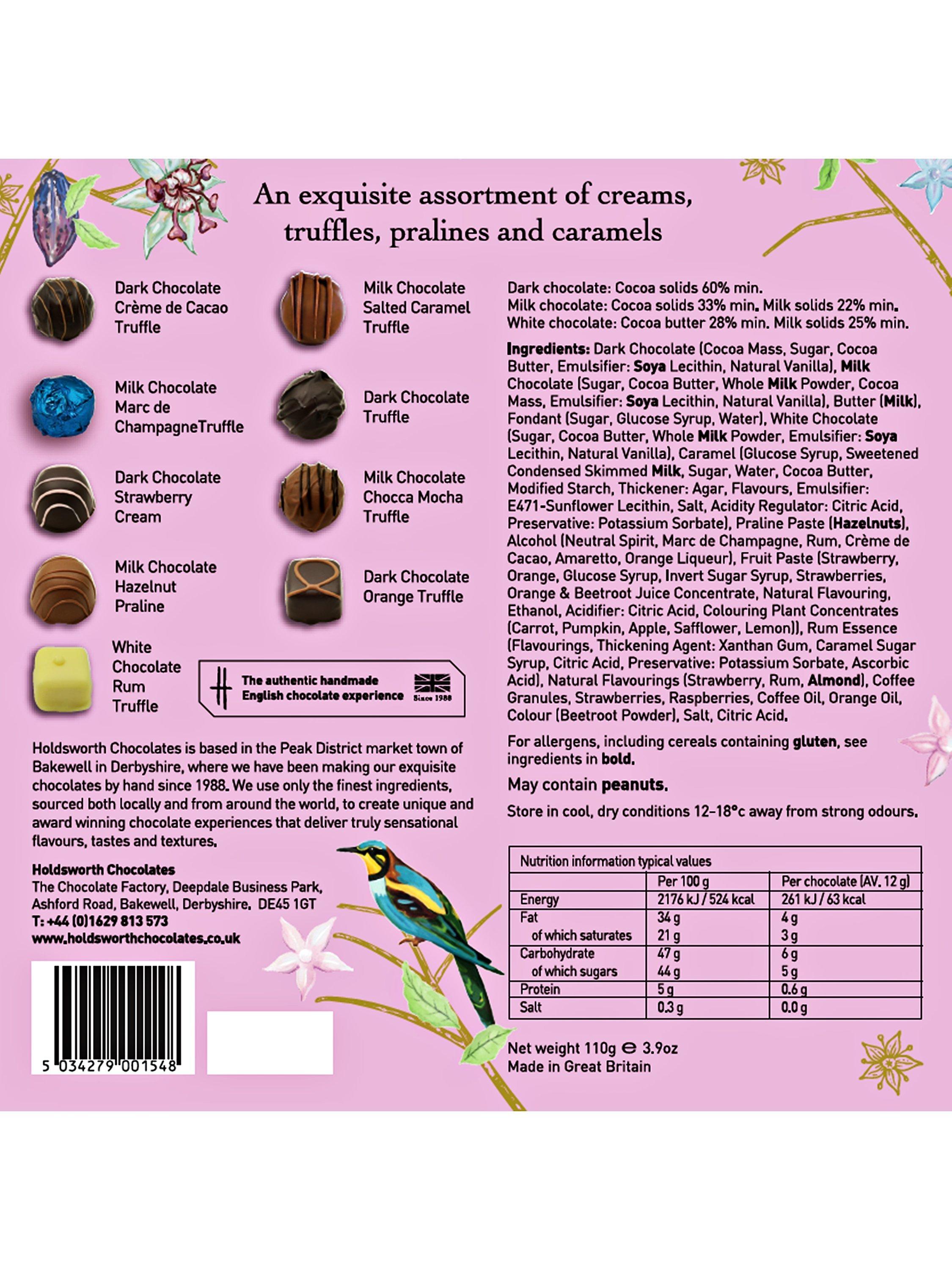 - Dark Chocolate (Cocoa Mass, Sugar, Cocoa Butter, Emulsifier: SOYA Lecithin, Natural Vanilla), MILK Chocolate (Sugar, Cocoa Butter, Whole MILK Powder, Cocoa Mass, Emulsifier: SOYA Lecithin, Natural Vanilla), Butter (MILK), Fondant (Sugar, Glucose Syrup, Water), White Chocolate (Sugar, Cocoa Butter, Whole MILK Powder, Emulsifier: SOYA Lecithin, Natural Vanilla), Caramel (Glucose Syrup, Sweetened Condensed Skimmed MILK, Sugar, Water, Cocoa Butter, Modified Starch, Thickener: Agar, Flavours, Emulsifier: E471-Sunflower Lecithin, Salt, Acidit Regulator: Citric Acid, Preservative: Potassium Sorbate), Praline Paste (HAZELNUTS), Alcohol (Neutral Spirit, Marc de Champagne, Rum, Creme de Cacao, Amaretto, Orange Liqueur), Fruit Paste (Strawberry, Orange, Glucose Syrup, Invert Sugar Syrup, Strawberries, Orange & Beetroot Juice Concentrate, Natural Flavouring, Ethanol, Acidifier: Citric Acid, Colouring Plant Concentrates (Carrot, Pumpkin, Apple, Safflower, Lemon)), Rum Essence (Flavourings, Thickening Agent: Xanthan Gum, Caramel Sugar Syrup, Citric Acid, Preservative: Potassium Sorbate, Ascorbic Acid), Natural Flavourings (Strawberry, Rum, ALMOND), Coffee Granules, Strawberries, Raspberries, Coffee Oil, Orange Oil, Colour (Beetroot Powder), Salt, Citric Acid. For allergens, see ingredients in capitals.