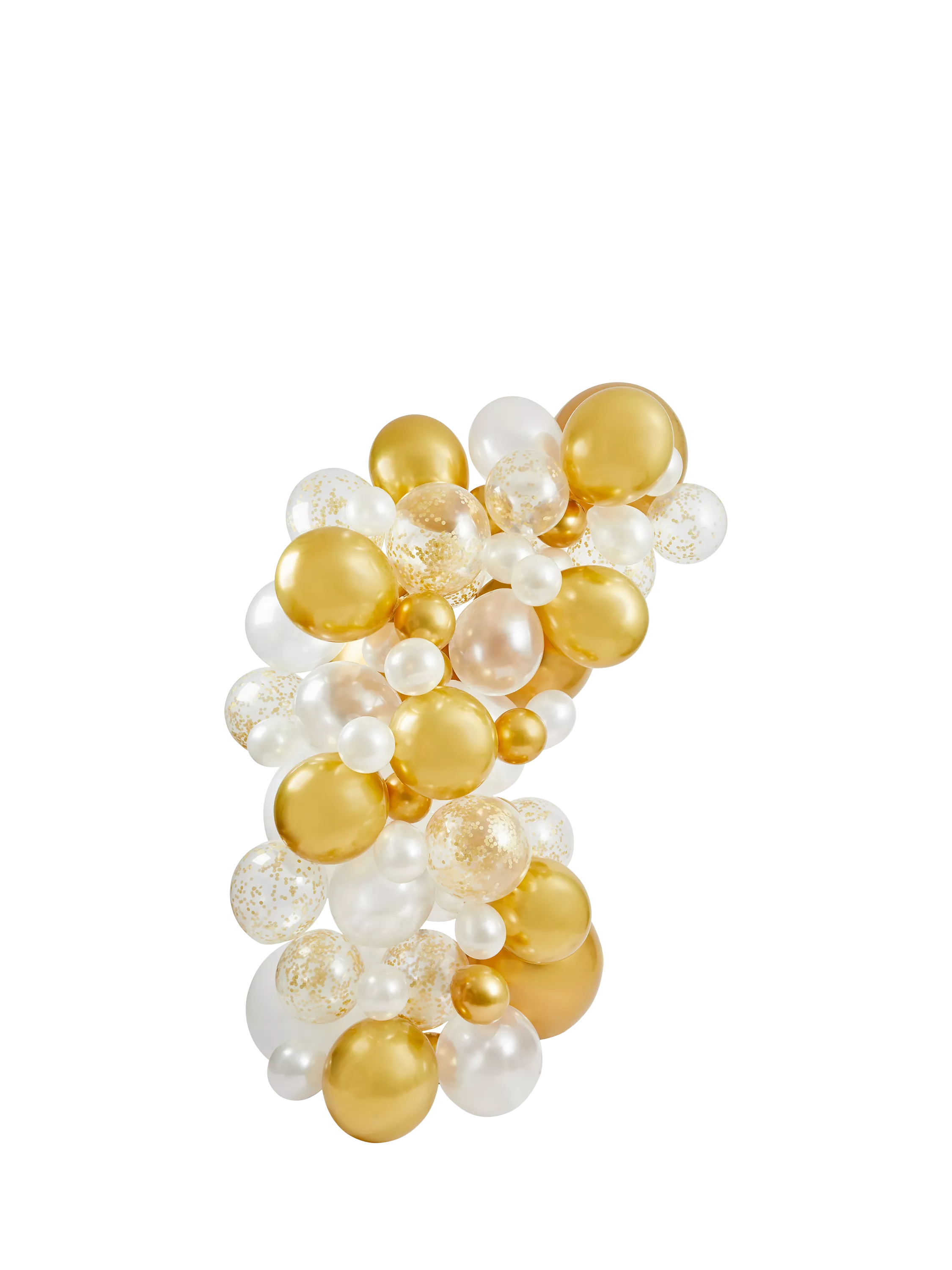 Pack contains 64x latex balloons of mixed sizes in white, gold and confetti-filled, balloon tape and glue dots.