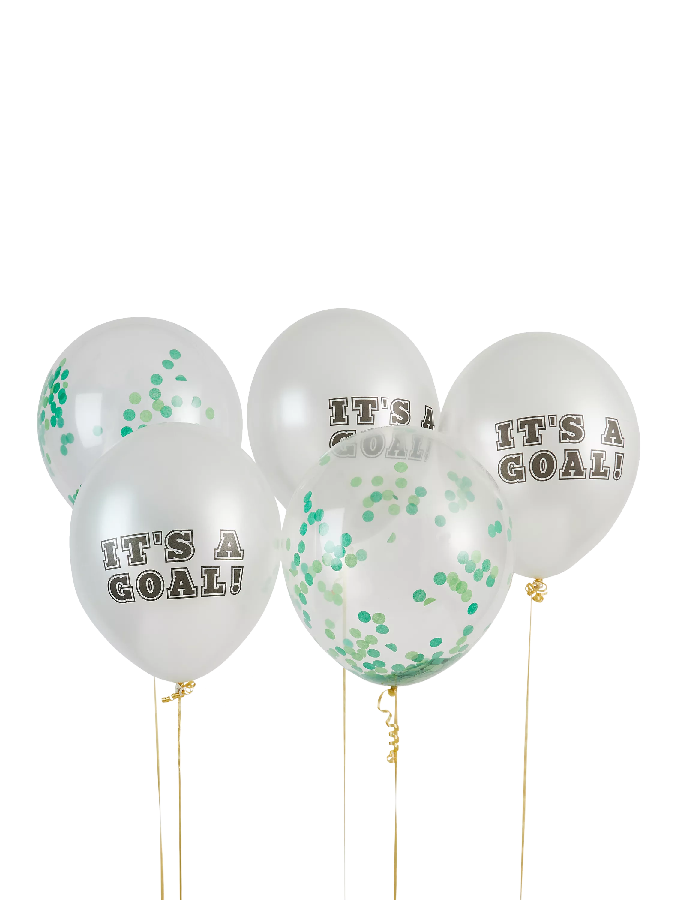 Kick off the celebrations with these "It's a goal!" balloons by Hootyballoo.