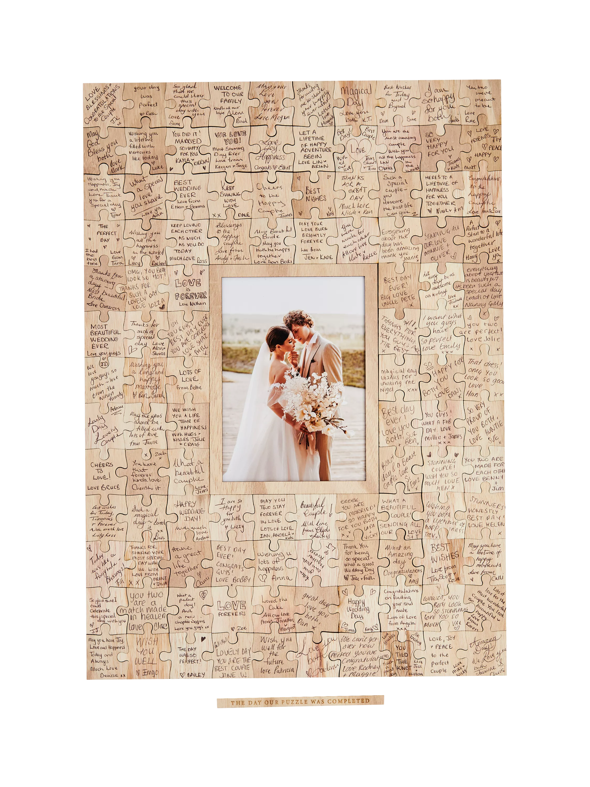 Involve your guests in your special day with a memorable jigsaw frame. Simply put the signed puzzle pieces together and insert a photo from your wedding day in the centre.