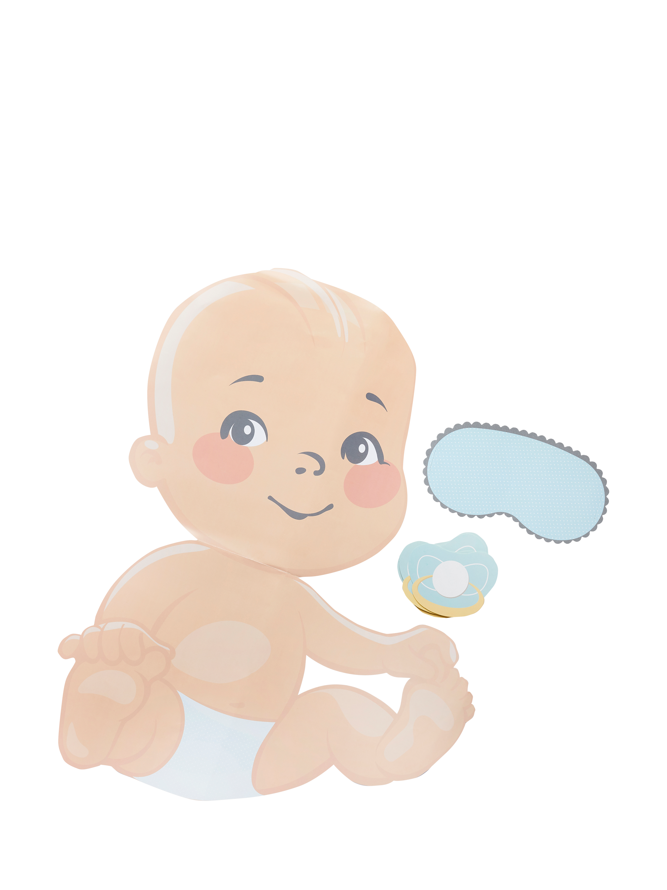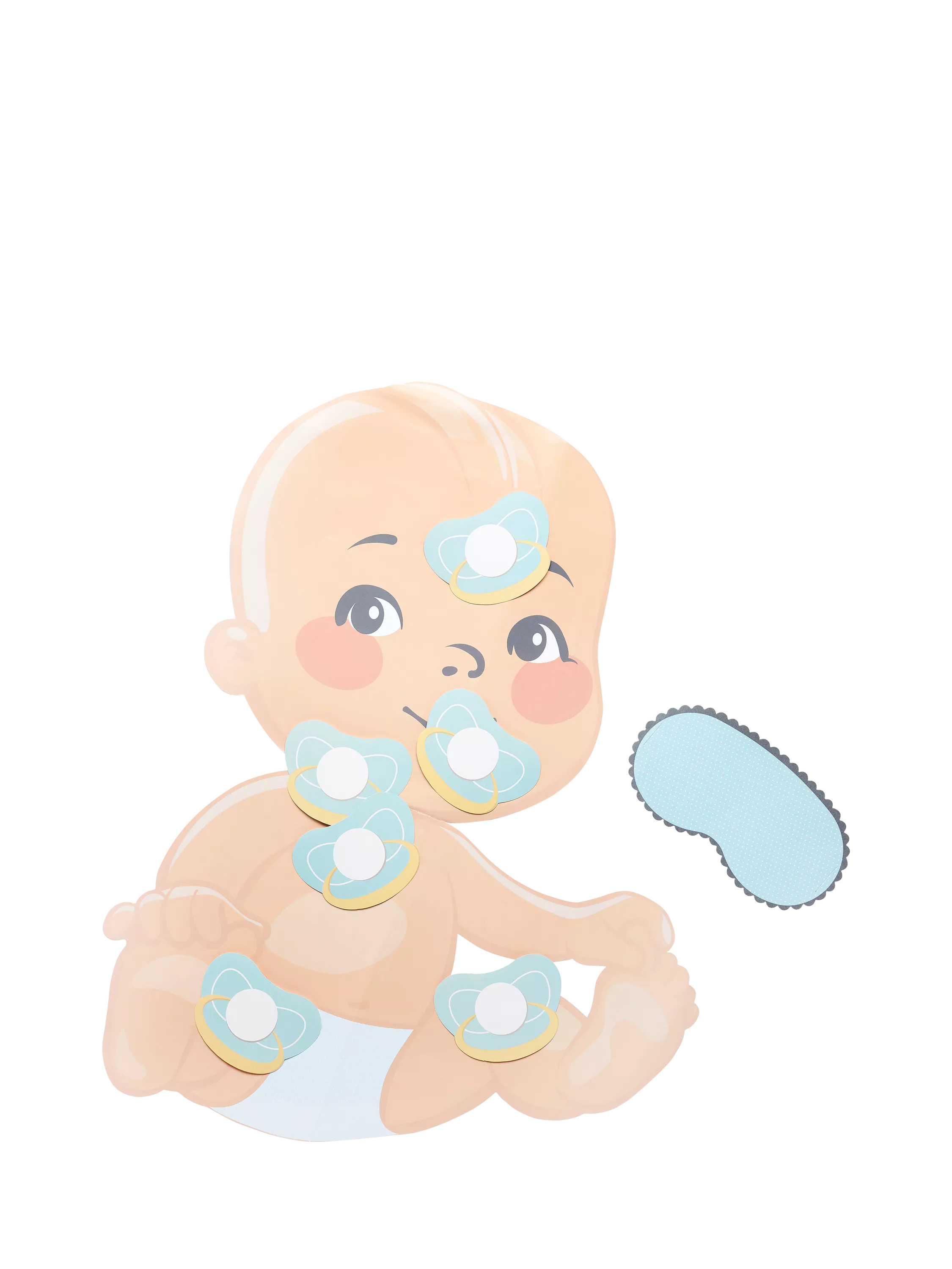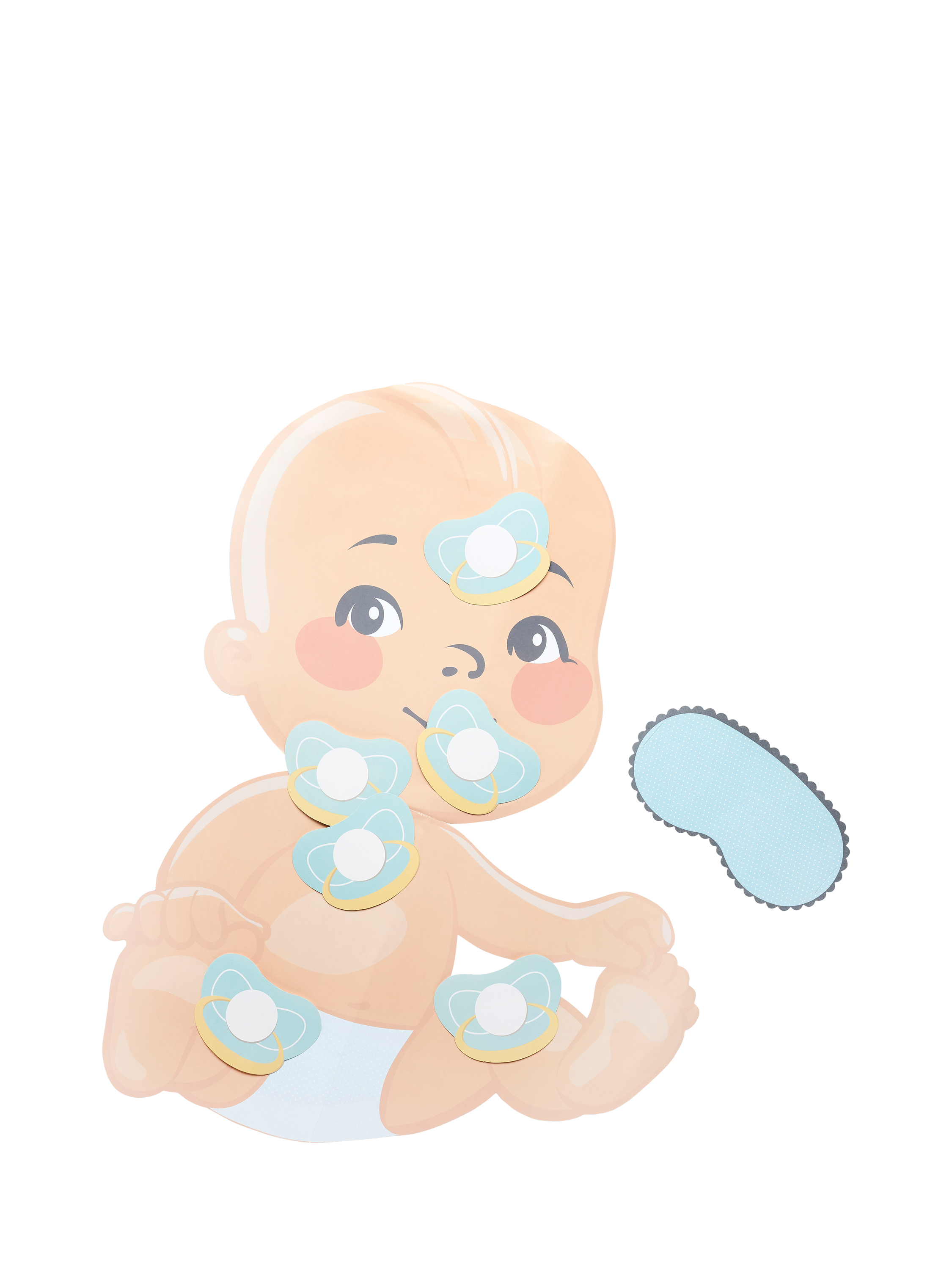 Pack contains x1 baby, x1 blindfold mask and x12 dummies to stick.