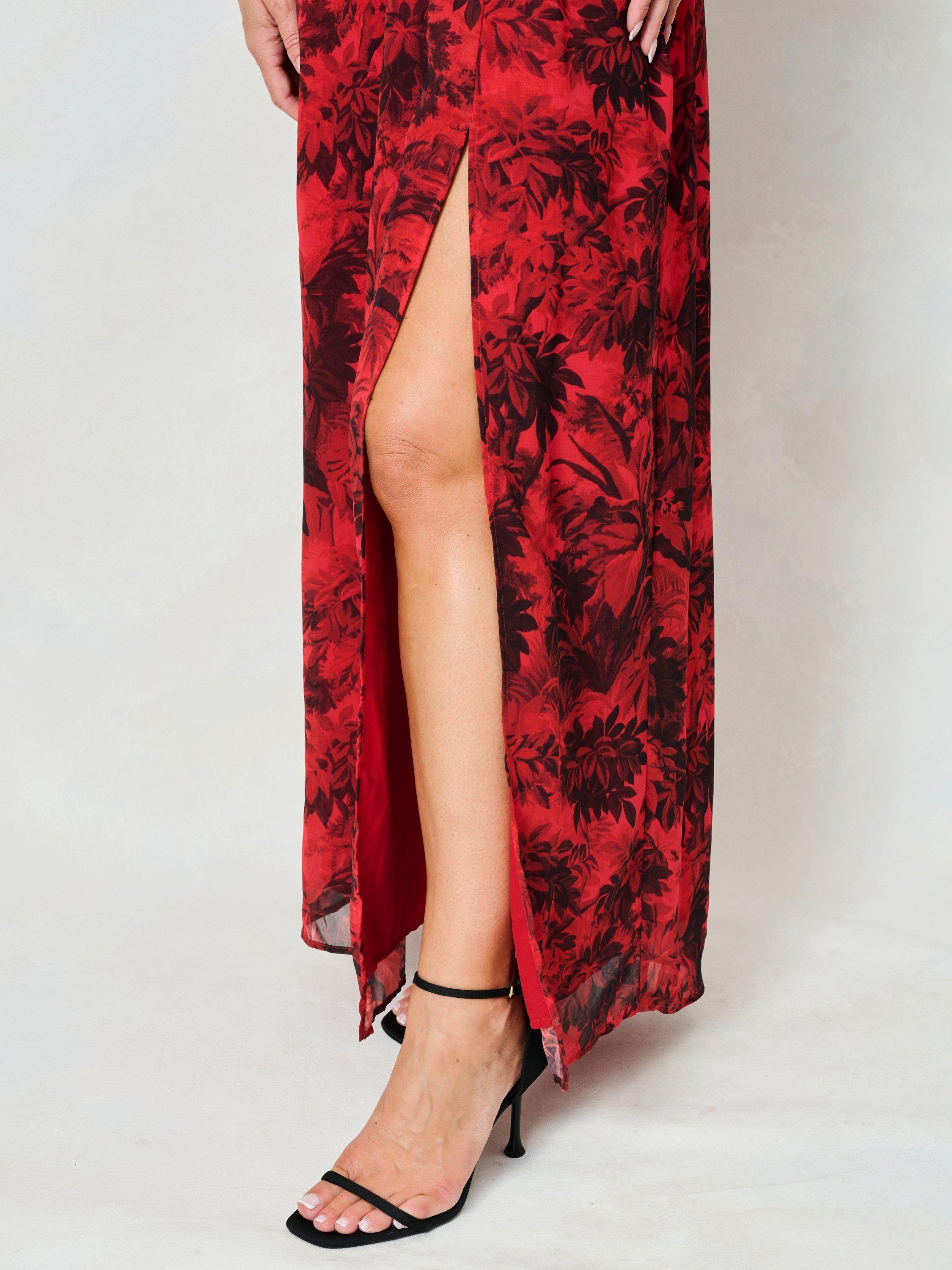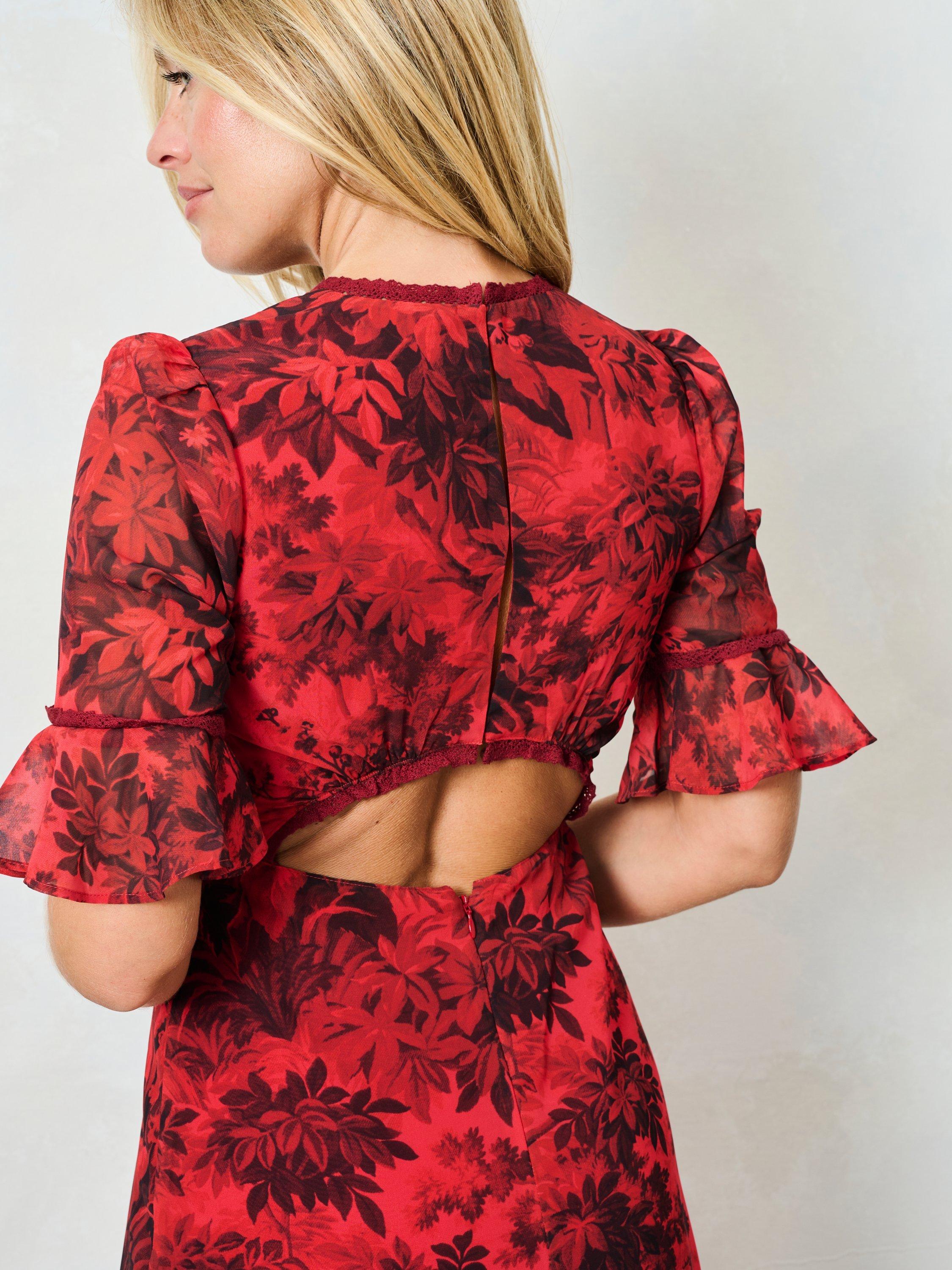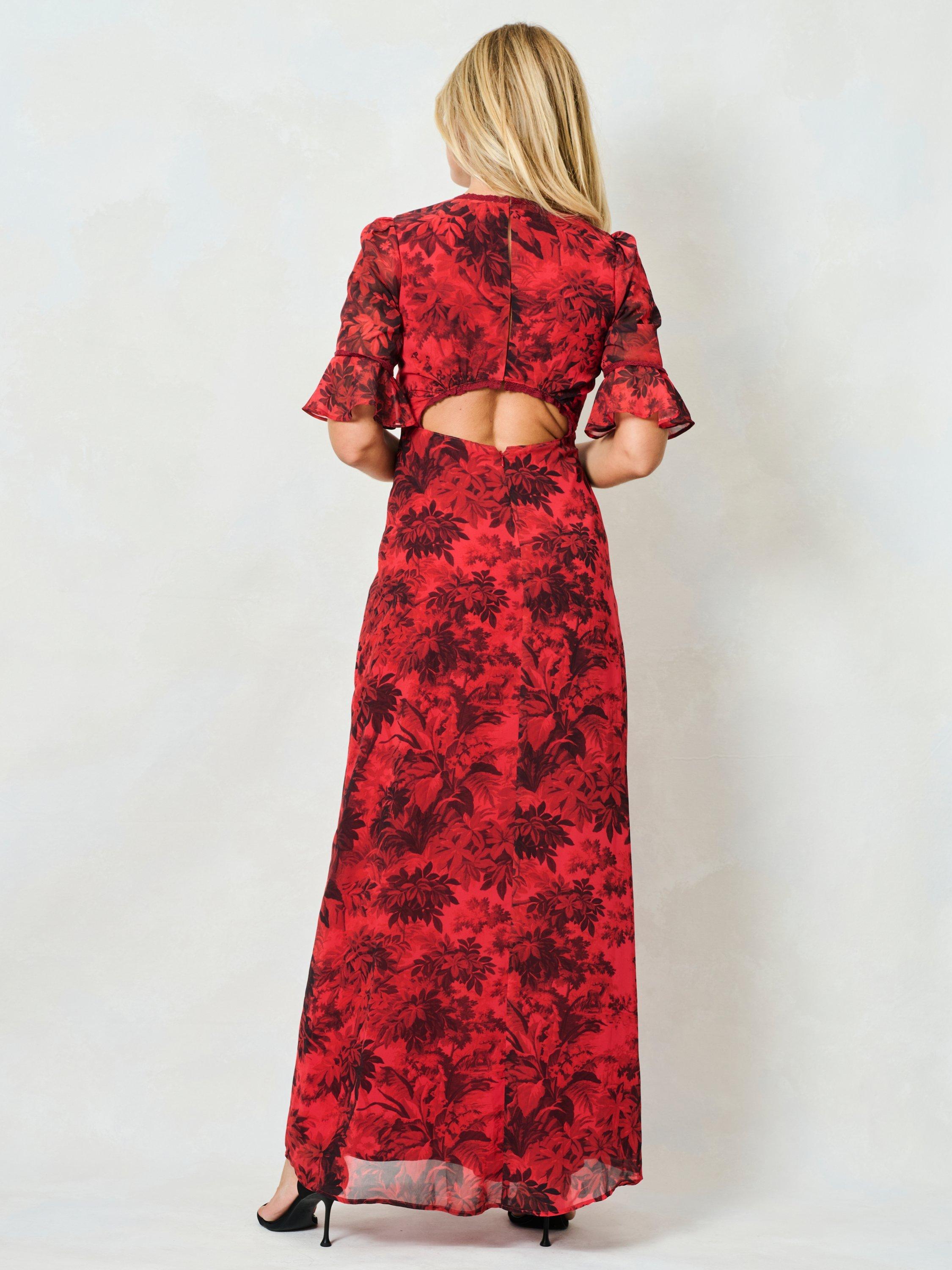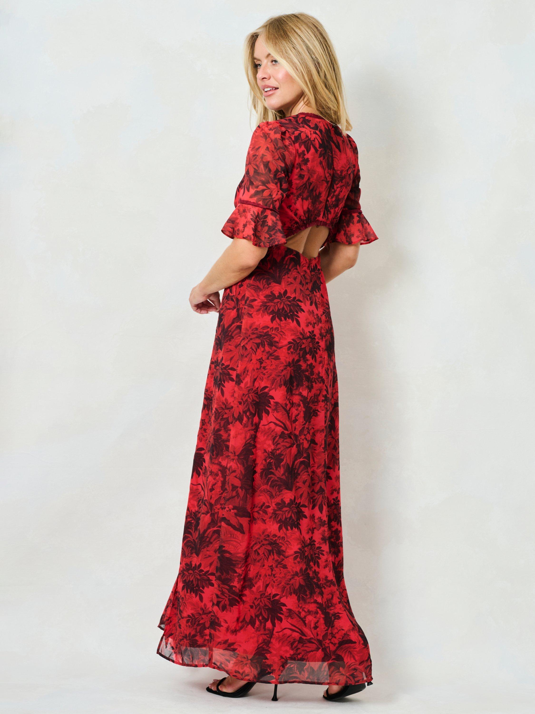 Hand-stylised in Hope & Ivy's East London studio, this gorgeous red dress depicts soft blooms and foliage across its rich red base, with elevated trims at the elbow, bust and v-neckline. With a cutout at the lower back, she offers both comfort and style in abundance, making her the perfect wedding guest outfit this season.